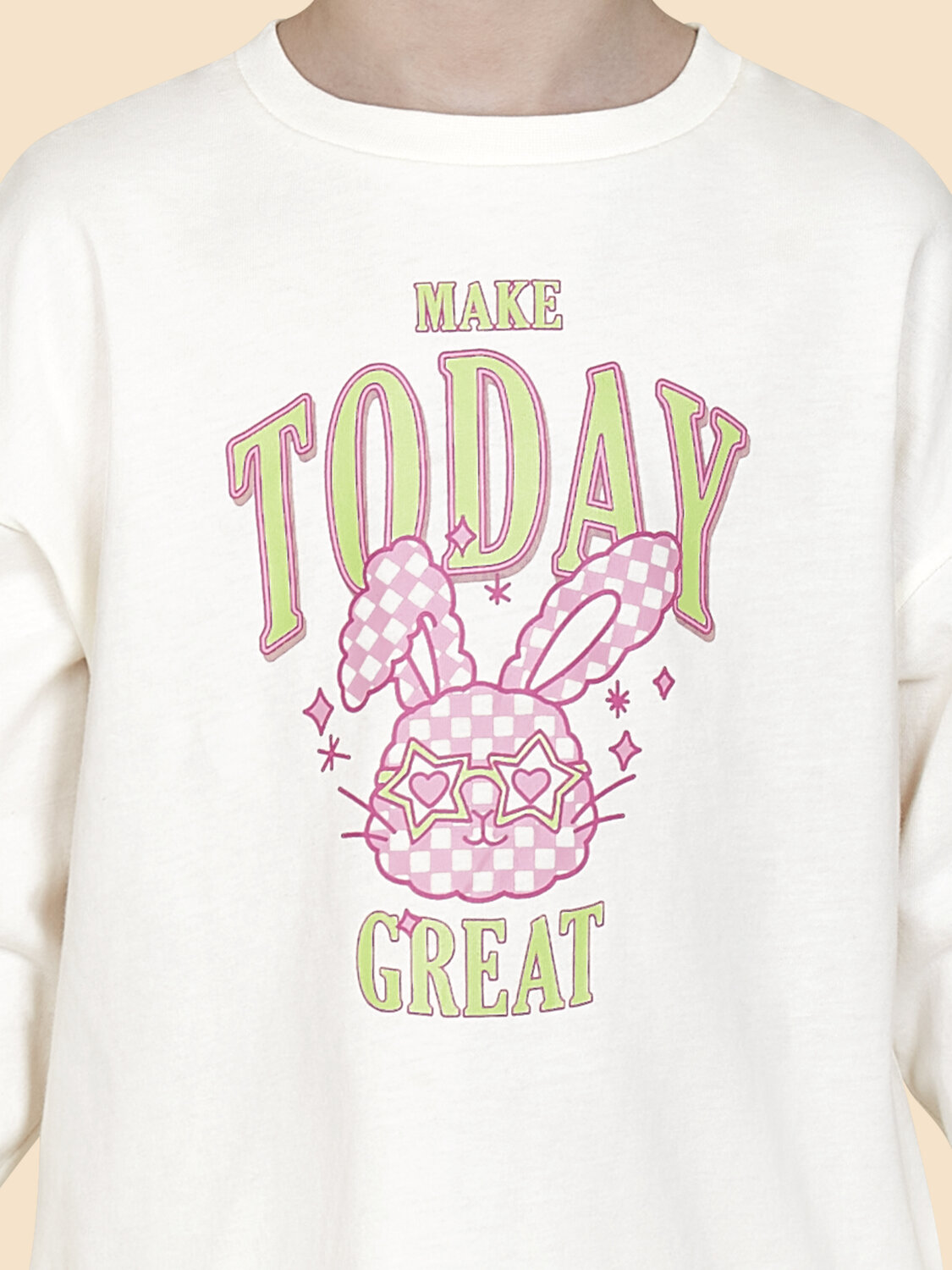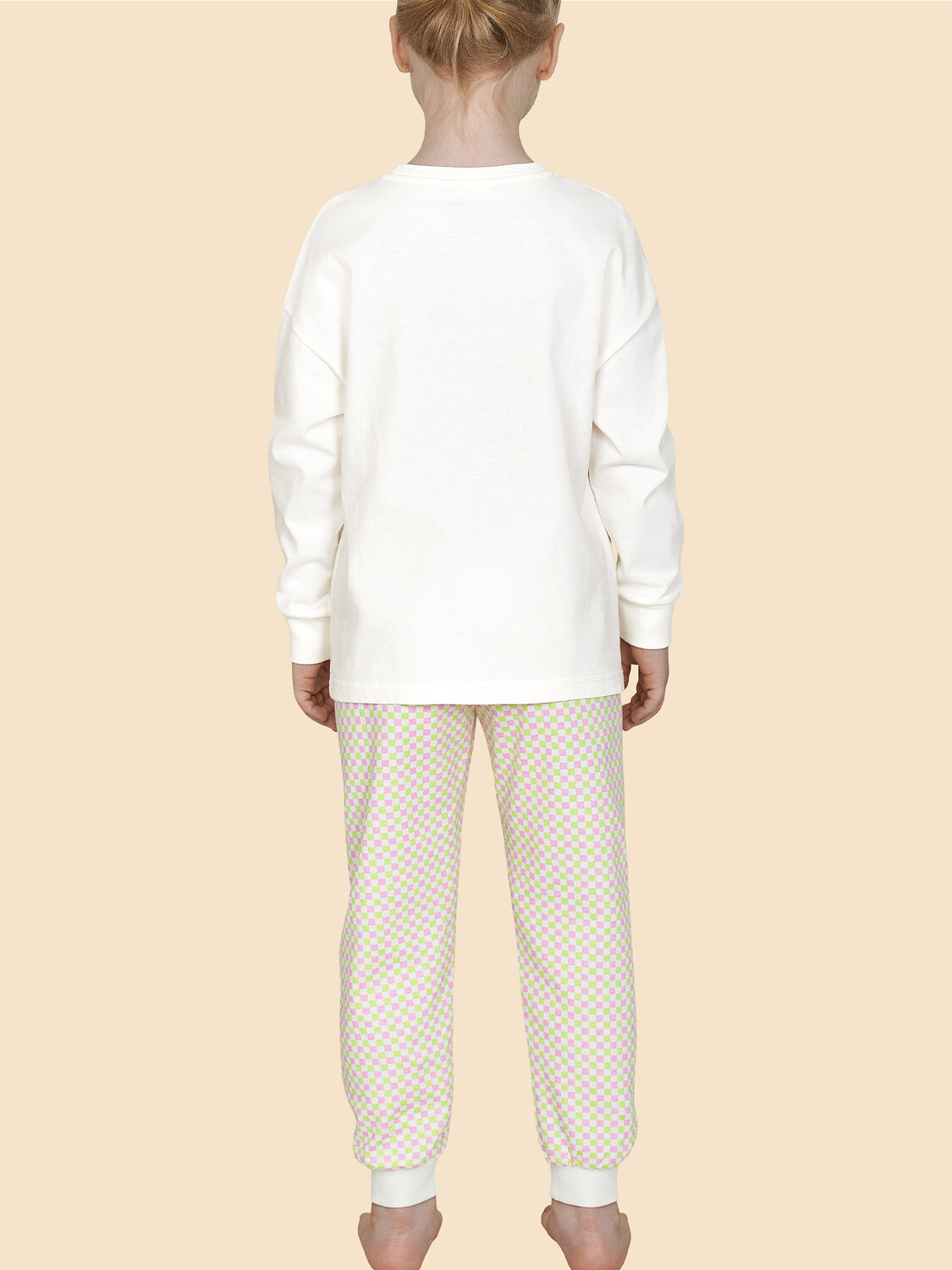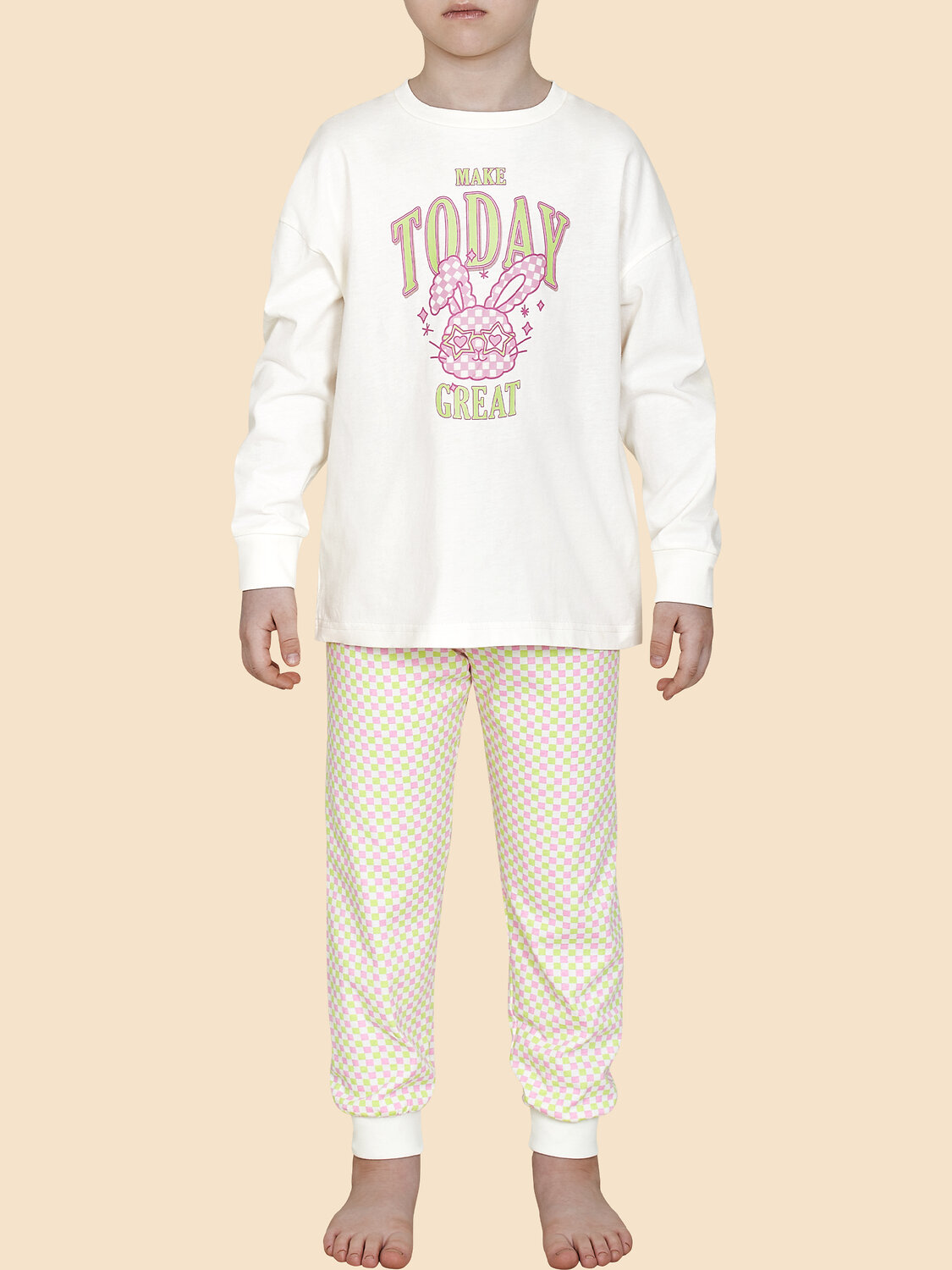 Детская пижама для девочки. Модель выполнена из 100% хлопка — идеальный вариант для детской пижамы. Комплект для сна мягкий, гипоаллергенный и хорошо пропускает воздух. В хлопковой пижаме ребёнку будет тепло, даже если он раскроется во время сна. Всё это способствует комфортному и качественному сну. Джемпер и брюки умеренного объёма, плечо немного спущено, рукава широкие и свободные — в пижаме очень удобно спать. В поясе брюк мягкая и широкая резинка — не перекручивается и не давит. Манжеты и отделка горловины из эластичной рибаны — они не растягиваются, пижаму удобно надевать и снимать. Хлопковая пижама украшена милым принтом в виде зайчика в очках, надпись переводится: «сделай сегодняшний день отличным» — понравится любой девочке. Брюки декорированы сплошным принтом в мелкую клетку. Детская пижама неприхотлива в уходе. Принт эластичный и мягкий, легко переносит частые стирки. Детская пижама с брюками подходит для сна как дома, так и в детском саду — отличный выбор для вашего ребёнка! Помните о правильном уходе за изделием: рекомендуется стирать при температуре не выше 30 °C, без предварительного замачивания, с изнанки. Это поможет сохранить качество и цвет пижамы на длительное время. Не забывайте о выборе правильного размера. Используйте таблицу размеров на фотографии, чтобы выбрать подходящий вариант для вашей девочки. Обратите внимание, что цвет товара на экране вашего устройства может отличаться от реального.