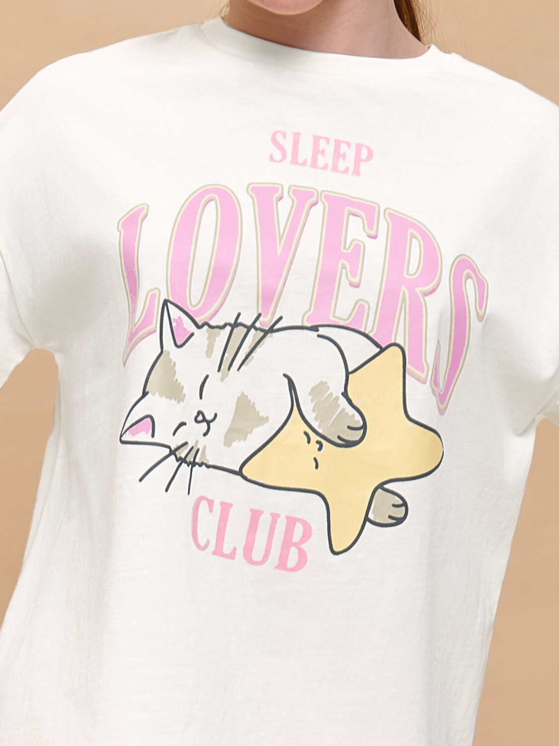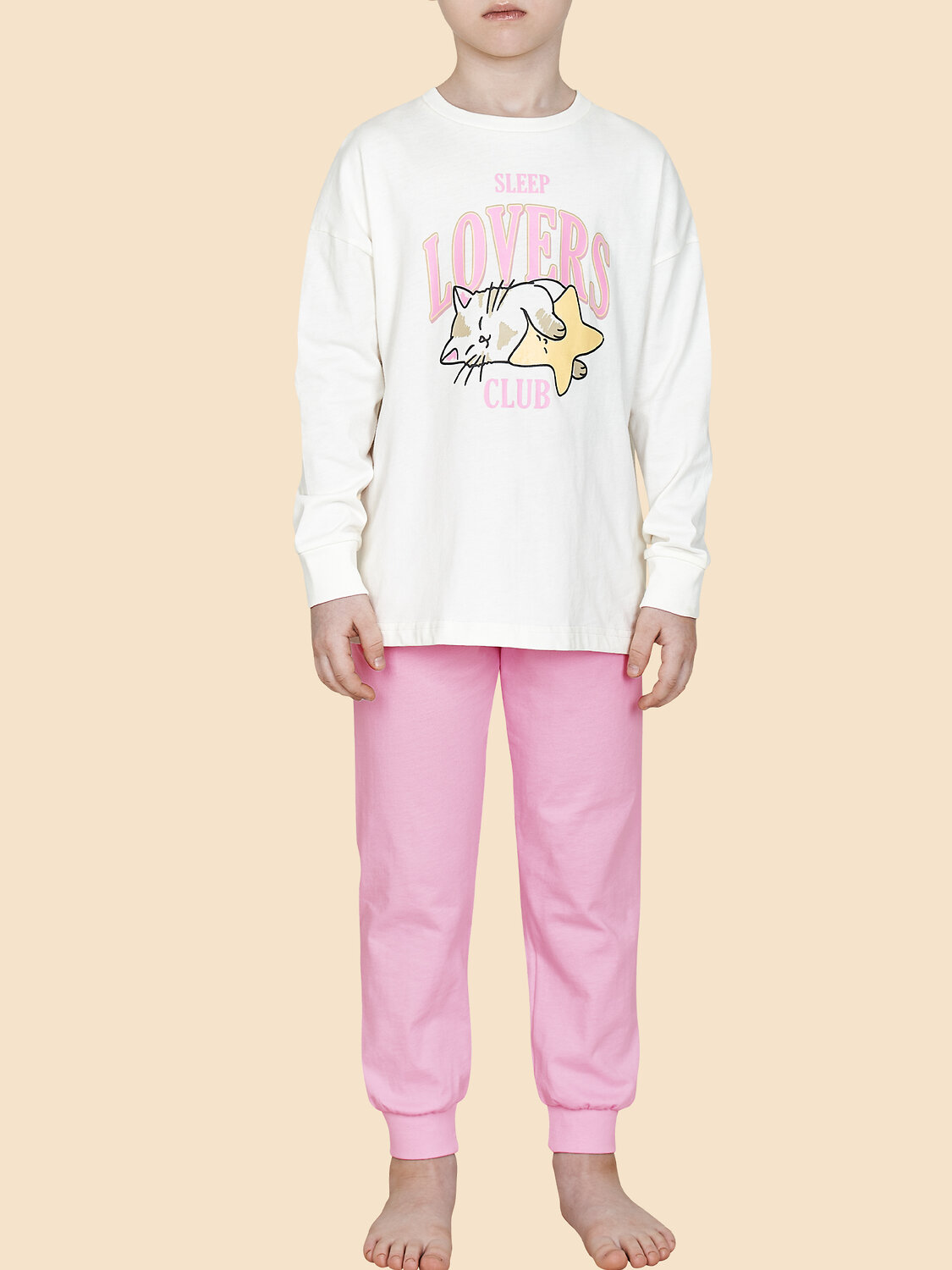 Детская пижама для девочки. Модель выполнена из 100% хлопка — идеальный вариант для детской пижамы. Комплект для сна мягкий, гипоаллергенный и хорошо пропускает воздух. В хлопковой пижаме ребёнку будет тепло, даже если он раскроется во время сна. Всё это способствует комфортному и качественному сну. Джемпер и брюки умеренного объёма, плечо немного спущено, рукава широкие и свободные — в пижаме очень удобно спать. В поясе брюк мягкая и широкая резинка — не перекручивается и не давит. Манжеты и отделка горловины из эластичной рибаны — они не растягиваются, пижаму удобно надевать и снимать. Хлопковая пижама украшена милым принтом в виде спящего котика, надпись переводится: «клуб любителей поспать» — понравится любой девочке. Детская пижама неприхотлива в уходе. Принт эластичный и мягкий, легко переносит частые стирки. Детская пижама с брюками подходит для сна как дома, так и в детском саду — отличный выбор для вашего ребёнка! Помните о правильном уходе за изделием: рекомендуется стирать при температуре не выше 30 °C, без предварительного замачивания, с изнанки. Это поможет сохранить качество и цвет пижамы на длительное время. Не забывайте о выборе правильного размера. Используйте таблицу размеров на фотографии, чтобы выбрать подходящий вариант для вашей девочки. Обратите внимание, что цвет товара на экране вашего устройства может отличаться от реального.