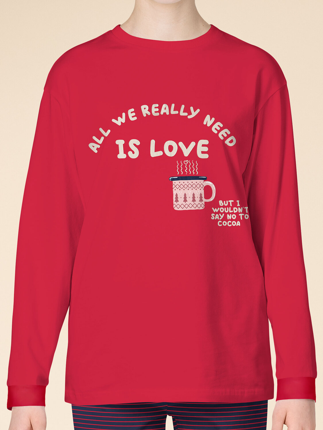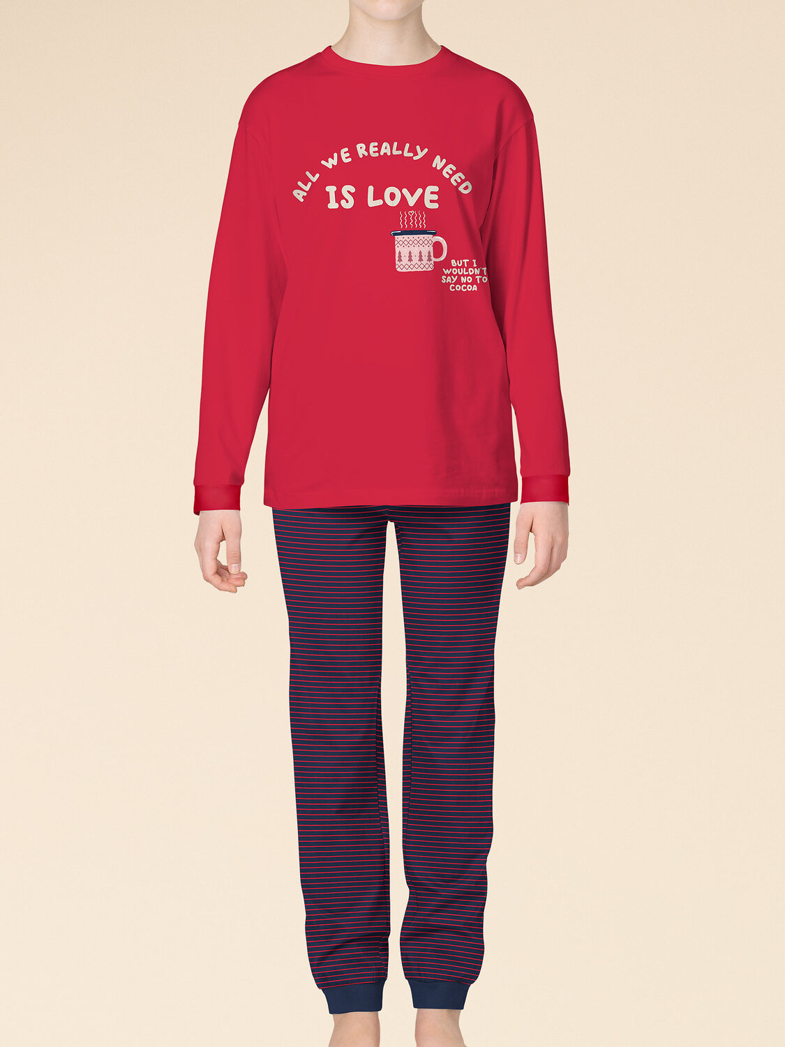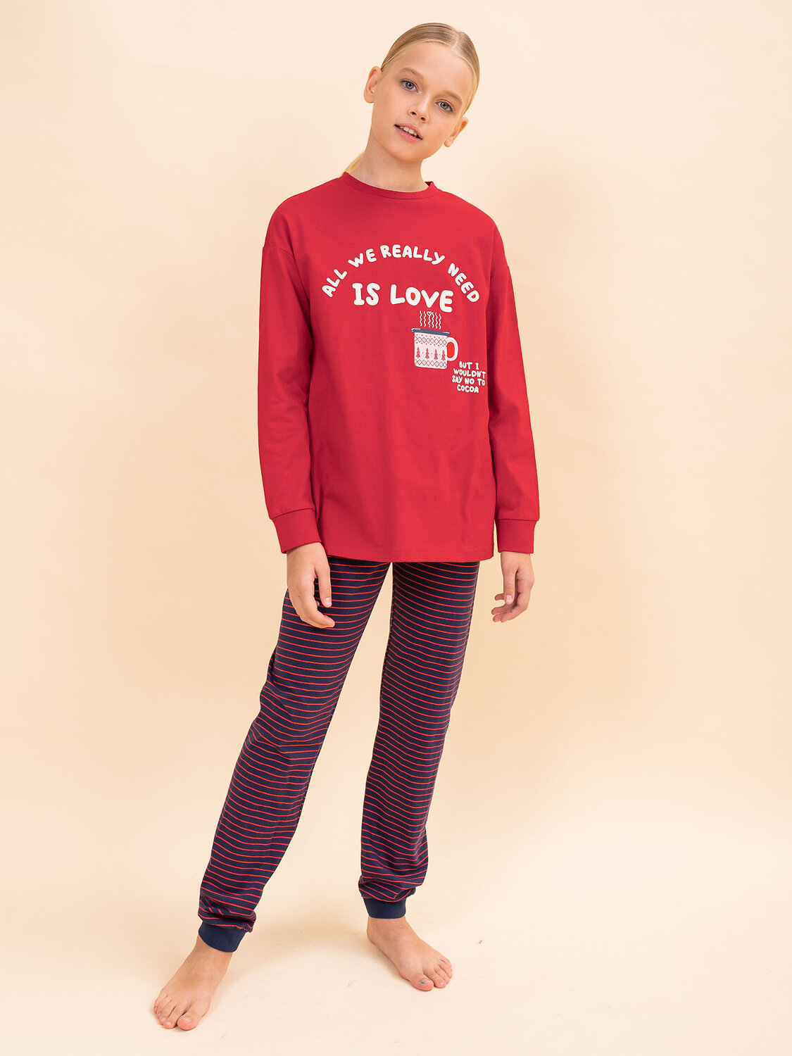 Детская пижама – уютный комплект бренда Pelican, состоящий из лонгслива и брюк. Комфортный сон очень важен для роста и восстановления организма ребенка, поэтому пижама ребенку должна обеспечивать максимальный комфорт и защиту. Пижама для девочки бренда Pelican создана из натурального хлопка, сохраняет тепло, гигроскопична, впитывает влагу. Материал позволяет коже ребенка дышать, мягкая резинка брюк не стягивает. Изделие после стирки не садится, не растягивается, не линяет. Джемпер с круглым вырезом горловины, спущенным рукавом. Брюки прямые, на резинке. Ровные мягкие швы, отделка по горловине и манжеты на рукавах и по низу брюк придают пижаме для детей лаконичный образ, модное исполнение и нарядность. Широкая размерная сетка позволяет подобрать оптимальный размер как для малыша, так и подростка. Пижама для девочки теплая и милая, она обязательно понравится ребенку и подарит хорошее настроение дочке или близкому человеку. Модель из зимней коллекции сочетается с носками с рисунком темно-синего цвета. Также может быть использована универсально, как пижама для мальчика. Цвет комплекта детской пижамы для девочки – однотонный красный свитшот с принтом по мотивам уютной зимы и надписью «Allwereallyneedislove. ButIwouldn’tsaynotococoa» (Все, что нам действительно нужно, это любовь. Но я бы не отказался от какао). Брюки пижамы - в мелкую сине-красную полоску. Преподнести подарок ребенку на любой праздник – Новый год, Рождество, день рождения или без повода – приятно и легко. Можно составить оригинальные образы с пижамой для девочки со штанами для детской, семейной фотосессии, если подобрать модели из коллекции Пеликан и порадовать тем самым себя и своих близких.