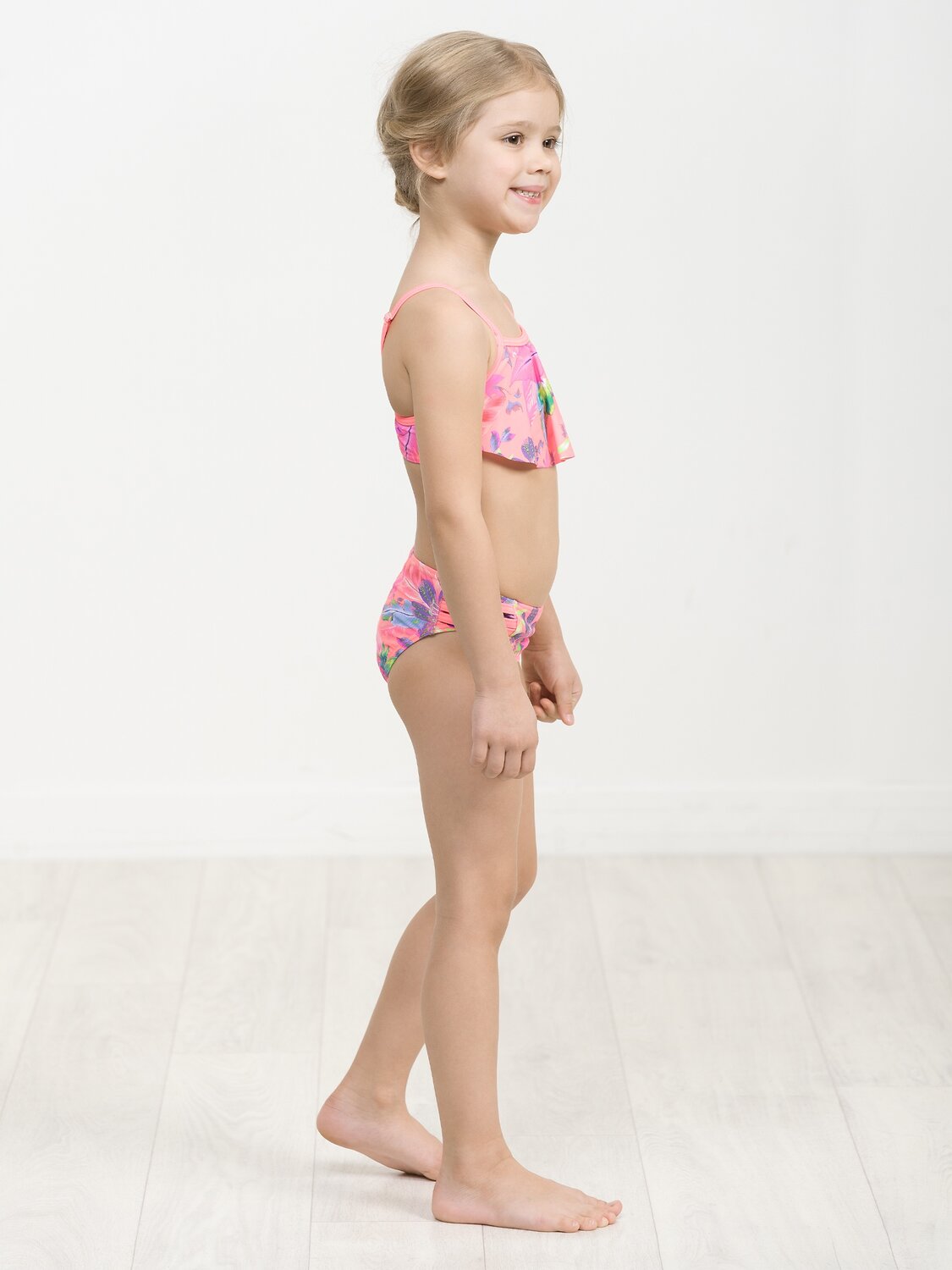 Раздельный купальник для девочек. Верх симметричный топ без регулировки объема, по переду большой волан. Лямки с регулировкой по длине. Перед продублирован подкладкой. Низ трусы с увеличенной высотой посадки. Декор боковые вставки с тремя параллельными полосками. Перед продублирован подкладкой.