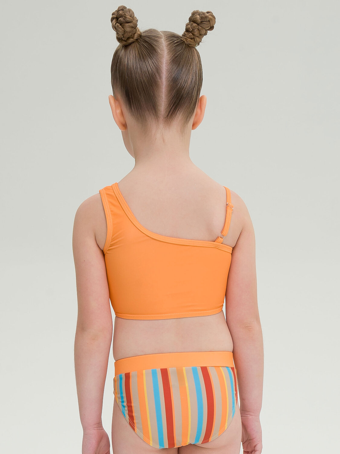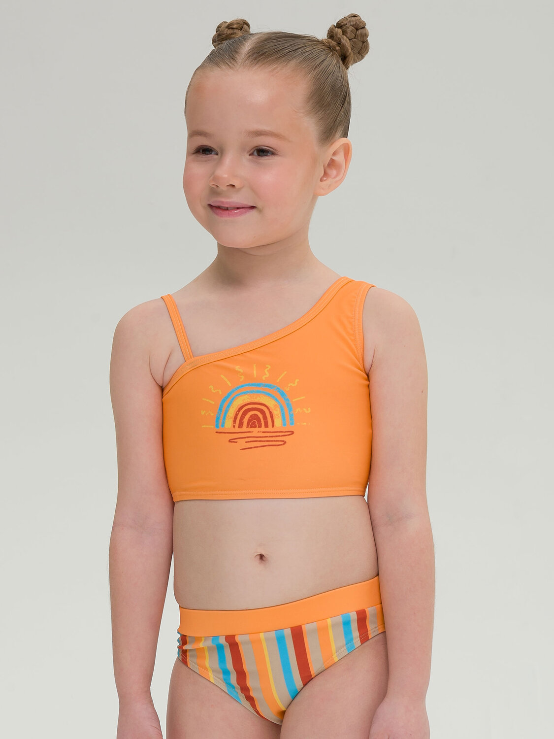 Раздельный купальник для девочки. Удлиненный топ с ассиметричными лямками можно носить с юбкой и шортами. Передняя часть на подкладе - не просвечивает. Трусики с высокой посадкой на подкладе спереди. Широкий контрастный пояс на внутренней резинке - не передавливает, не закатывается. Ткань эластичная, не линяет и не выгорает на солнце.