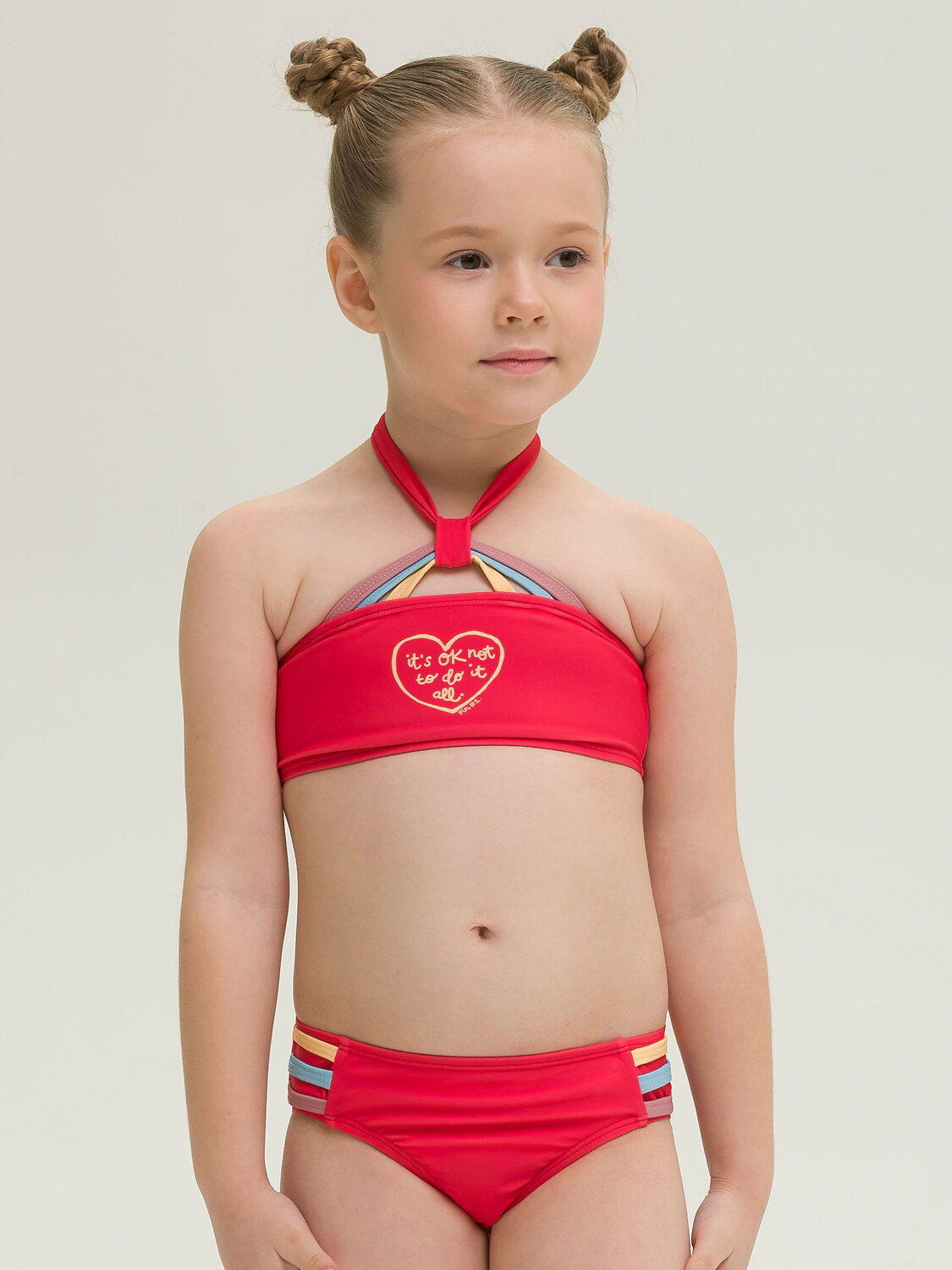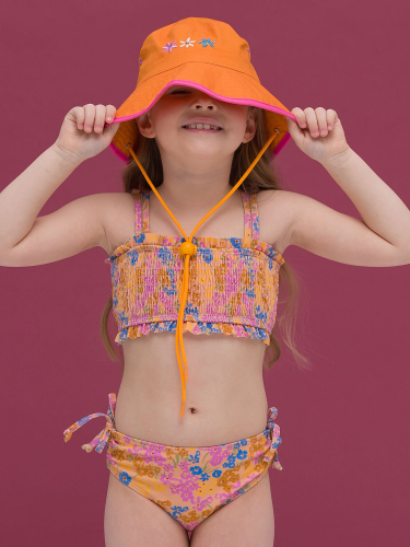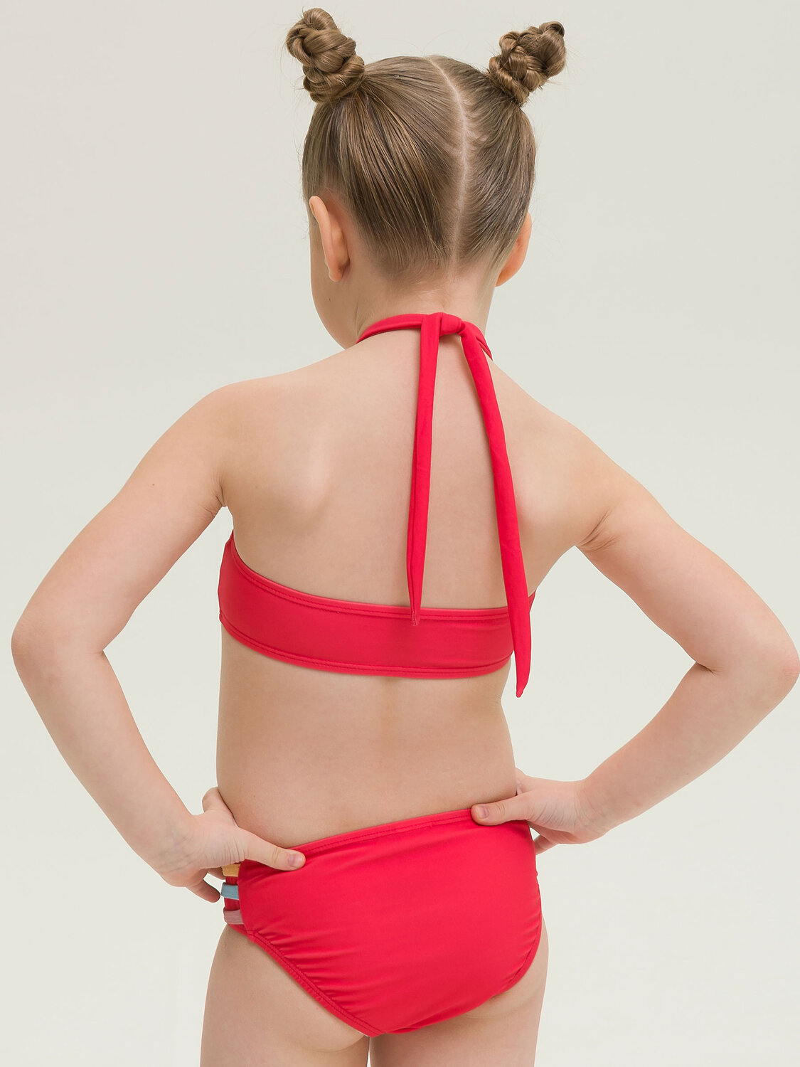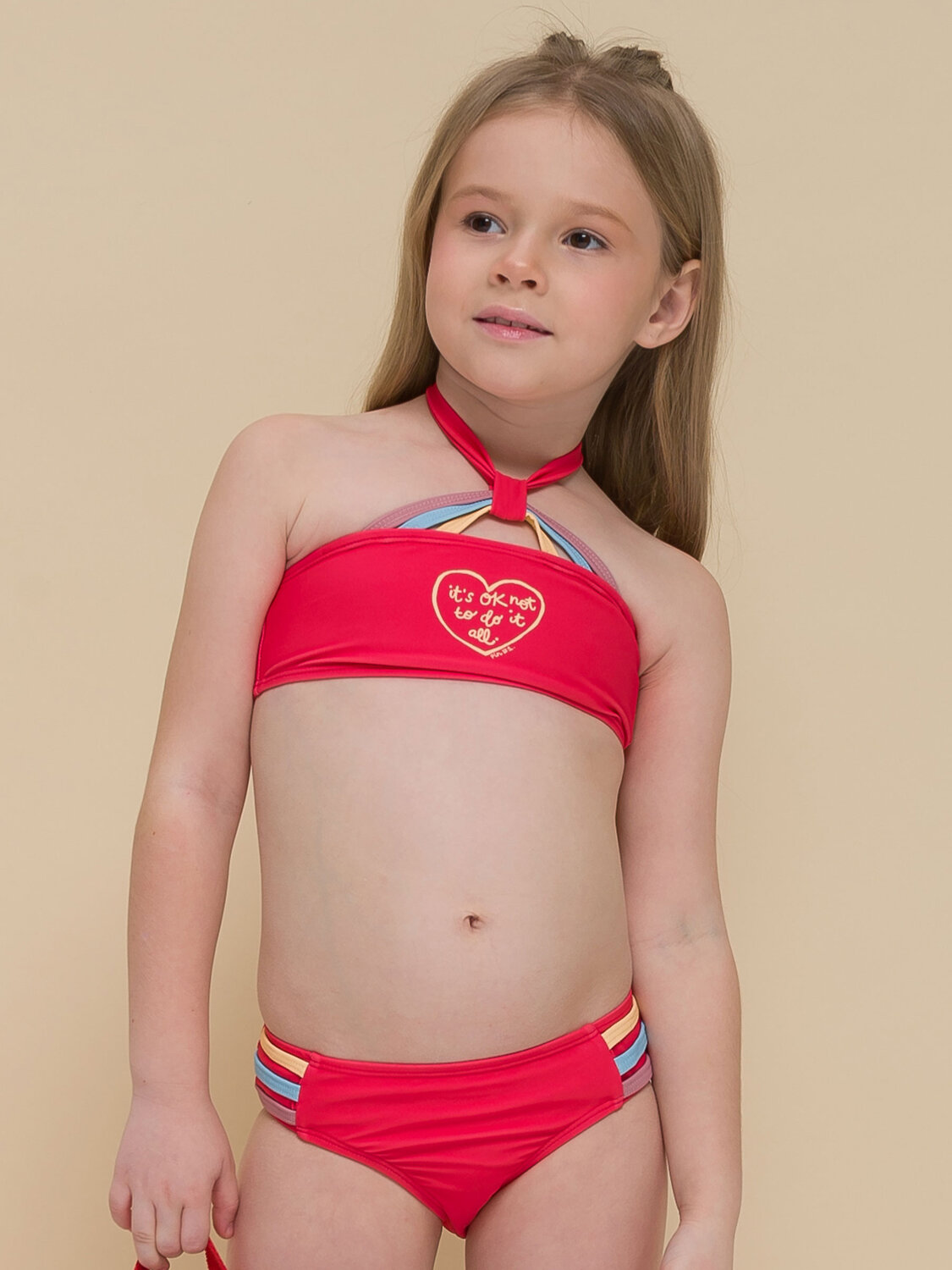 Раздельный купальник для девочек. Топ и трусы купальника декорированы яркими разноцветными пайпингами, что придает изделию солнечное летнее настроение. Перед топа и трусов на подкладе - не просвечивает. Завязка топа широкой лентой позволяет регулировать его по росту девочки. Мягкая эластичная ткань разработана специально для купальных костюмов и идеально садится по фигуре. Быстро сохнет и практически нет выгорания на солнце.