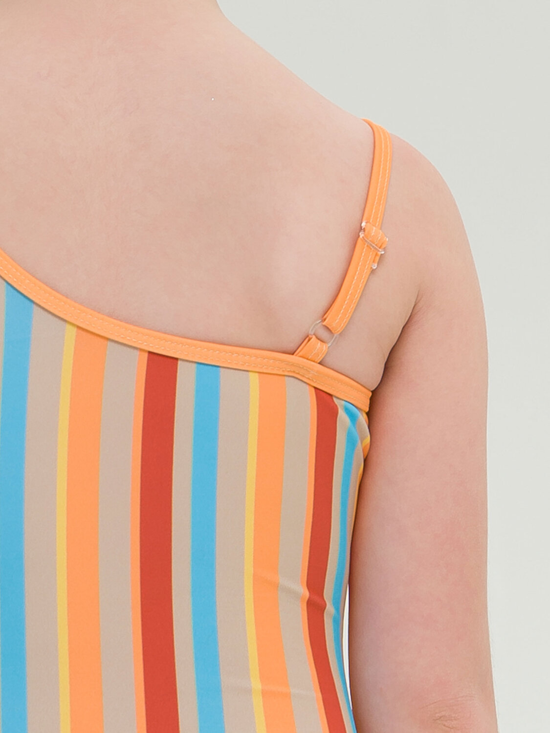 Слитный купальник для девочки. Передняя часть на подкладе, не просвечивает. Ассиметричные лямки - изюминка модели. Узкая лямка регулируется по длине. Ткань быстро сохнет, не выгорает на солнце. Плоские и аккуратно обработанные швы не натирают кожу и не сковывают движения. Идеально вариант для плавания в бассейне и на море.