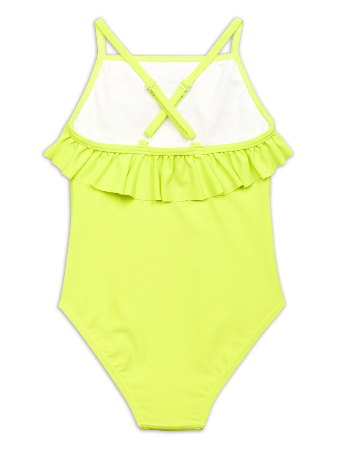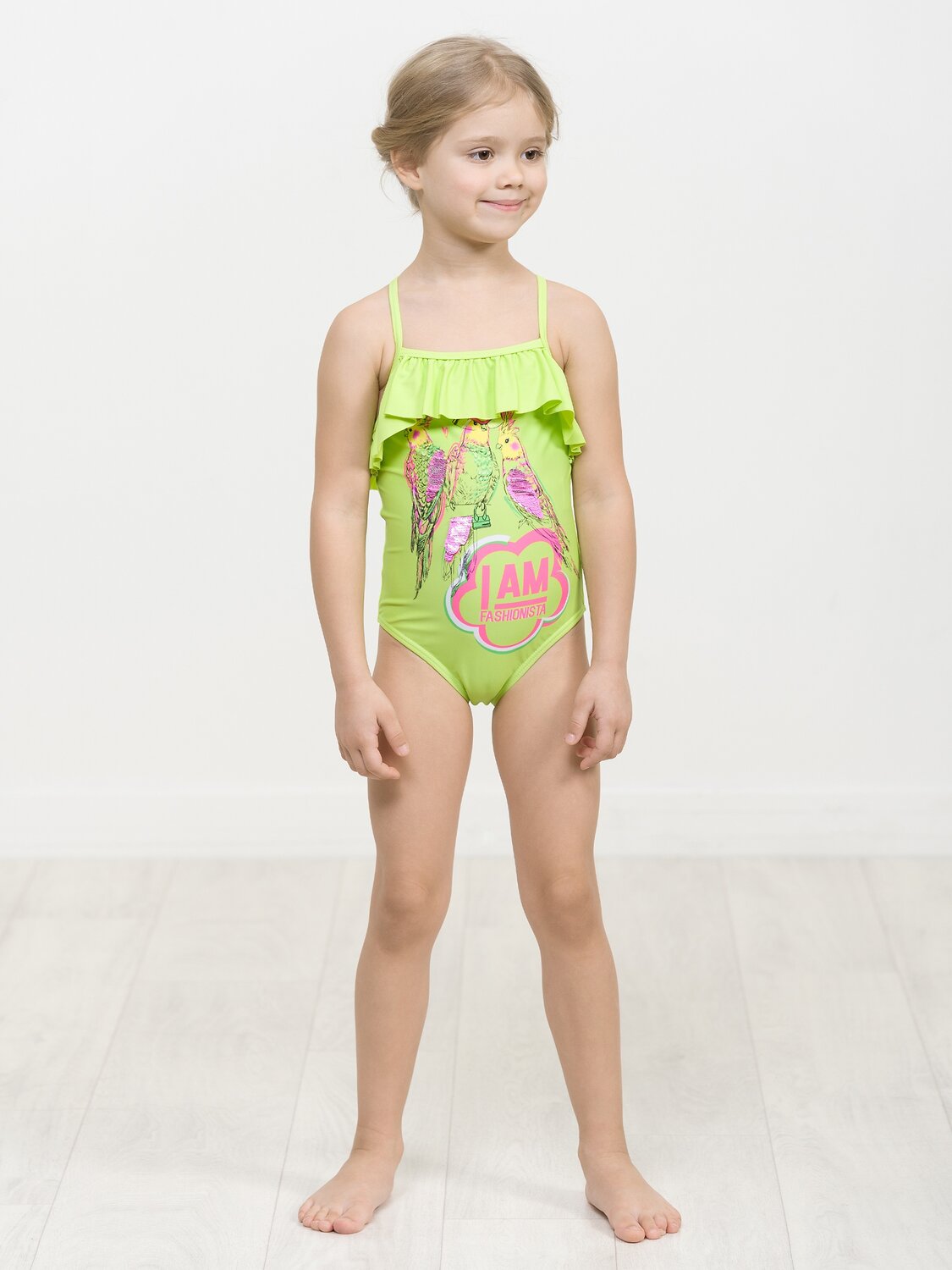 Слитный купальник на тонких лямках с регулировкой по длине. Перед продублирован подкладкой. Эластичный принт попугаи Корелла с сумочкой жакмюс и супертрендовой оправой. Крылья попугаев декорированы розовыми пайетками. Неоновый тестовый принт. Перевод Я модница.