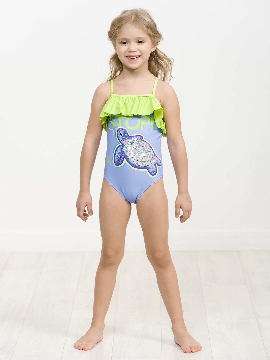 Слитный купальник на тонких лямках с регулировкой по длине. Перед продублирован подкладкой. Перевод принта Стремление вверх, в топ. Панцирь черепахи из двусторонних разноцветных пайеток.