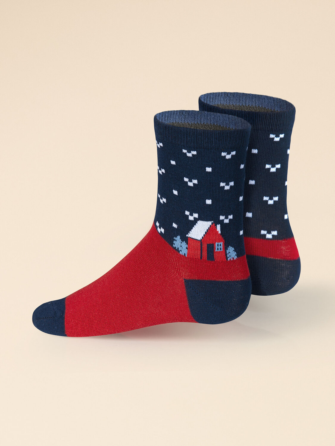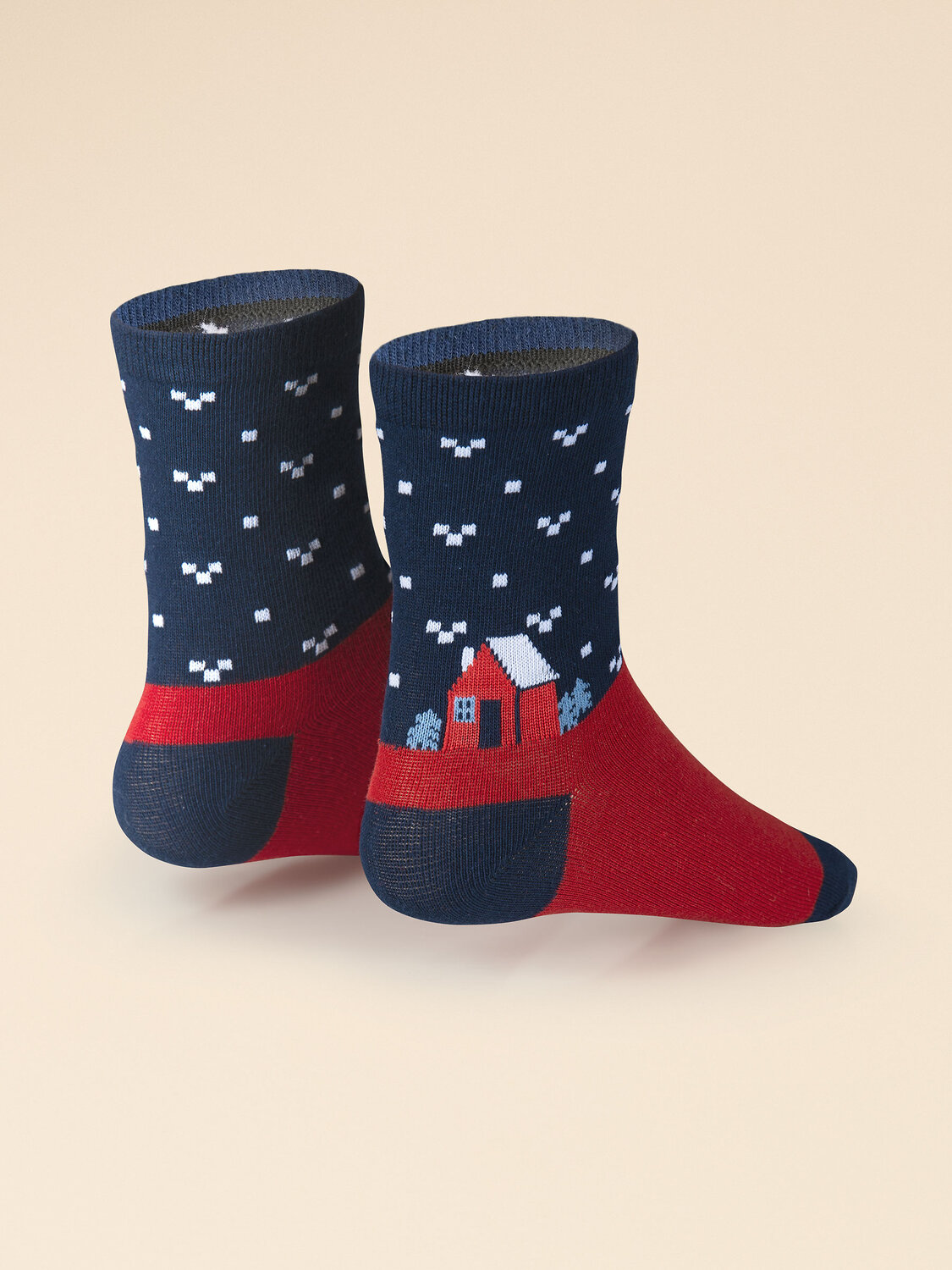 Носки детские с рисунком, набор из 3 штук. Носочки универсальны как для девочек, так и для мальчиков. Носки выполнены из качественного хлопка с добавлением эластана. Ткань пропускает воздух и обеспечивает комфорт для ножек ребенка. Материал прочный, устойчив к пилингу (образованию катышков). При многократной стирке модель не деформируется, не садится, резинка не теряет своих качеств, а пятка остается на месте. Носки для детей облегают ступню. Мягкая, но надежная резинка отлично удерживает носки на месте. Это важно для комфорта ребенка. Такие детские носки не нужно будет постоянно поправлять, а значит не нужно будет отвлекаться от игр. Очень удобно сидят на ноге, это позволит надевать носочки с разной обувью. Носки хорошо тянутся, например, если нужно заправить в них кальсоны или брючины для сохранения тепла. Яркие, милые носочки представлены в оттенках зимы – нежные голубой и молочный, или насыщенные синий и красный. А носки с рисунками – домики, заснеженные горы, снежинки - дополнят образ и станут стильным аксессуаром для уютных семейных фотосессий. Эти носки можно надевать не только в повседневной жизни или дома, но и сочетать их с праздничными нарядами. Набор носков для детей идеально подойдет для подарка ребенку, занятий в детском саду и школе, домашних посиделок и праздников.