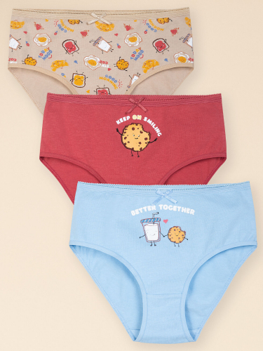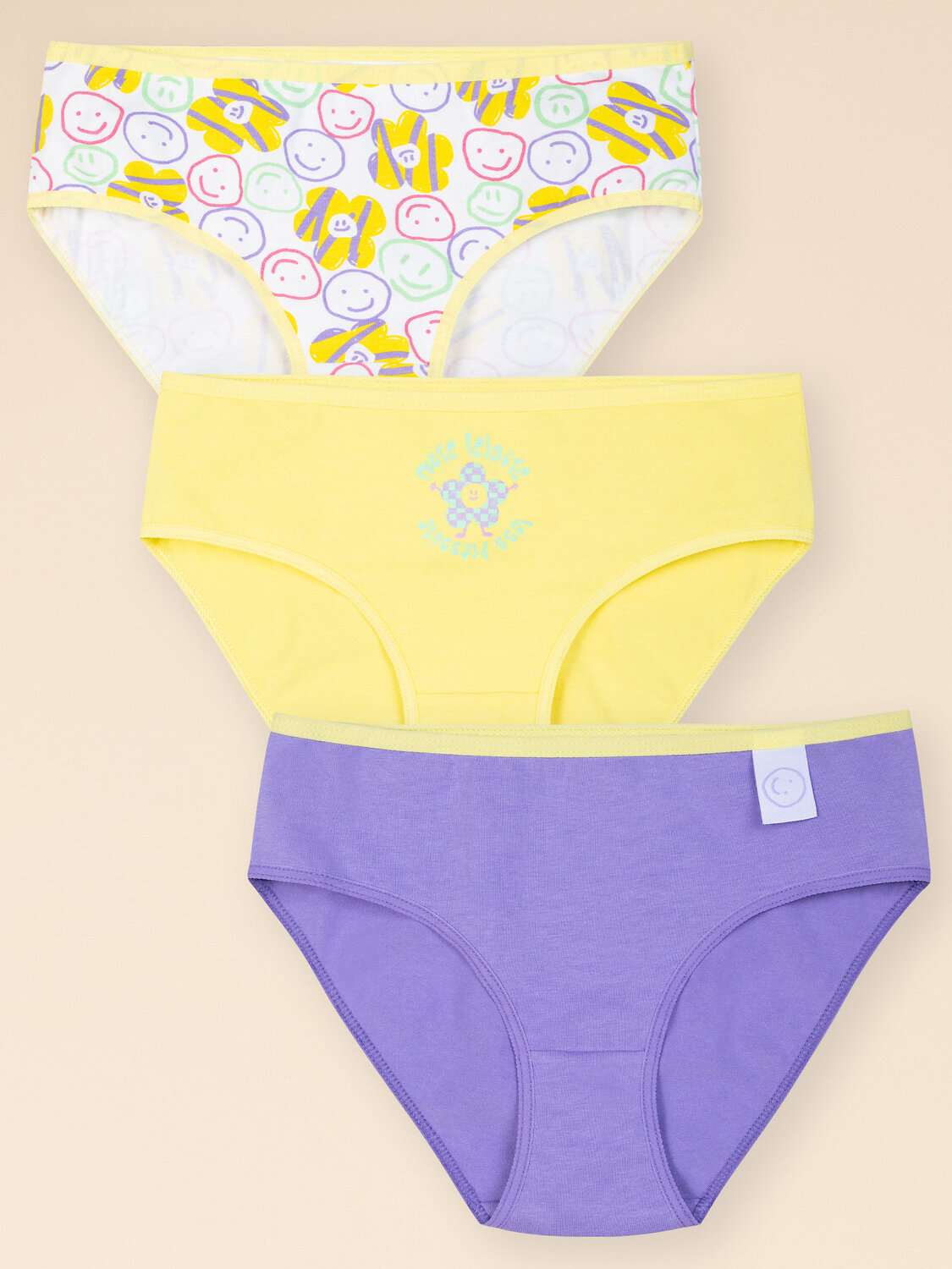Любая мама заботится о комфорте своего ребёнка и хочет выбрать для него только по-настоящему качественное бельё. Наш комплект (3 шт.) слипов средней посадки для девочки прекрасно подходит под эти запросы. Трусы выполнены из ткани, в составе которой преобладает хлопок — они мягкие, отлично пропускают воздух, позволяя коже ребёнка дышать. Благодаря эластану изделие в течение длительного времени сохраняет превосходную форму. Качественный материал и правильный крой обеспечивают идеальную посадку на теле — ребёнок чувствует себя комфортно на протяжении всего дня. Мягкая резинка не давит и не натирает. В комплекте представлены белые трусы, декорированные сплошным принтом в актуальном стиле граффити с позитивным настроением. Сиреневые трусы лаконичного дизайна, дополненные вшивным ярлыком с изображением смайлика. И трусы трендового нежного желтого оттенка, они украшены милым принтом с жизнеутверждающим посылом. Перевод принта: "Больше досуга, меньше давления". Красивые и стильные, слипы наверняка придутся по душе лю
