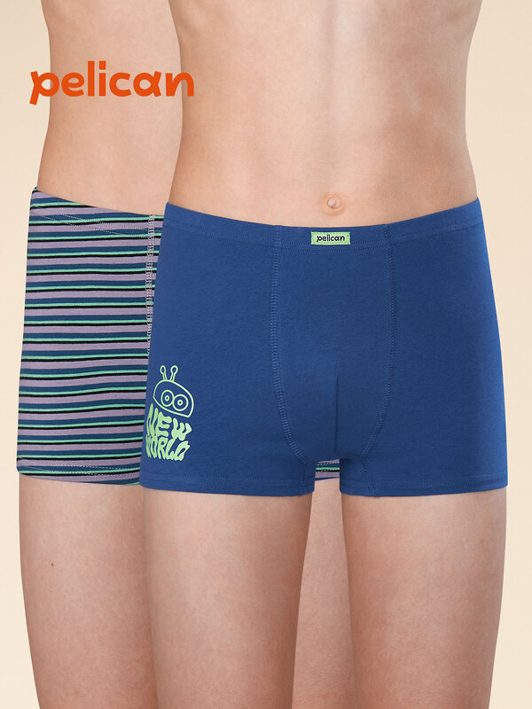 Комплект трусов для мальчика из 2-х шт. Классические трусы боксеры выполнены из ткани с высоким содержанием хлопка — изделие мягкое, гипоаллергенное и отлично пропускает воздух. Эластан обеспечивает эластичность — шорты трусы сохраняют отличную форму в течение долгого времени, даже после многочисленных стирок. Качественная ткань и анатомически правильный крой гарантируют комфортную посадку белья на теле, а мягкая широкая резинка в поясе не давит и не перекручивается. В комплект входят трусы детские для мальчика в двух вариантах расцветки: в серо-синюю полоску и синие с забавным принтом с надписью (перевод: «новый мир»). Принт мягкий и устойчивый, отлично переносит частые стирки. По переду на поясе декоративная нашивка. Хлопковые трусы подходят малышам и мальчикам дошкольного возраста. Помните о правильном уходе за изделием: рекомендуется стирать при температуре не выше 30 °C, без предварительного замачивания, с изнанки. Это поможет сохранить качество и цвет белья на длительное время. Не забывайте о выборе правильного размера. Используйте таблицу размеров на фотографии, чтобы выбрать подходящий вариант для вашего мальчика. Обратите внимание, что цвет товара на экране вашего устройства может отличаться от реального.