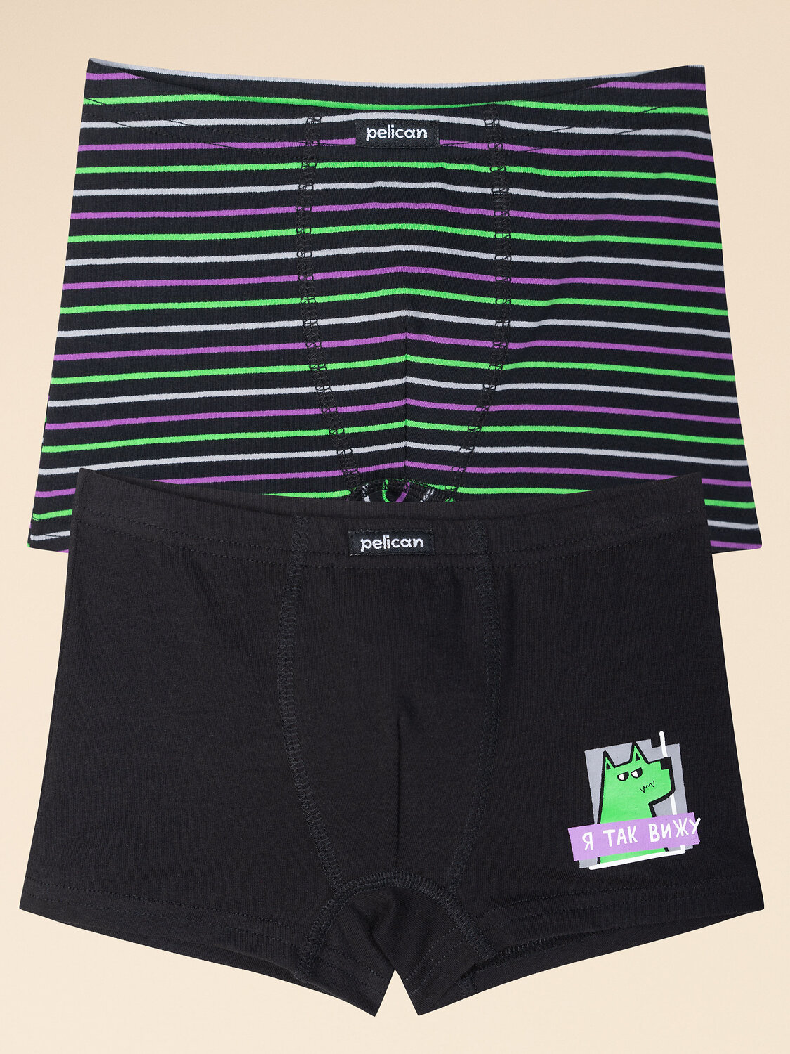 Если вы находитесь в поисках качественного и удобного белья для своего ребёнка, обратите внимание на наш комплект трусов для мальчика (2 шт.). Классические боксеры выполнены из ткани с высоким содержанием хлопка — изделие мягкое, прекрасно пропускает воздух, позволяя коже ребёнка дышать. Эластан обеспечивает эластичность и помогает белью сохранять отличную форму в течение долгого времени, даже после многочисленных стирок. Качественная ткань и анатомически правильный крой гарантируют комфортную посадку белья на теле — ребёнку удобно на протяжении всего дня. В поясе мягкая широкая резинка — не давит и не перекручивается. Трусы детские для мальчика представлены в двух вариантах расцветки: чёрные в фиолетово-зелёную полоску и чёрные с небольшим принтом в виде зелёной собаки и надписи "я так вижу" по переду. На поясе нашивка-лого. Принт мягкий и устойчивый, отлично переносит частые стирки. В линейке представлены хлопковые трусы следующих размеров: 1 (86): 2 (92): 3 (98): 4 (104): 5 (110): 6 (116): 7 (122): 8 (128): 9 (134): 10 (140): 11 (146). Модель подходит малышам, мальчикам дошкольного возраста, младшего школьного возраста и мальчикам-подросткам. Такие шорты трусы идеальны для повседневной носки, спорта и отдыха. Модные трусы — отличный подарок сыну или внуку. Выбирайте нужный размер по таблице размеров на фото. Цвет товара на экране вашего устройства может отличаться от цвета изделия вживую. Товар возврату и обмену не подлежит.