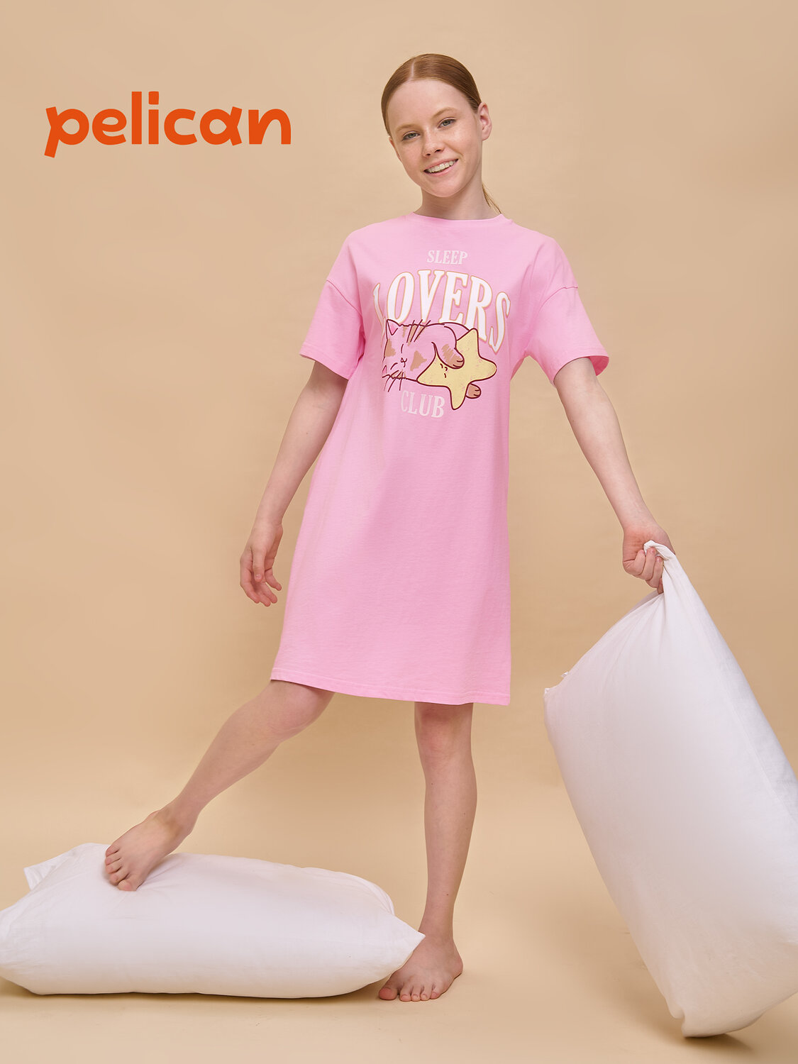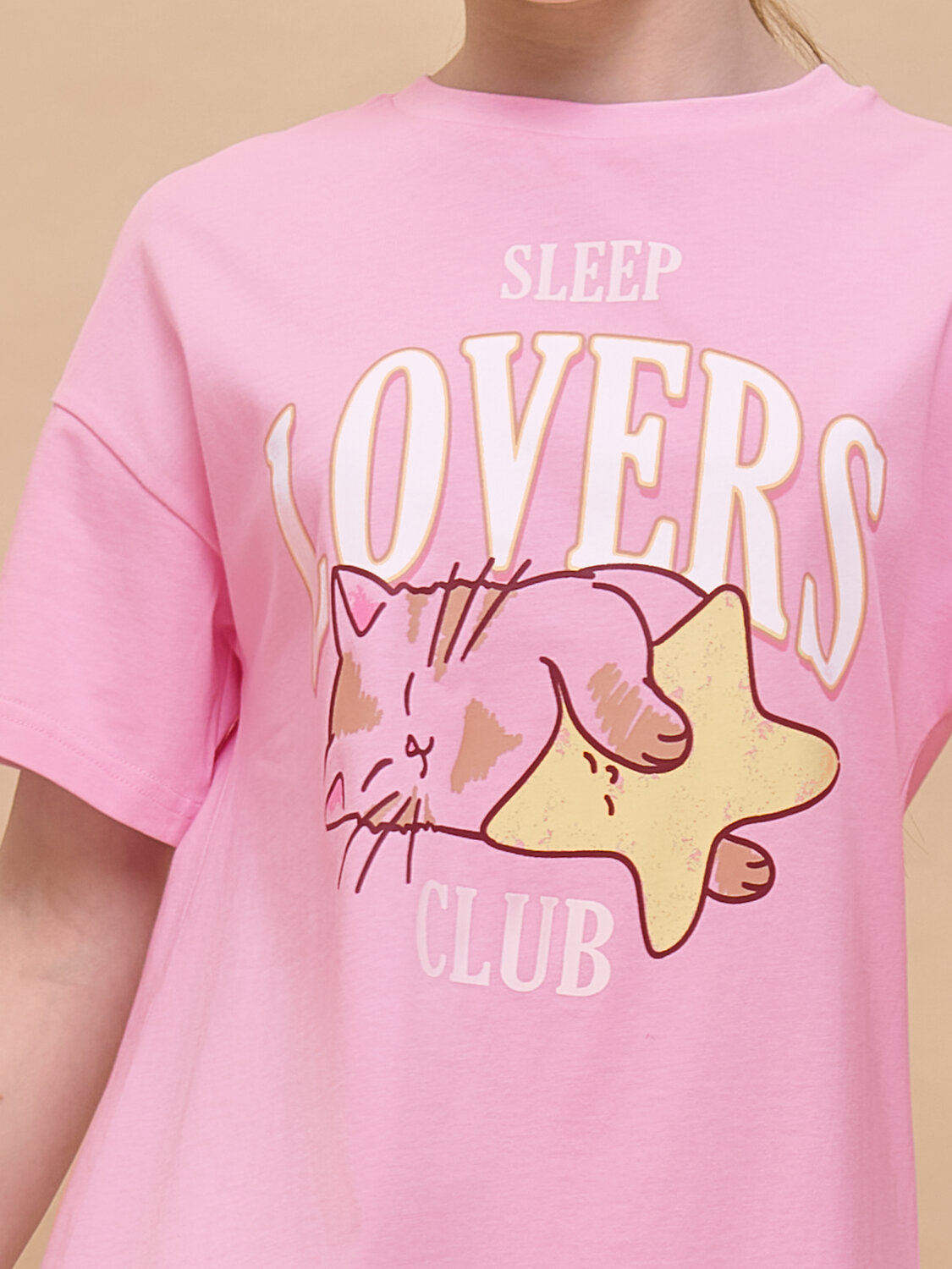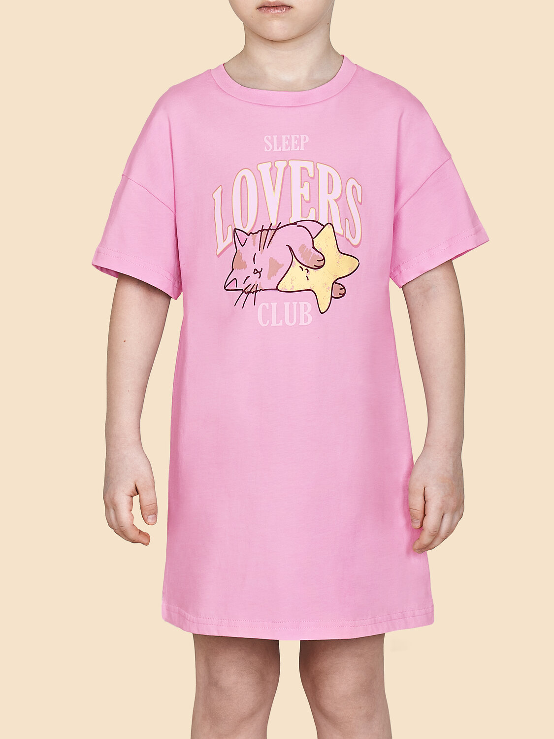 Ночная сорочка для девочки. Модель выполнена из 100% хлопка — оптимальный состав для детской одежды. Ткань изделия мягкая, гипоаллергенная, дышащая. Благодаря этому сон комфортный и качественный. Ночнушка детская удобного прямого кроя — в ней уютно и приятно спать. Горловина отделана эластичной рибаной — сорочку удобно надевать и снимать. А также рибана отлично сохраняет форму в течение долгого времени. Сорочка для девочки украшена милым принтом в виде спящего котика, надпись переводится: «клуб любителей поспать» — понравится любой девочке. Ночное платье неприхотливо в уходе. Принт мягкий и эластичный, прекрасно переносит частые стирки. Такие ночнушки идеальны для сна как дома, так и в детском саду — оптимальный выбор для вашего ребёнка. Помните о правильном уходе за изделием: рекомендуется стирать при температуре не выше 30 °C, без предварительного замачивания, с изнанки. Это поможет сохранить качество и цвет сорочки на длительное время. Не забывайте о выборе правильного размера. Используйте таблицу размеров на фотографии, чтобы выбрать подходящий вариант для вашей девочки. Обратите внимание, что цвет товара на экране вашего устройства может отличаться от реального.