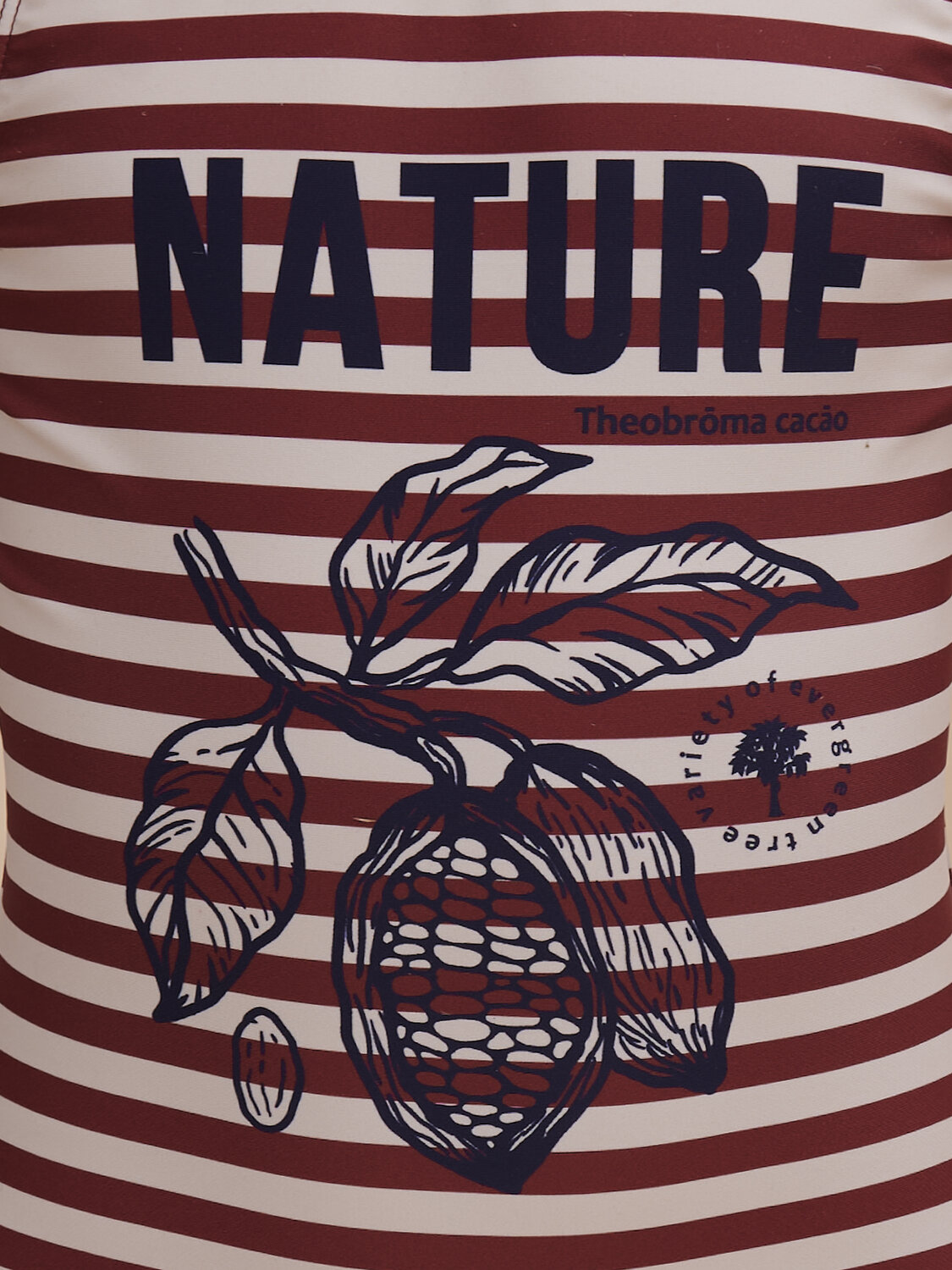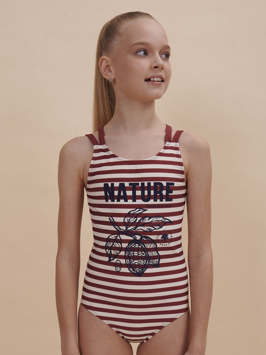 Модный слитный купальник в для девочки. Модель с двумя парами лямок: одни идут прямо, вторые перекрещиваются на спинке. Бретели мягкие. не сползают, исключают трение и раздражение. Передняя часть изделия с подкладкой — не просвечивает. Детский купальник выполнен из полиамида и эластана — он прекрасно тянется, не теряя при этом своей формы, не выгорает и быстро сохнет. По переду модель декорирована красивым принтом в ботаническом стиле. На принте изображены какао-бобы. Надпись переводится:"природа". Принт мягкий и стойкий, не боится частых стирок. Купальник в бордовую горизонтальную полоску — такой узор в стиле тельняшки — один из самых трендовых в этом сезоне. В линейке есть детские купальники следующих размеров: 3 (98): 4-5 (104-110): 6-7 (116-122): 8-9 (128-134): 10-11 (140-146). Купальник красивый подходит для девочек дошкольного, младшего школьного возраста и девочек-подростков. Отличный вариант для летнего отдыха, пляжа, моря и бассейна. Модный купальник — чудесный подарок дочери, внучке или сестре на любой праздник. Выбирайте нужный размер по таблице размеров на фото. Цвет товара на экране вашего устройства может отличаться от цвета изделия вживую. Товар возврату и обмену не подлежит.