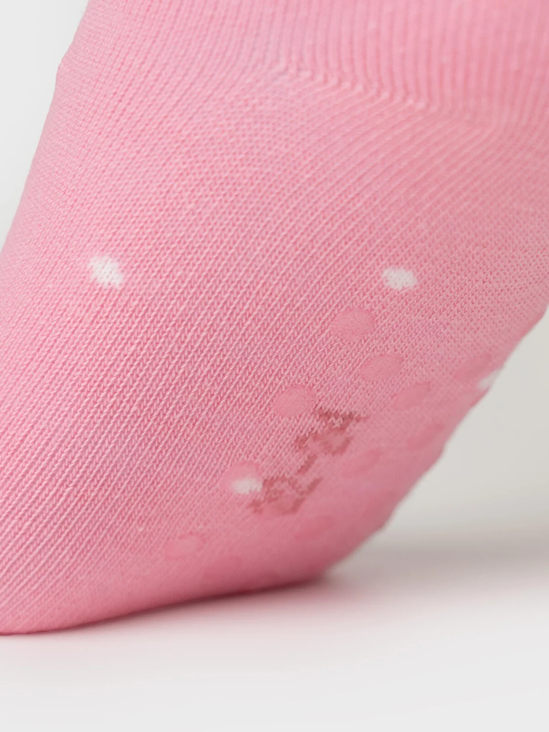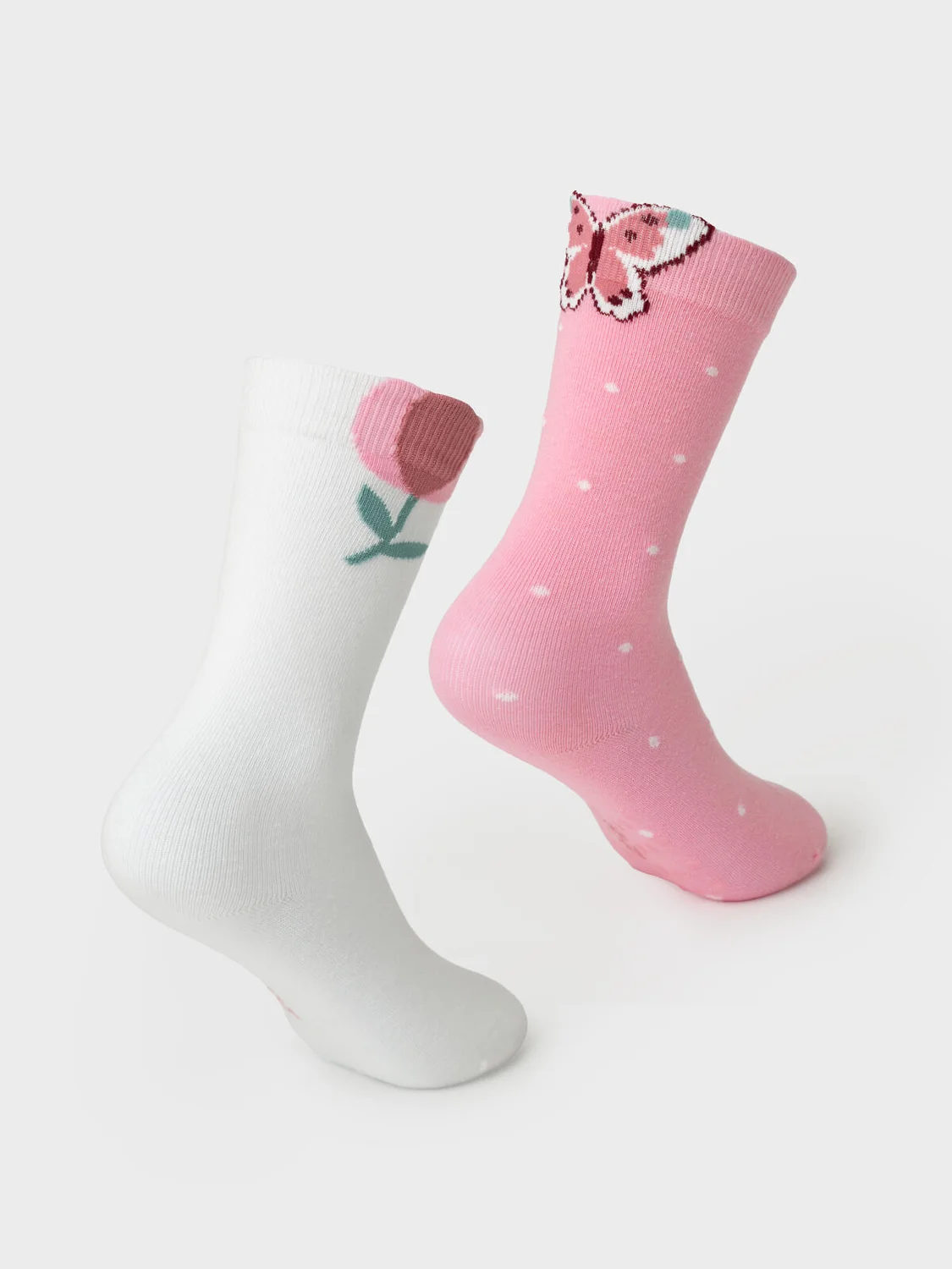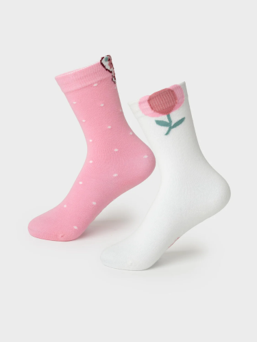 Набор из двух пар детских гольфов для девочки. Первая пара — розового цвета с белым горошком и аппликацией в виде бабочки. Вторая — светлая, с изображением тюльпана на голени. У обеих пар предусмотрены силиконовые стопперы на подошве, чтобы уменьшить скольжение. Гольфы связаны из мягкого хлопкового трикотажа, верх обработан эластичной резинкой.