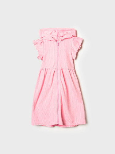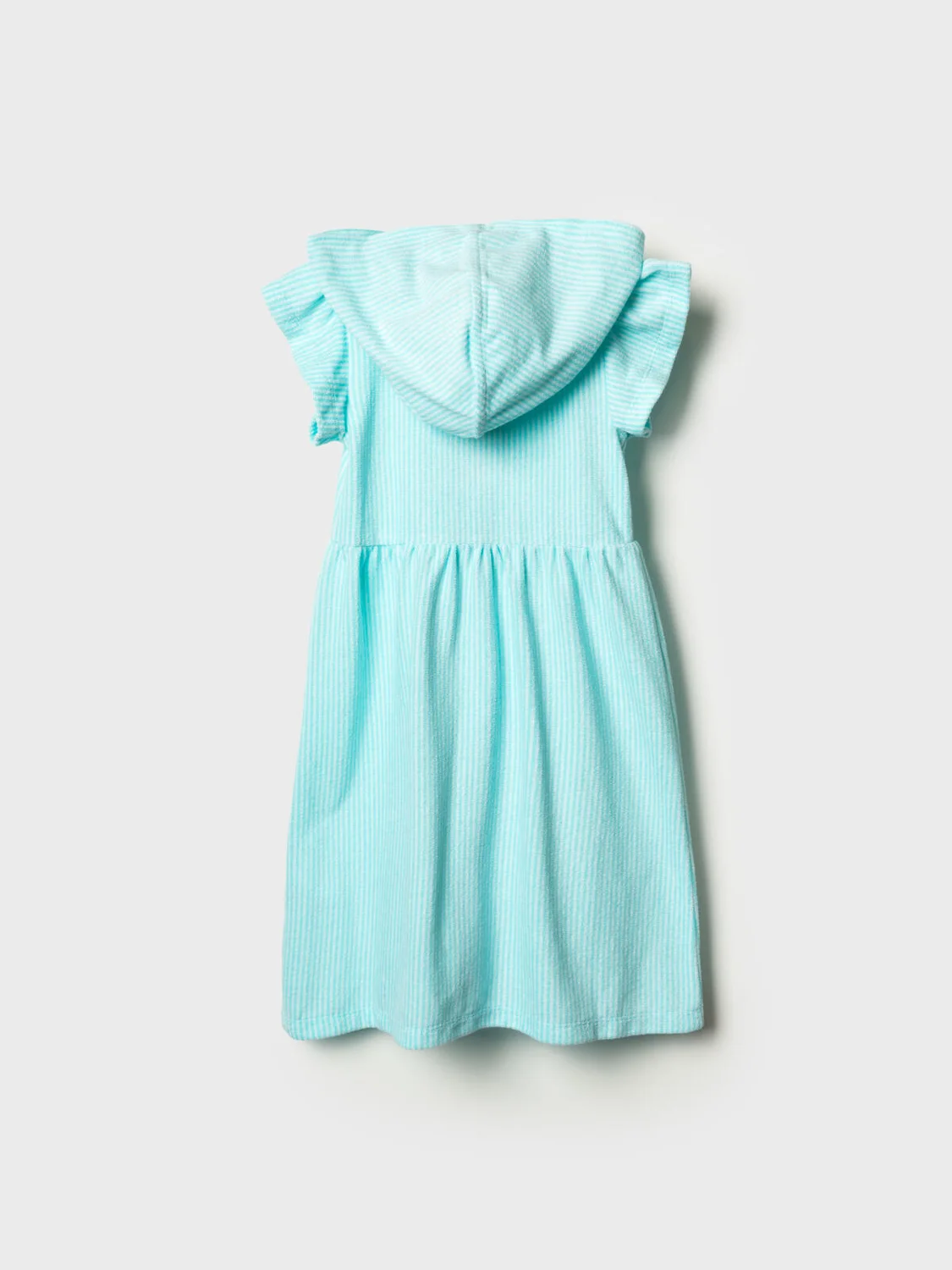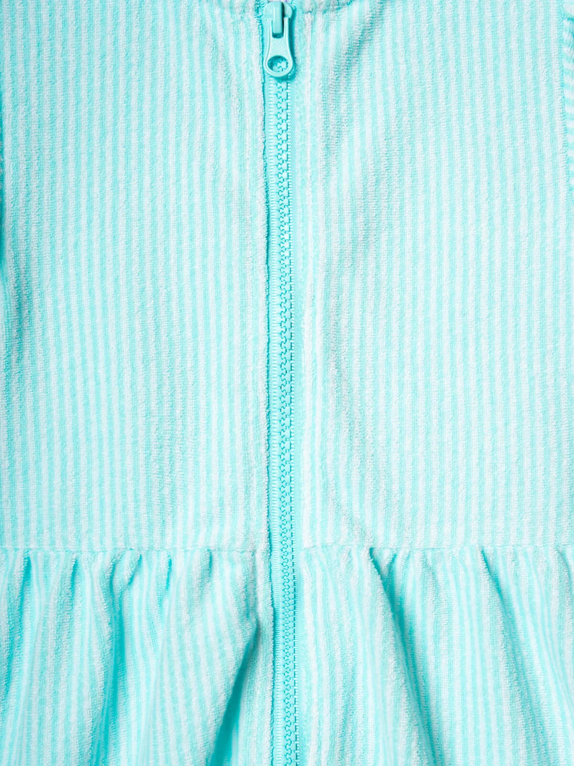 Детский махровый халат на молнии для девочки. Выполненный из мягкой хлопковой трикотажной ткани. Капюшон, короткие рукава с оборками и расклешённый низ. Центральная застёжка-молния делает халат удобным для повседневного использования. Светлый мятный цвет в белую полоску.