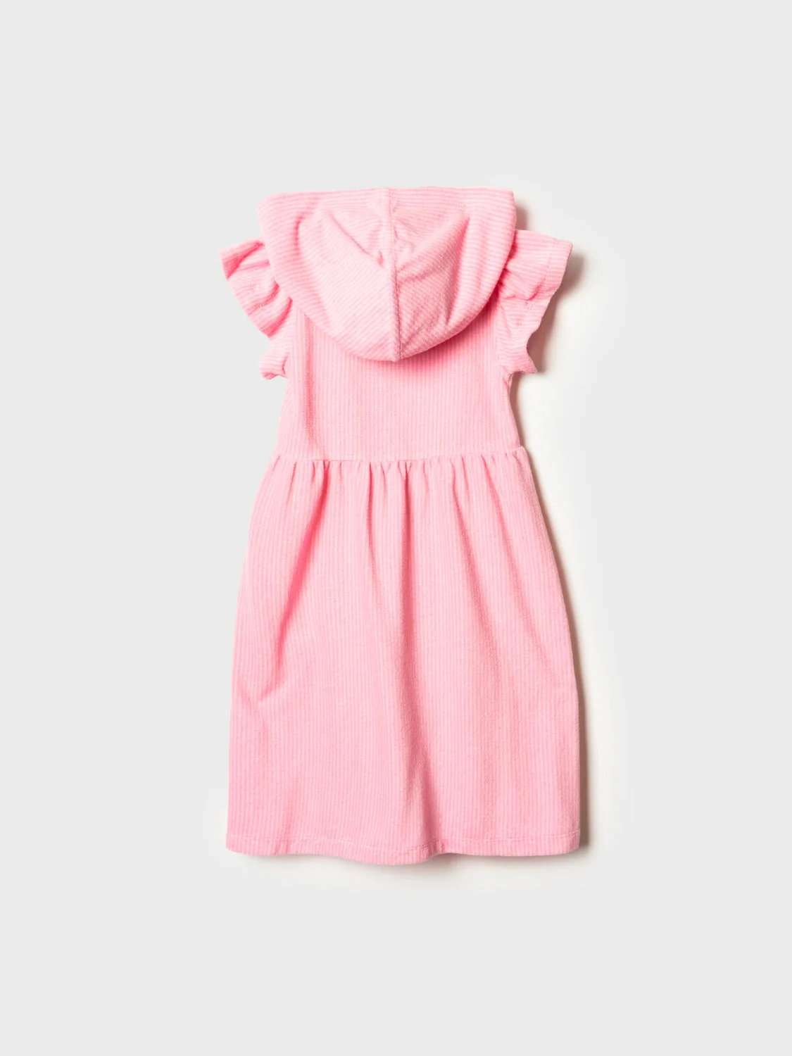 Детский махровый халат на молнии для девочки. Выполненный из мягкой хлопковой трикотажной ткани. Капюшон, короткие рукава с оборками и расклешённый низ. Центральная застёжка-молния делает халат удобным для повседневного использования. Светлый розовый цвет в белую полоску.