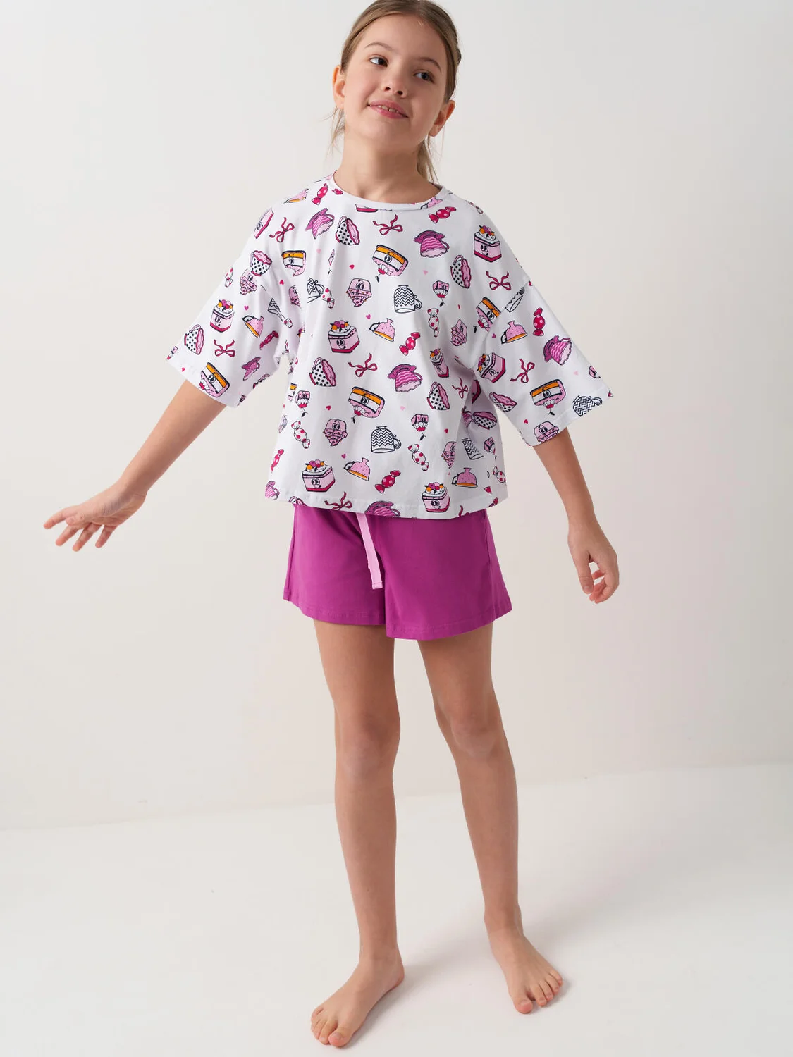Пижама для девочки подростка. Состоит из оверсайз футболки с короткими рукавами и удобных шорт. Футболка украшена ярким принтом с милыми десертами, чашками и конфетами. Шорты однотонные с мягким поясом и декоративным шнурком. У шорт есть карманы. Комплект выполнен из мягкого, хлопкового трикотажа, приятного к телу.