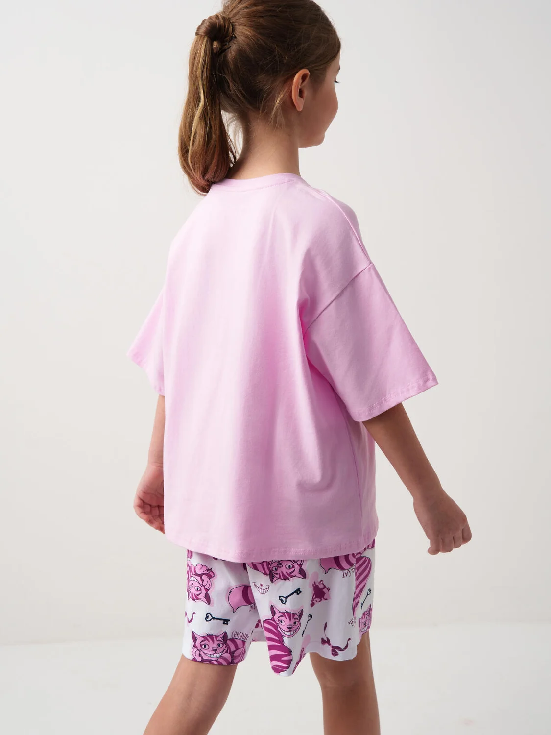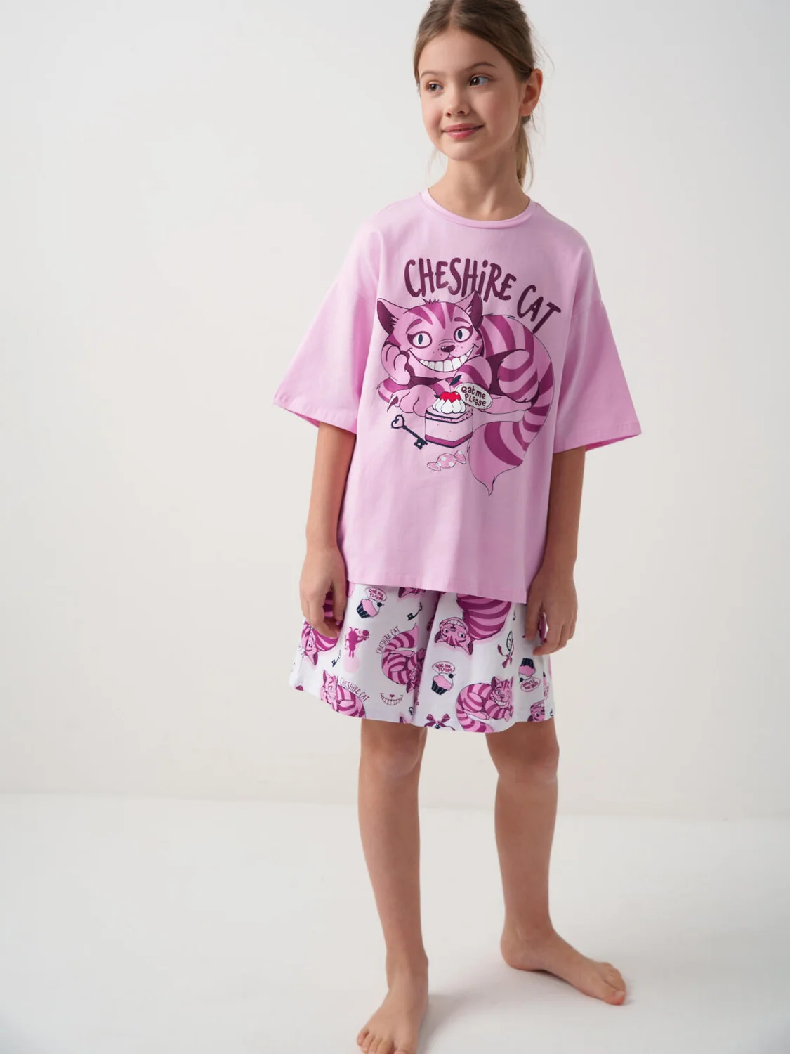 Пижама для девочки подростка. Состоит из розовой оверсайз футболки с ярким принтом Чеширского кота и белых шорт. У футболки круглый вырез и короткие рукава. Шорты на мягкой резинке с декоративным шнурком. Материал - хлопковый. дышащий трикотаж.