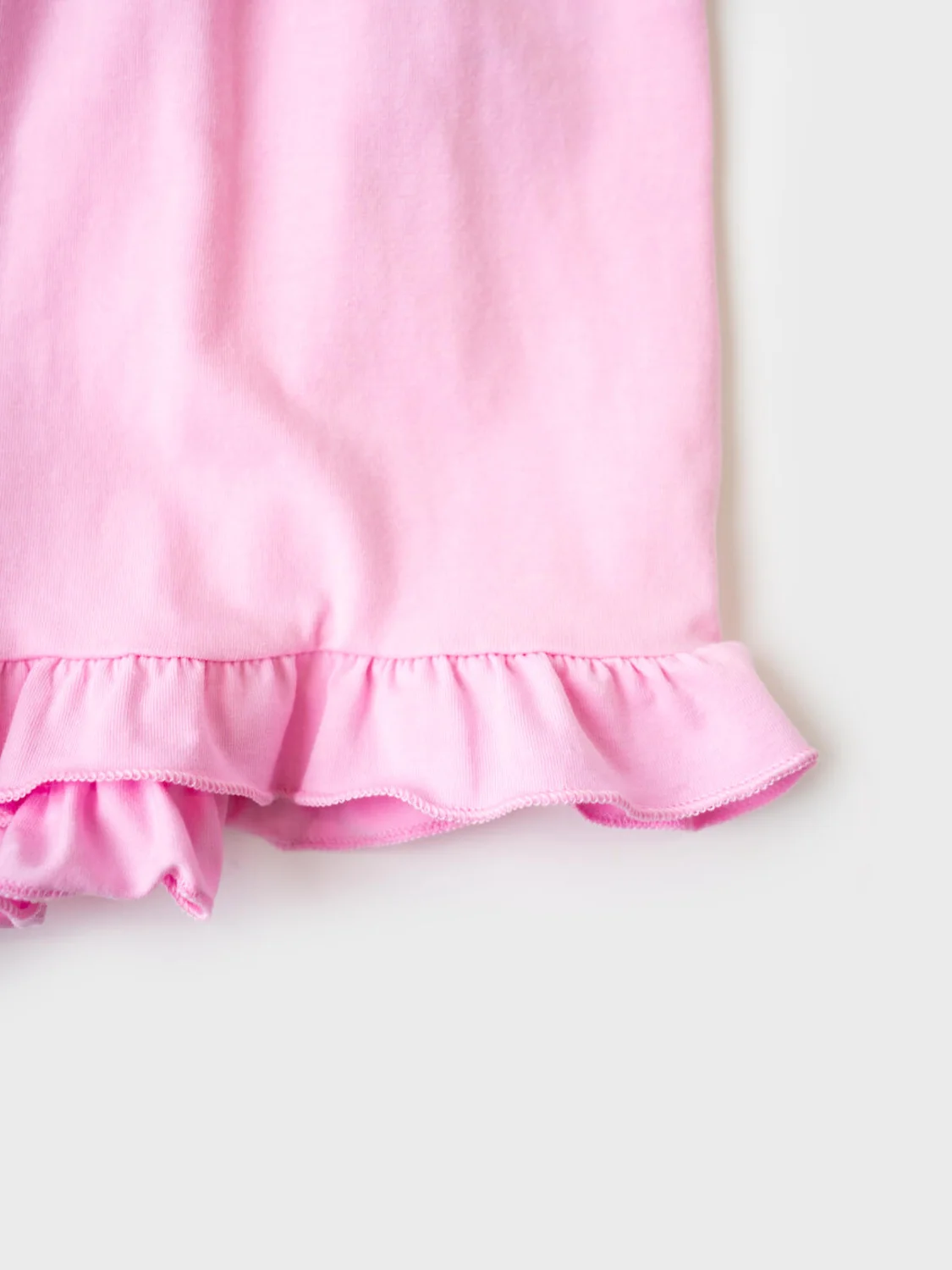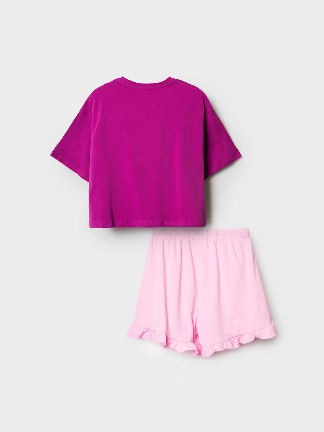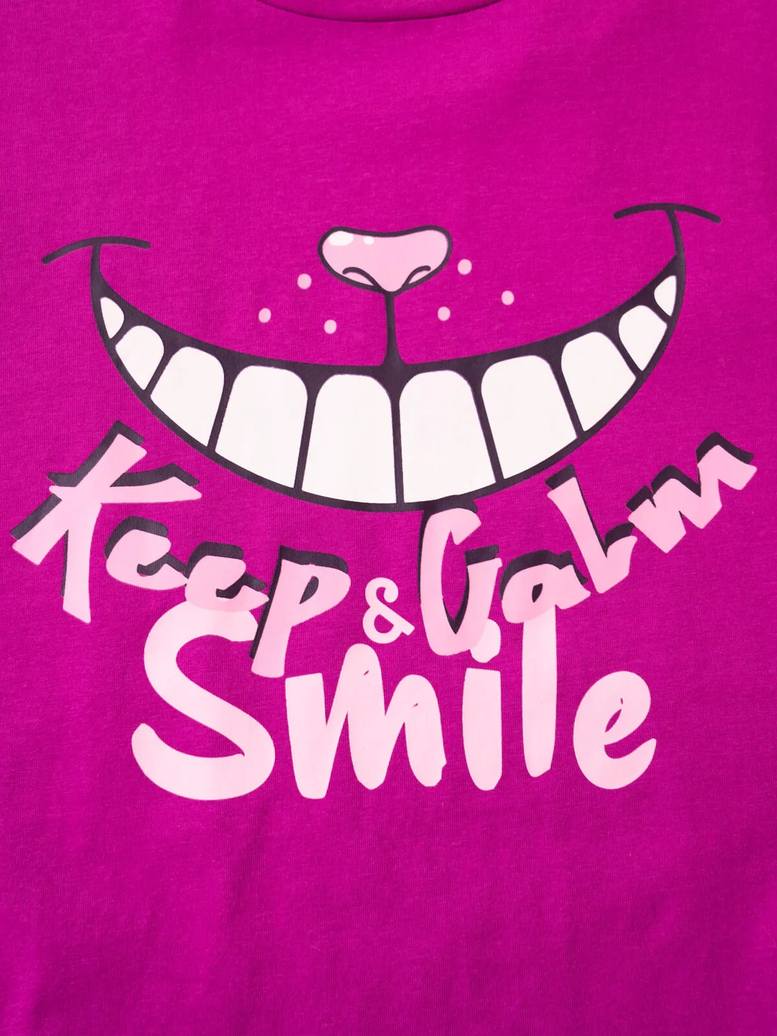 Пижама для девочки подростка. Комплект из оверсайз футболки и шорт. Футболка свободного кроя с короткими рукавами, украшена ярким принтом, отсылающим к любимому герою - Чеширскому коту. Шорты светло-розового цвета с мягкой резинкой в поясе и декоративным бантом, украшены рюшами по краю. Изделие выполнено из мягкого хлопкового трикотажа с добавлением эластана.