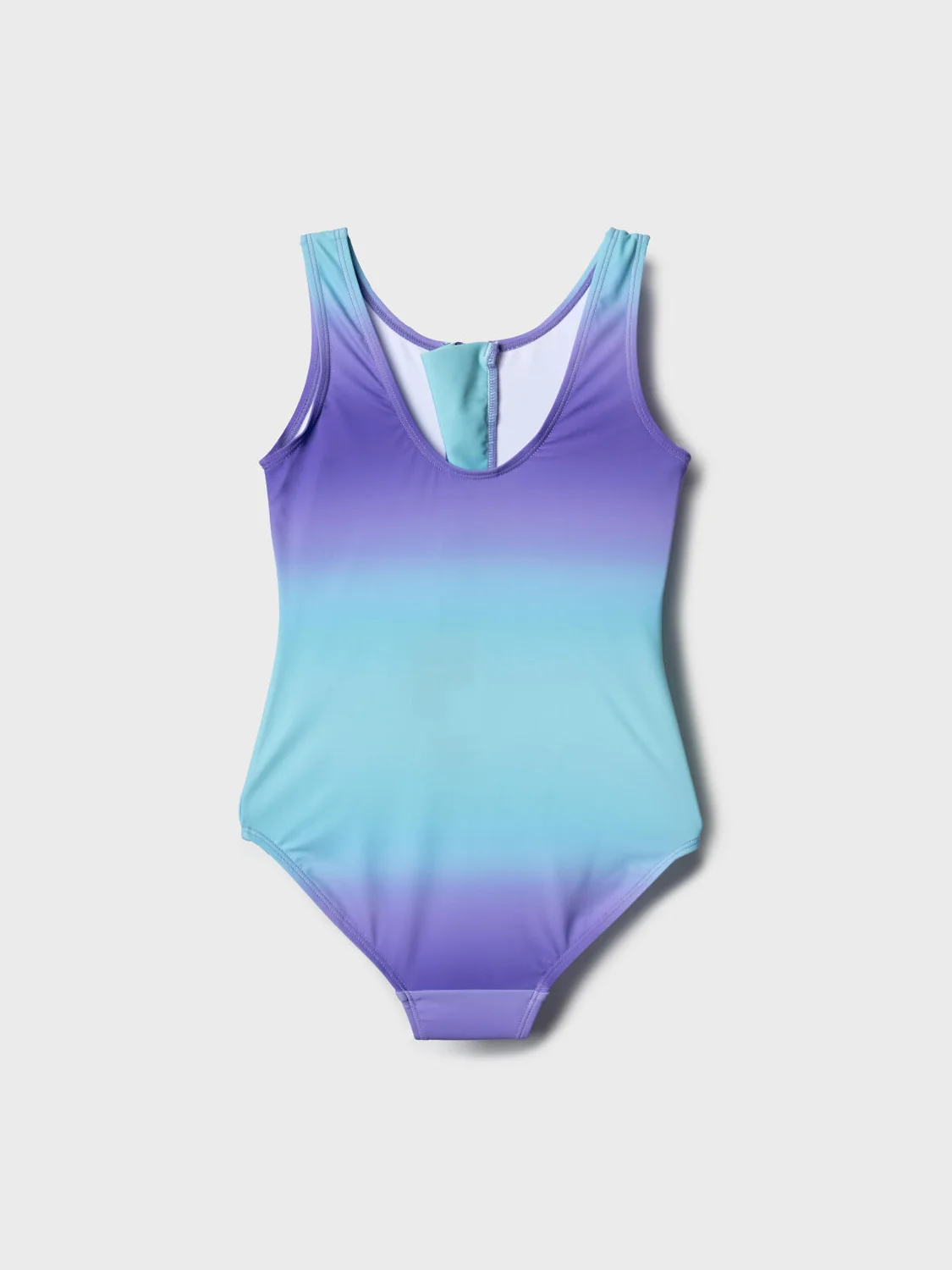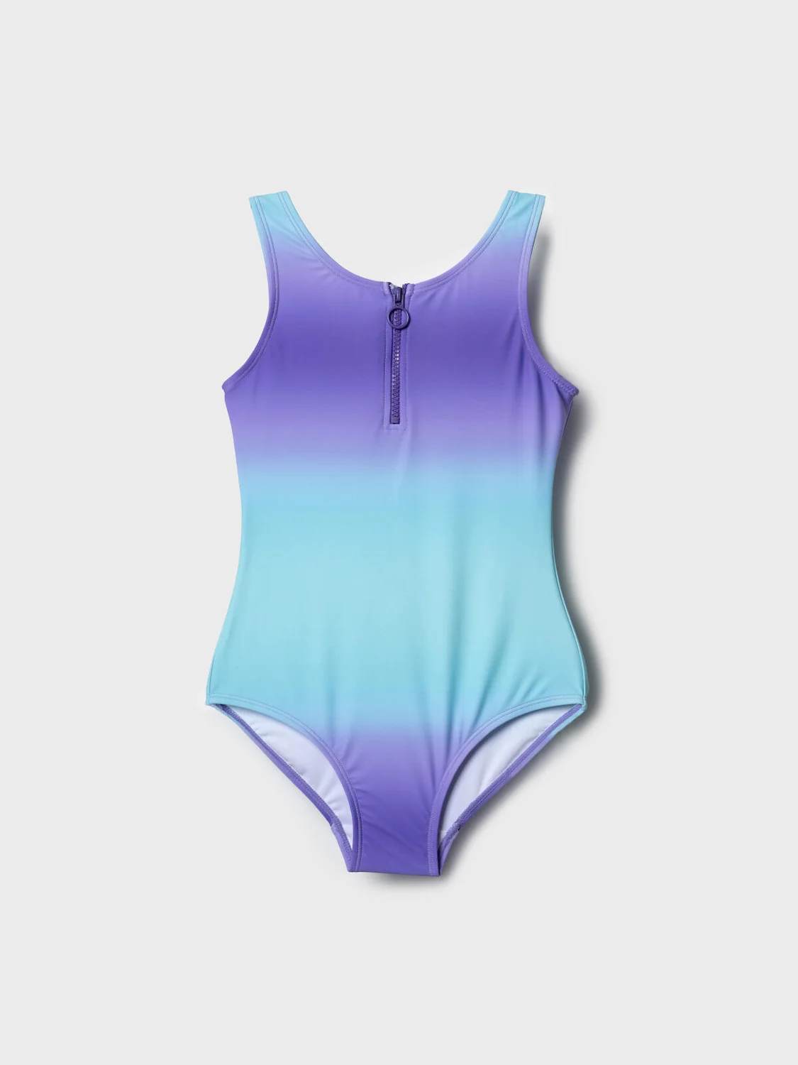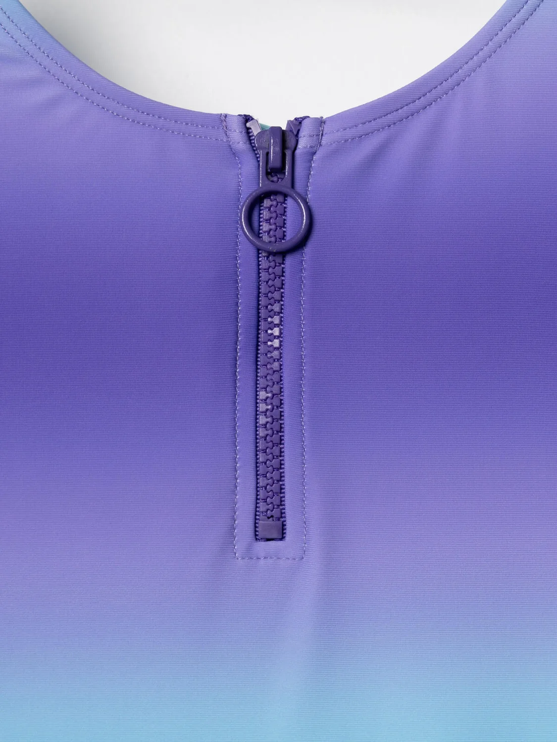 Купальник слитный для девочки подростка. Имеет плотную посадку и выполнен из эластичного материала с плавным переходом цвета — от фиолетового к голубому. Спереди расположен удобный пластиковый замок-молния с декоративным кольцом. Со 146 размера предусмотрены мягкие съемные чашки. Купальник имеет широкие плечевые бретели и округлые вырезы спереди и сзади. Внутри есть мягкая подкладка и гигиеническая вставка. Благодаря UF-защите, ткань сохраняет первоначальный вид даже при длительном пребывании на солнце. Все края обработаны эластичной тесьмой для комфортной посадки. Подходит для активного отдыха и плавания.