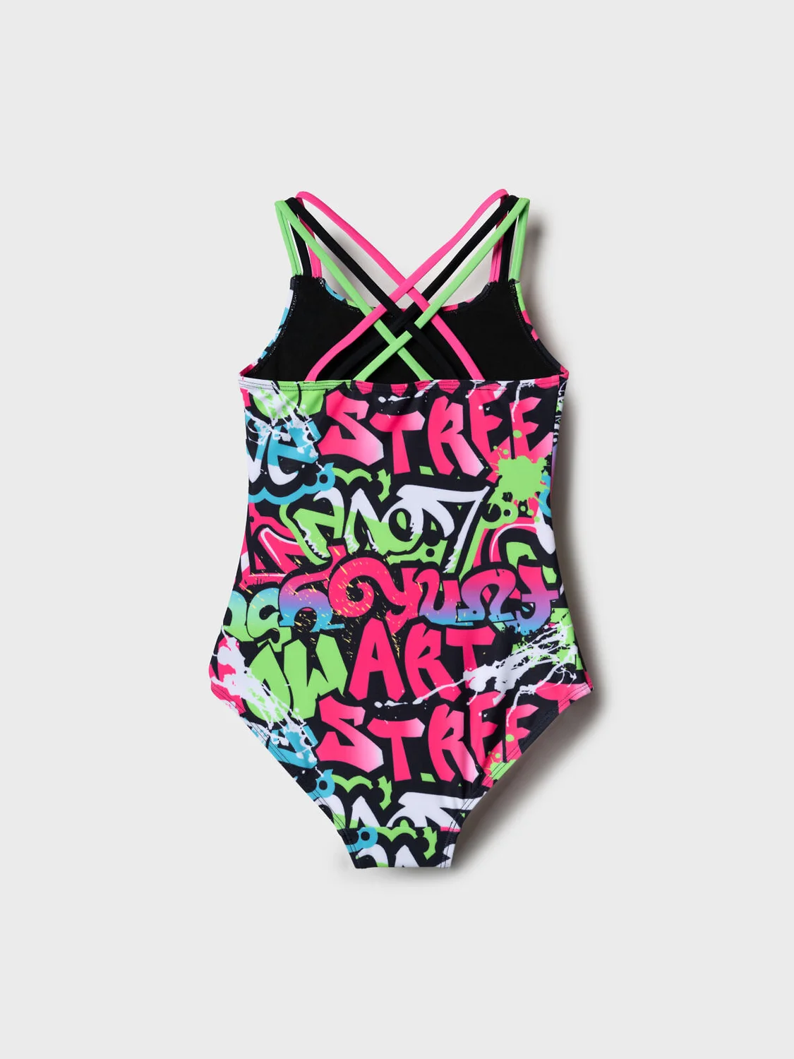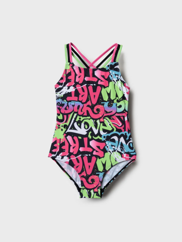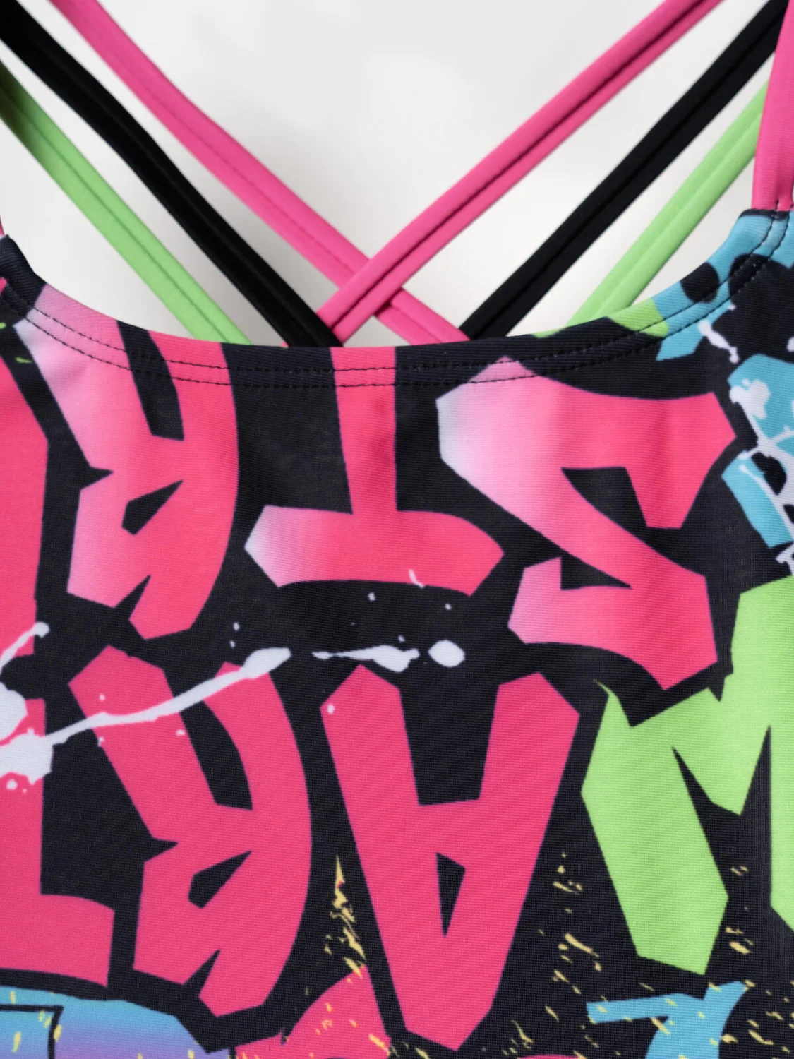 Слитный купальник для девочки подростка. Основной акцент сделан на разноцветный принт в стиле граффити с надписями, брызгами и контрастными цветами: розовый, салатовый, голубой, чёрный и белый. Купальник с эффектными переплетёнными бретелями на спине. Внутри предусмотрена двойная подкладка с чашечками для комфортной посадки. Все края аккуратно обработаны эластичной тесьмой. Модель разработана для активного летнего отдыха и плавания.