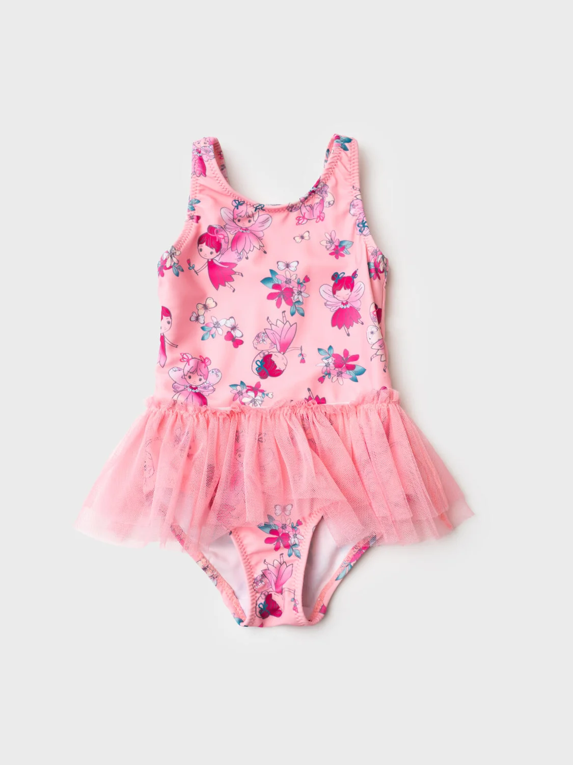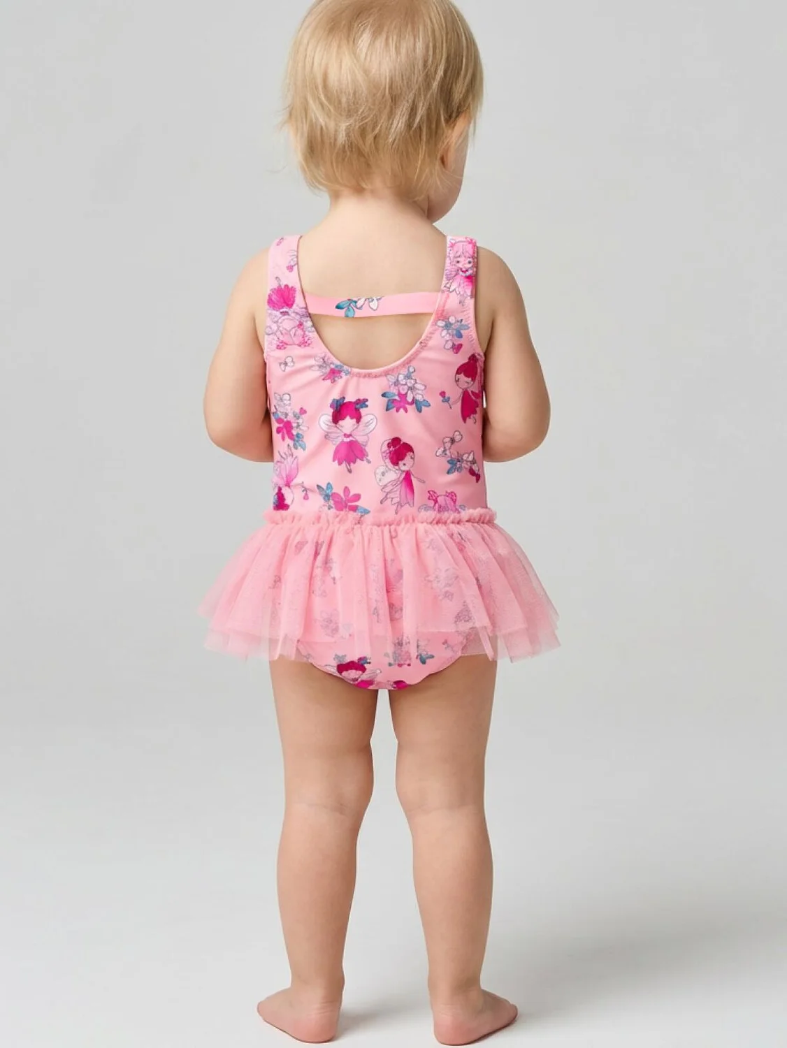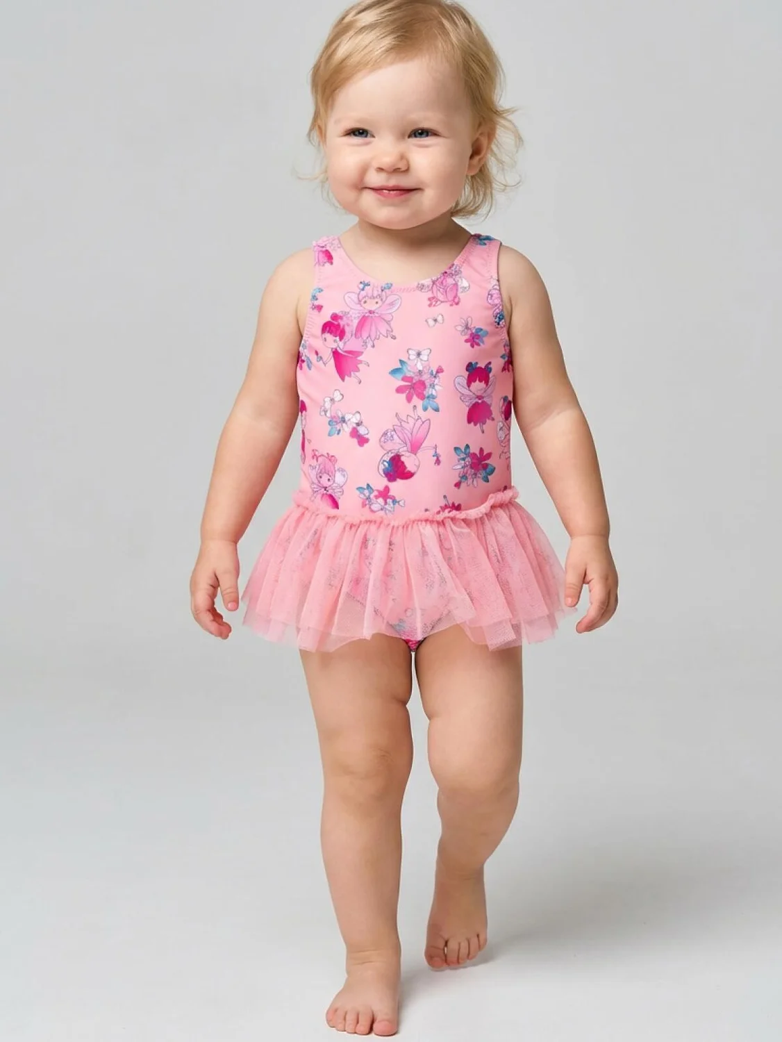 Детский слитный купальник для девочки. Выполнен в розовом цвете с ярким принтом с феями и цветами. Модель с открытой спинкой и декоративными резинками. По талии пришита пышная юбочка из воздушной сетки. Внутри подкладка. Все края обработаны эластичной тесьмой, чтобы изделие хорошо сидело на теле и не натирало. Благодаря UF-защите, ткань сохраняет первоначальный вид даже при длительном пребывании на солнце. Подходит для плавания и активного отдыха.