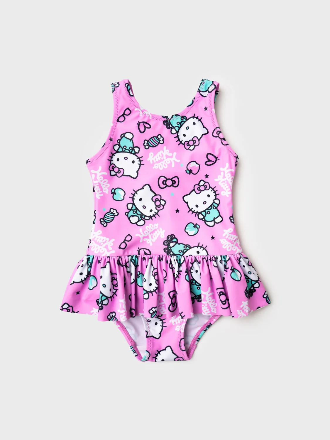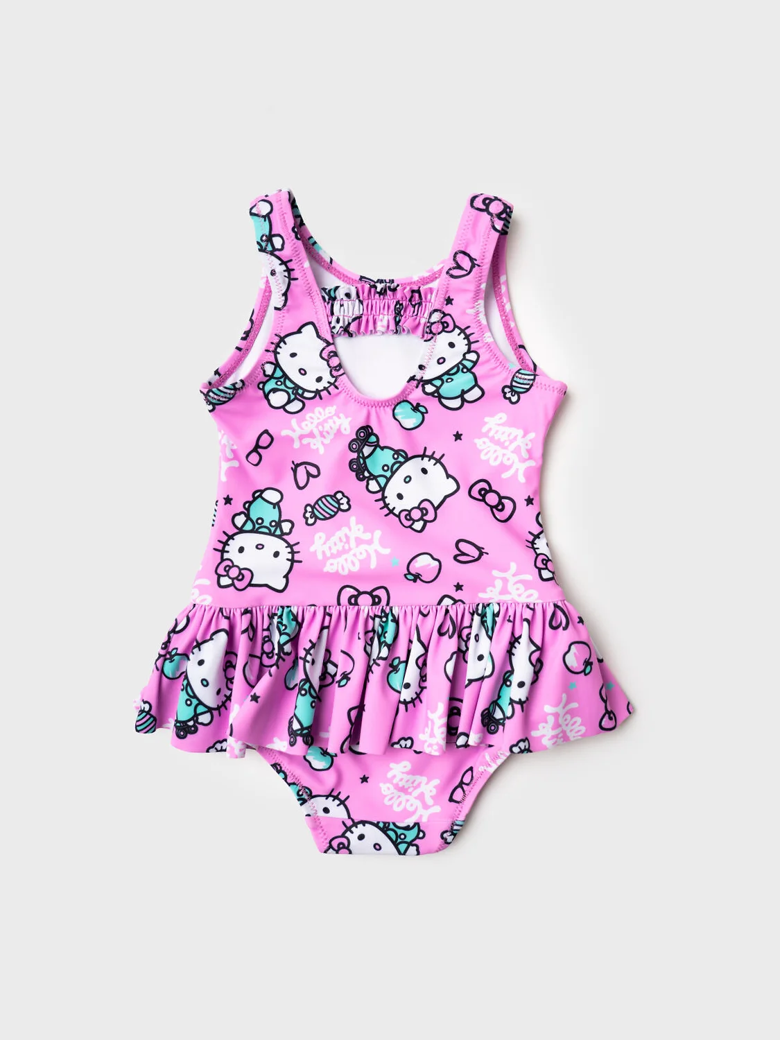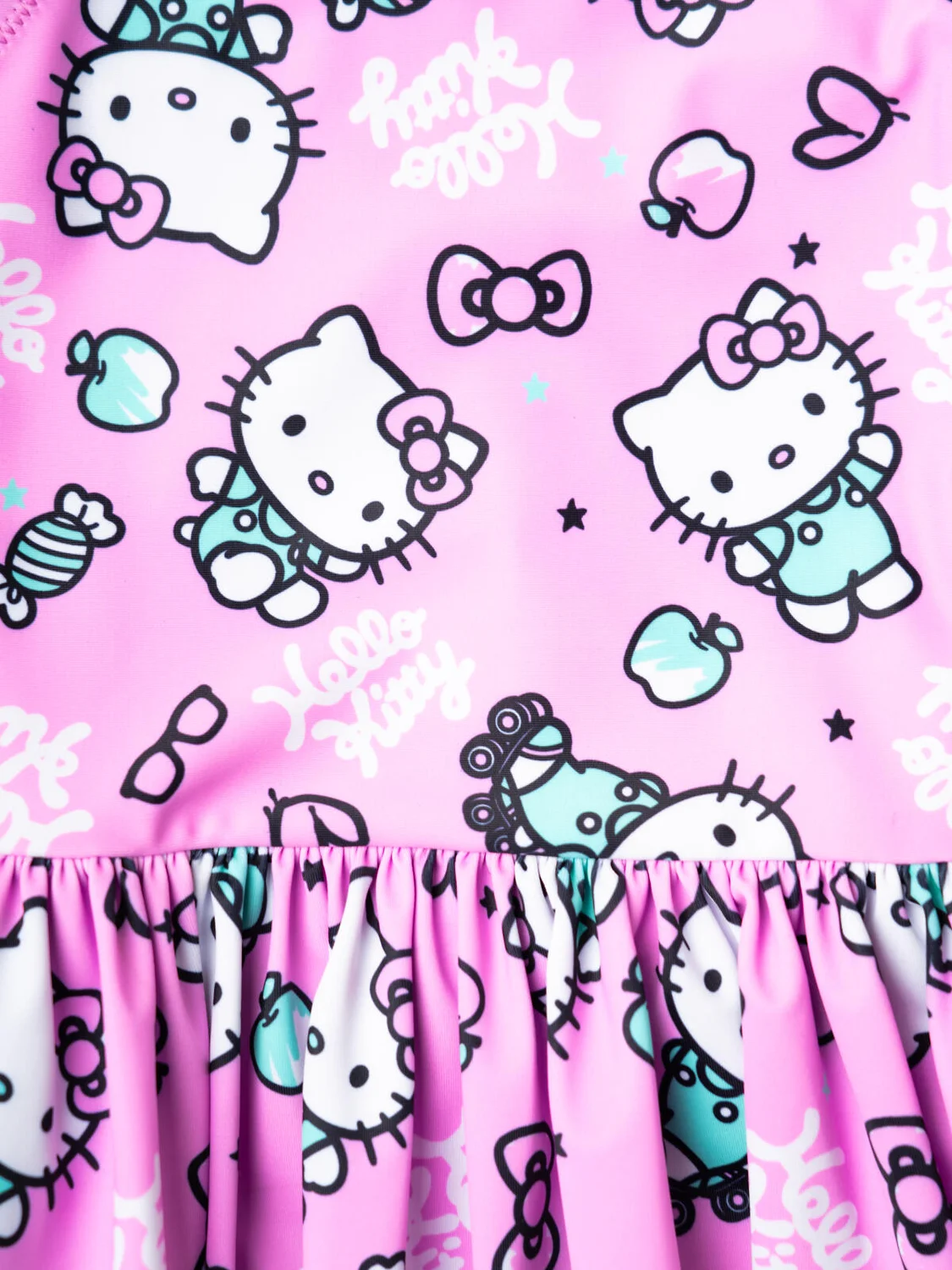 Слитный купальник для девочки с принтом Hello Kitty. Модель украшена короткой юбочкой по низу и декоративной эластичной вставкой на спинке. Вырез спереди классический, на спинке – углублённый. Проймы и горловина аккуратно обработаны эластичной окантовкой. Внутри предусмотрена подкладка. Благодаря UF-защите, ткань сохраняет первоначальный вид даже при длительном пребывании на солнце. Подходит для плавания и активного отдыха.