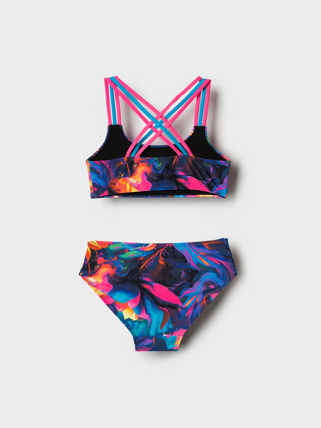 Купальник для девочки подростка. Верх выполнен без застёжек, с удобной посадкой и эффектными перекрещивающимися бретелями в контрастных цветах: розовом и бирюзовом. Вся поверхность изделия покрыта красочным абстрактным принтом с переходами насыщенных цветов – от фуксии до бирюзы и синего. Костюм выполнен из эластичного трикотажа с подкладкой в нижней части и усилен силиконовой лентой по краям, чтобы хорошо держал форму. Благодаря UF-защите, ткань сохраняет первоначальный вид даже при длительном пребывании на солнце. Благодаря мягким швам и комфортной посадке изделие подойдёт для активного отдыха и плавания.