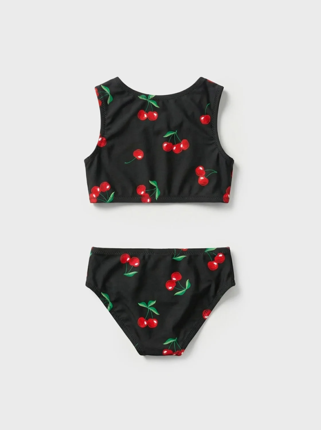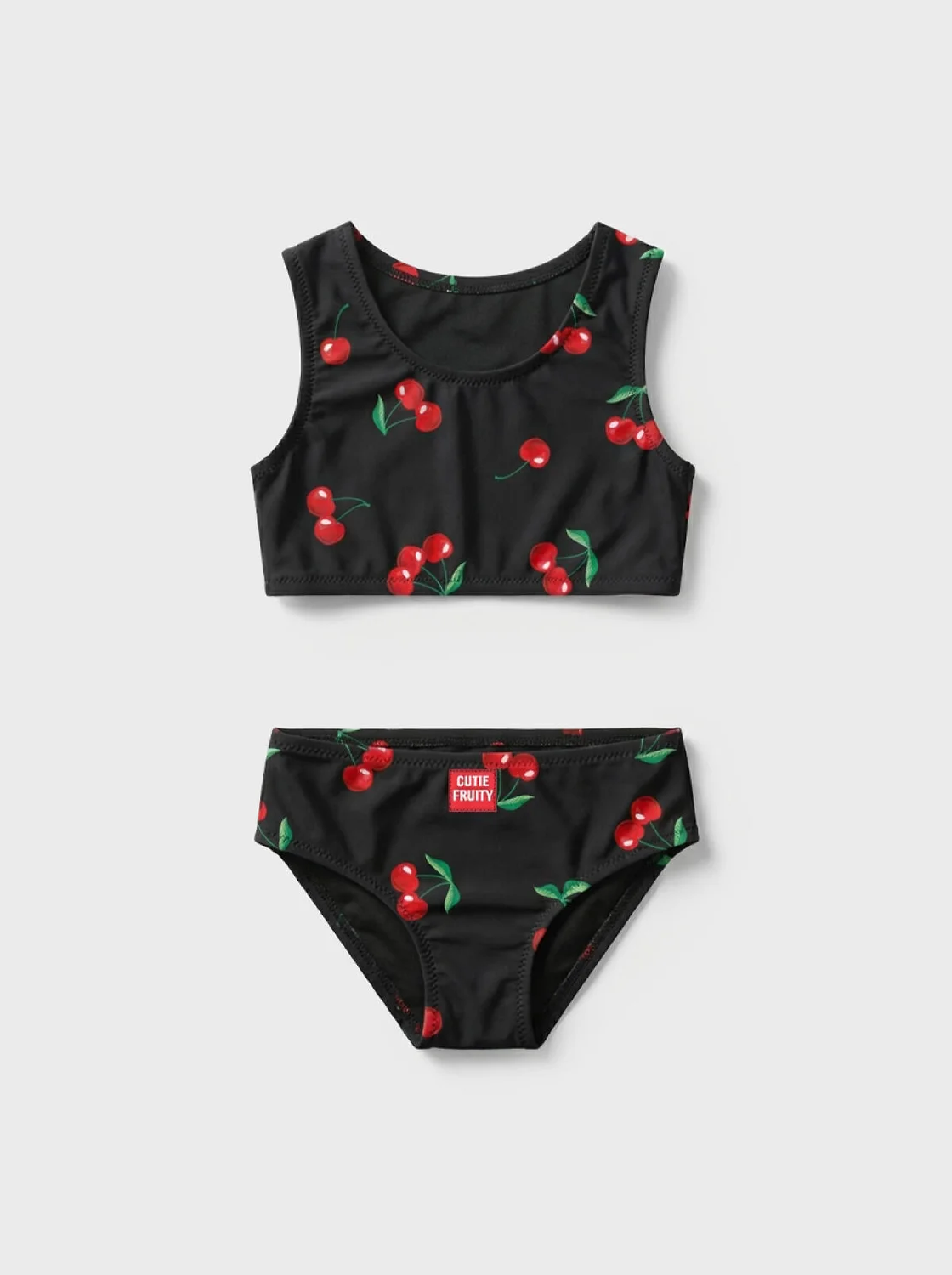 Купальник раздельный для девочки подростка. Выполнен в черном цвете с ярким принтом — красные вишенки с зелеными листочками. Комплект состоит из топа с широкой лямкой и круглым вырезом, а также плавок классической формы. Все края обработаны эластичной тесьмой, чтобы изделие хорошо сидело на теле и не натирало. Внутри трусов предусмотрена подкладка. Благодаря UF-защите, ткань сохраняет первоначальный вид даже при длительном пребывании на солнце. Подходит для плавания и активного отдыха.