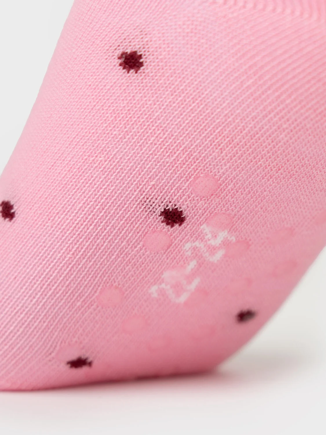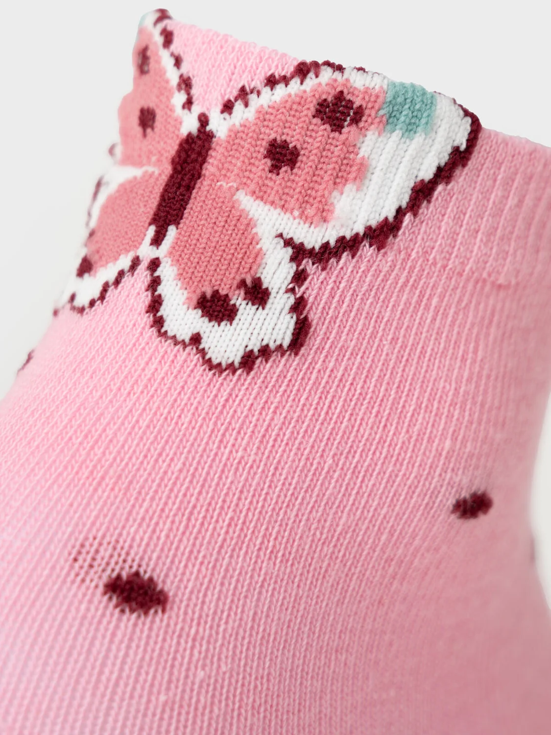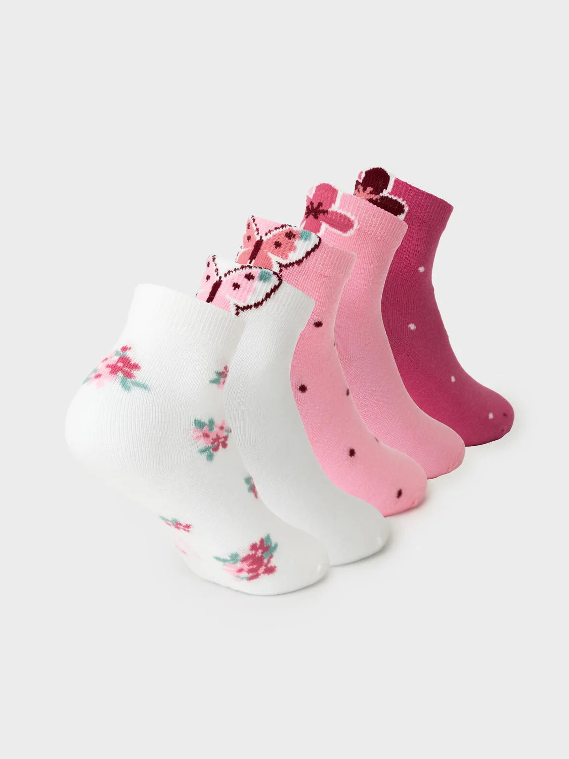 Набор из пяти пар детских носков для девочки. У каждой пары — свой рисунок: бабочка, цветы, узоры. На подошве расположены прозрачные силиконовые стопперы, которые предотвращают скольжение. Размерная маркировка также выполнена жаккардом на стопе. Материал — мягкий хлопковый трикотаж.