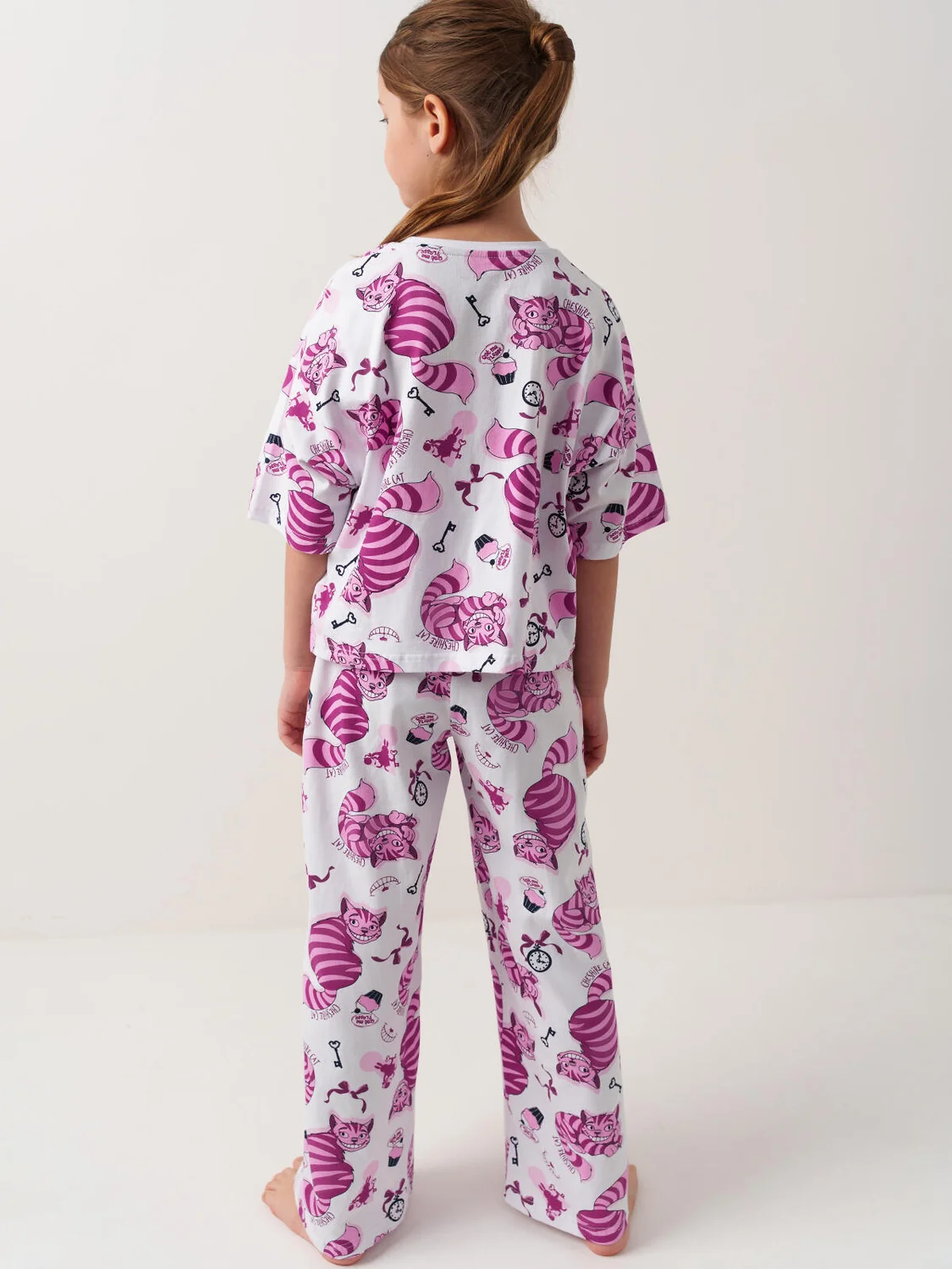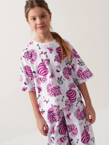 Пижама для девочки подростка. Комплект состоит из футболки оверсайз с короткими рукавами и длинных широких брюк. Изделие украшено ярким принтом с Чеширским котом, часами и ключами. В поясе брюк предусмотрен удобный шнурок для регулировки. Материал — мягкий и комфортный хлопковый трикотаж.