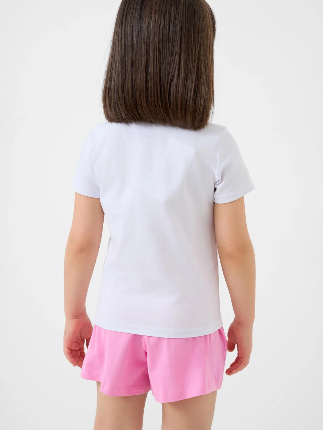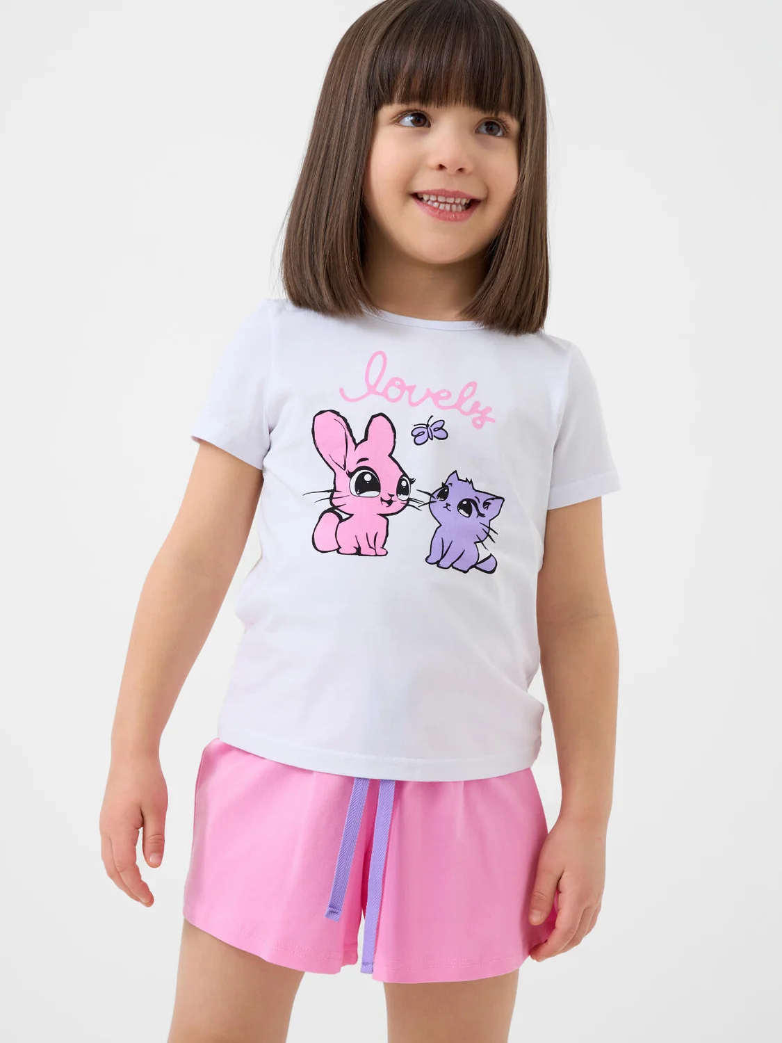 Пижама детская для девочки. Комплект состоит из белой футболки, прямого кроя и розовых шорт. На футболке — милый яркий принт с кроликом и котёнком. Шорты на мягкой резинке с декоративным шнурком. Материал - мягкий, хлопковый трикотаж.