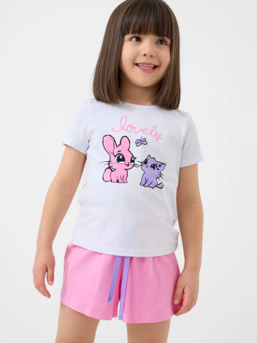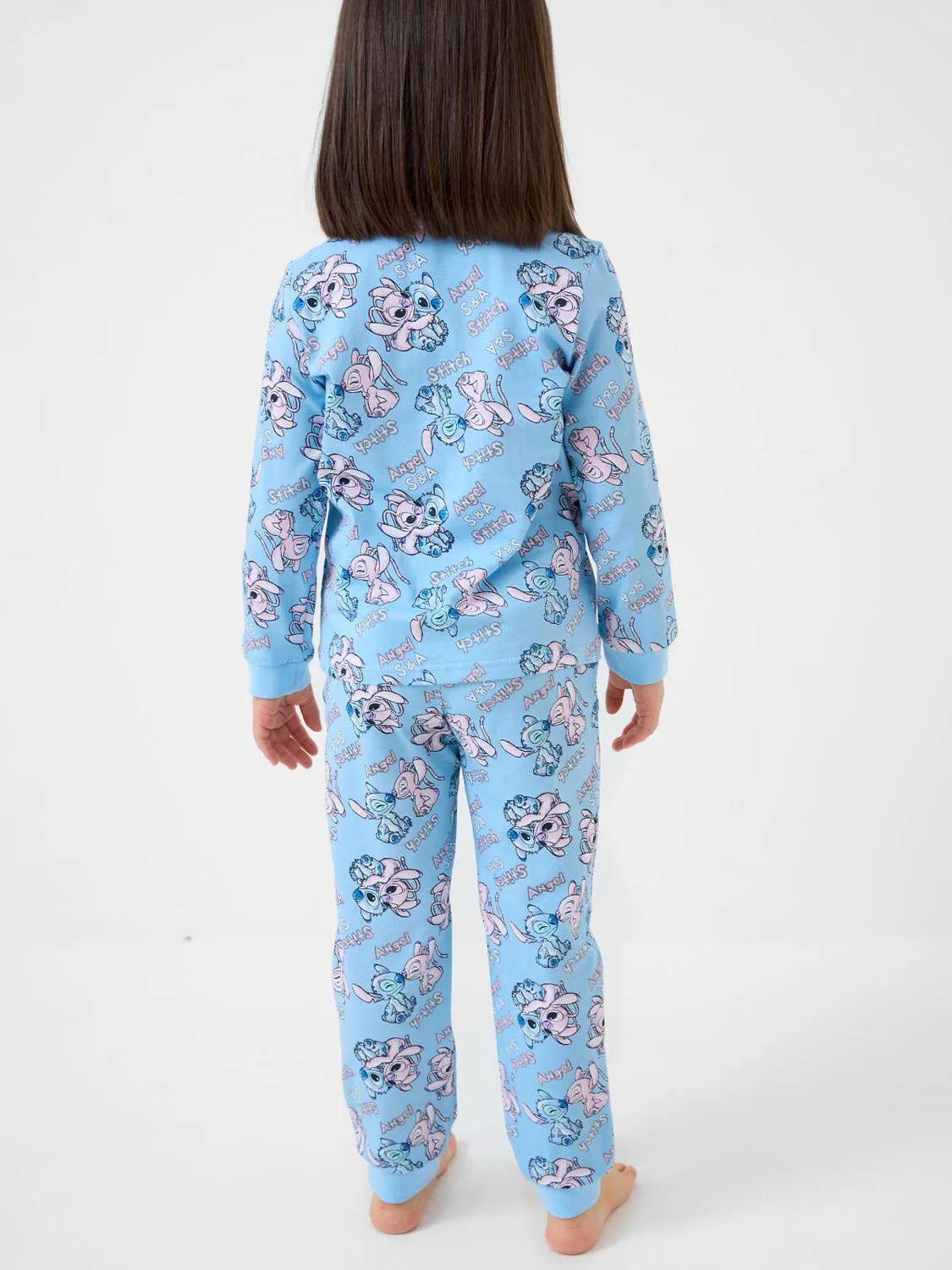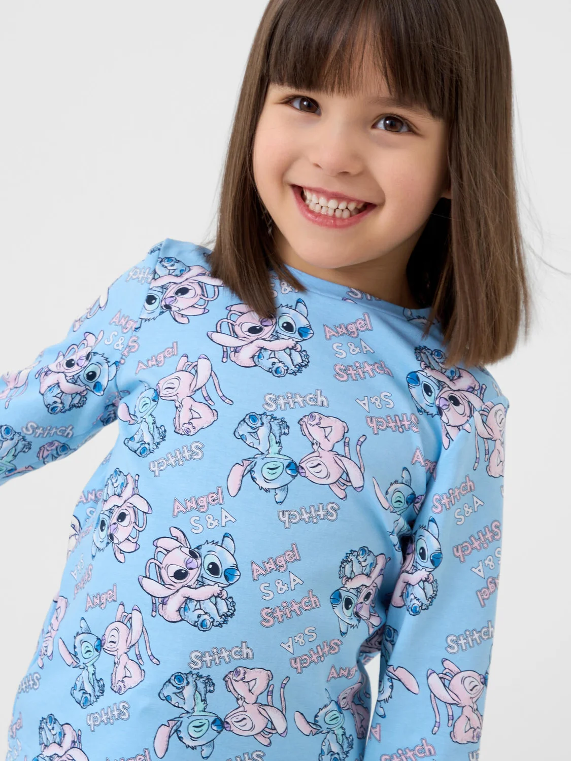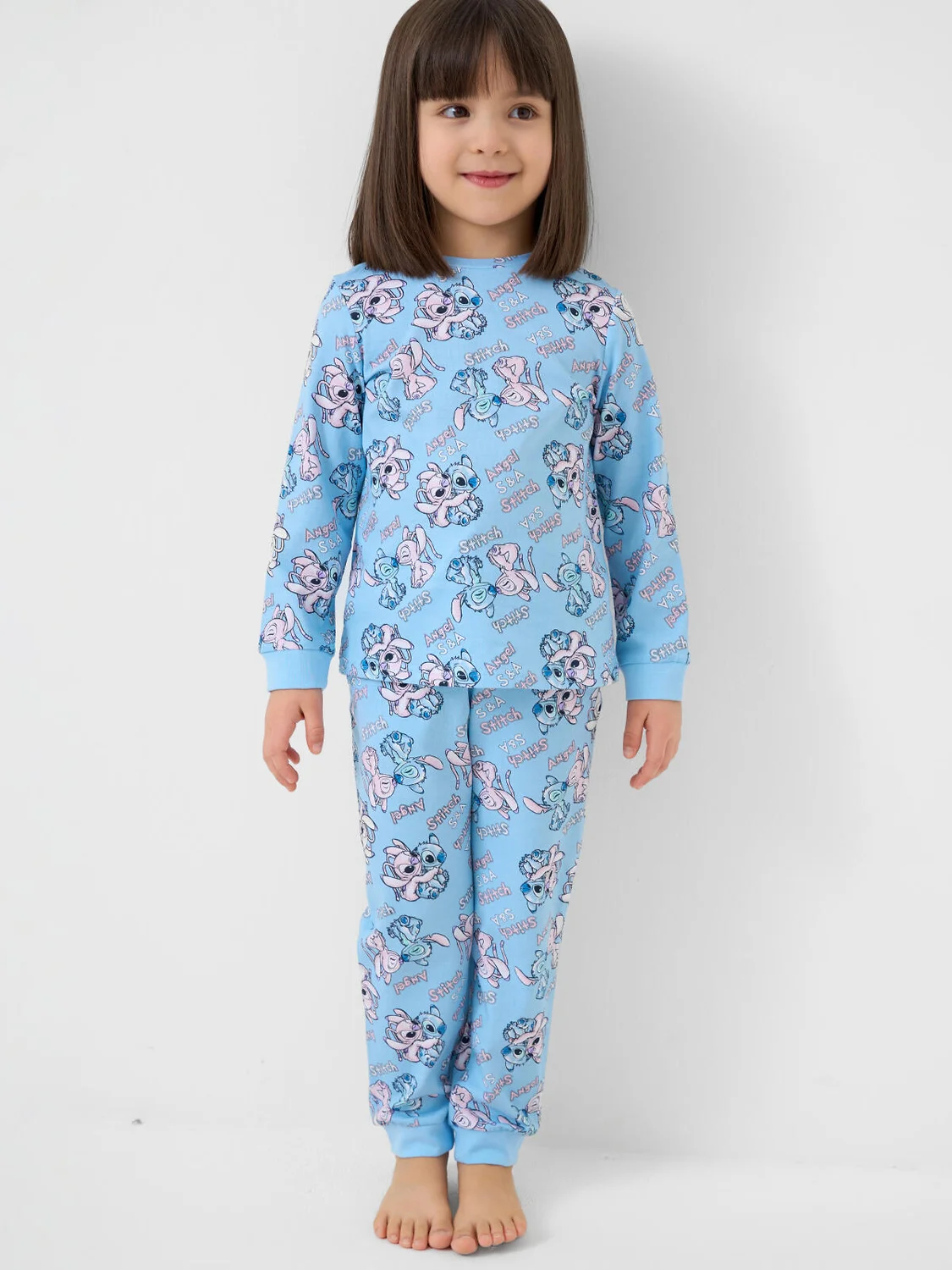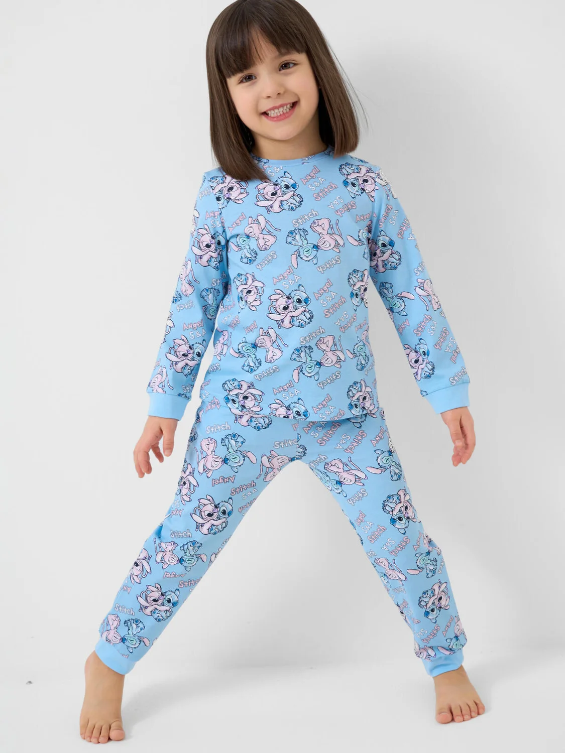 Детская пижама для девочки. Комплект из лонгслива, прямого кроя с длинными рукавами и брюк. Изделие выполнено из мягкого, хлопкового трикотажного материала и украшено ярким принтом с героями мультфильма Лило и Стич. У лонгслива круглая горловина и манжеты на рукавах, у брюк — удобный пояс на резинке, дополненный декоративным белым шнурком. Манжеты по низу брюк делают модель комфортной в носке.