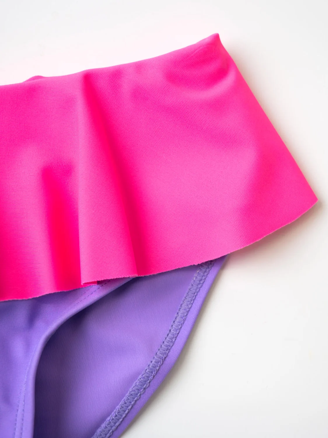 Купальные детские плавки для девочки. Модель с низкой посадкой, выполнена в сиреневом цвете с широким розовым воланом по талии. Для удобства в поясе вшита эластичная резинка, а вырезы для ножек обработаны мягкой латексной резинкой. Внутри предусмотрена ластовица с подкладкой. Благодаря UF-защите, ткань сохраняет первоначальный вид даже при длительном пребывании на солнце. Подходит для плавания и активного отдыха.
