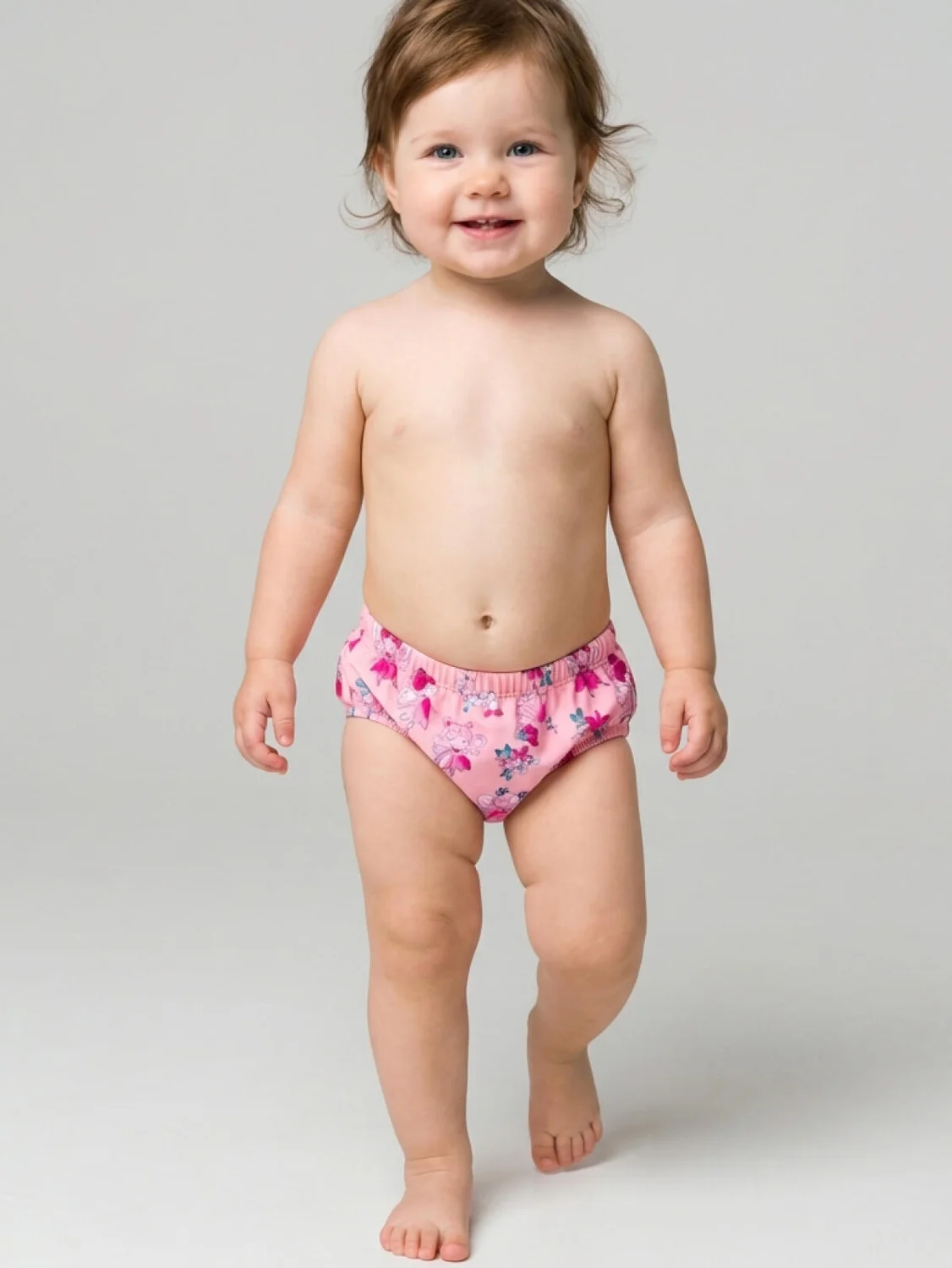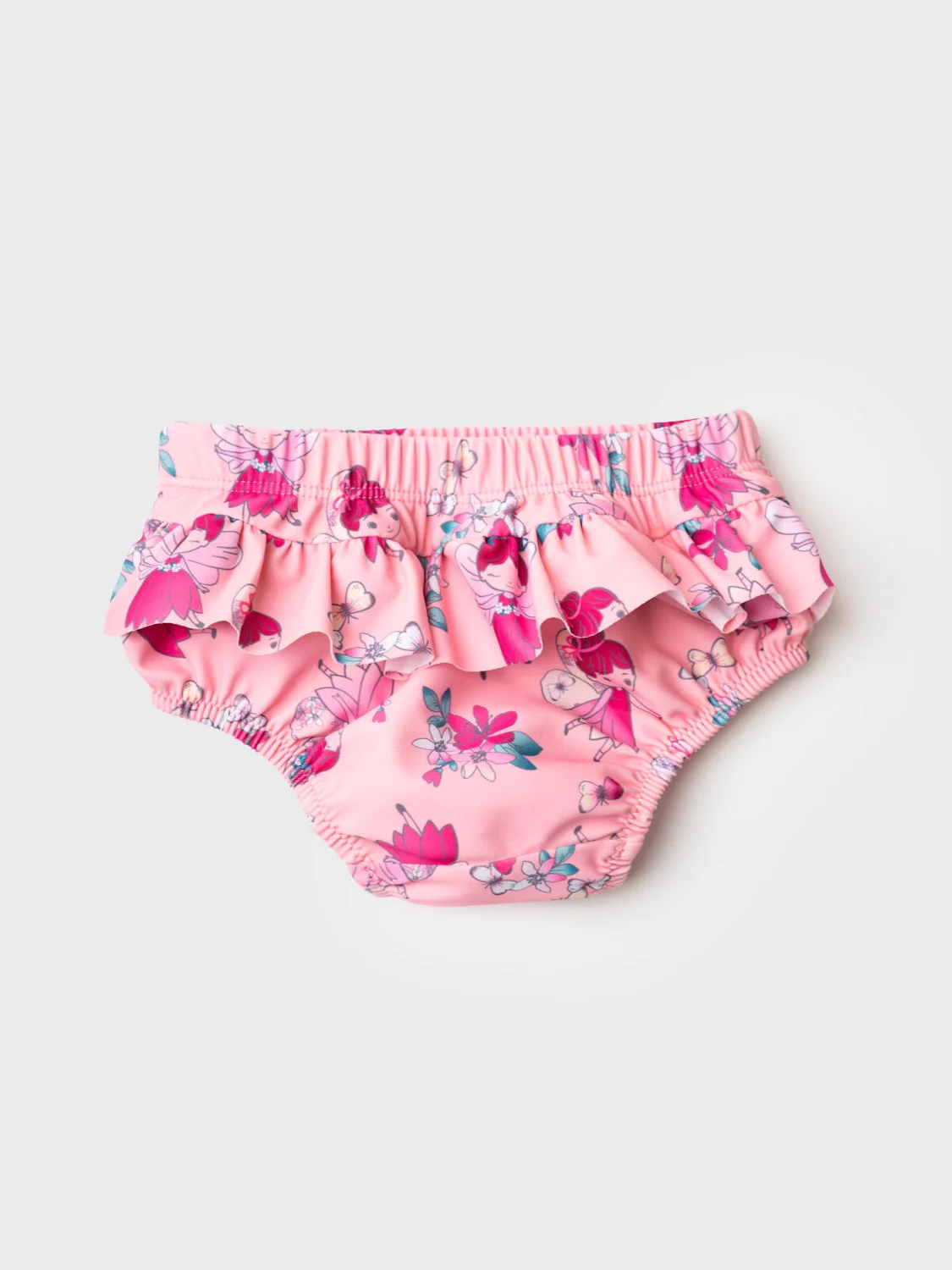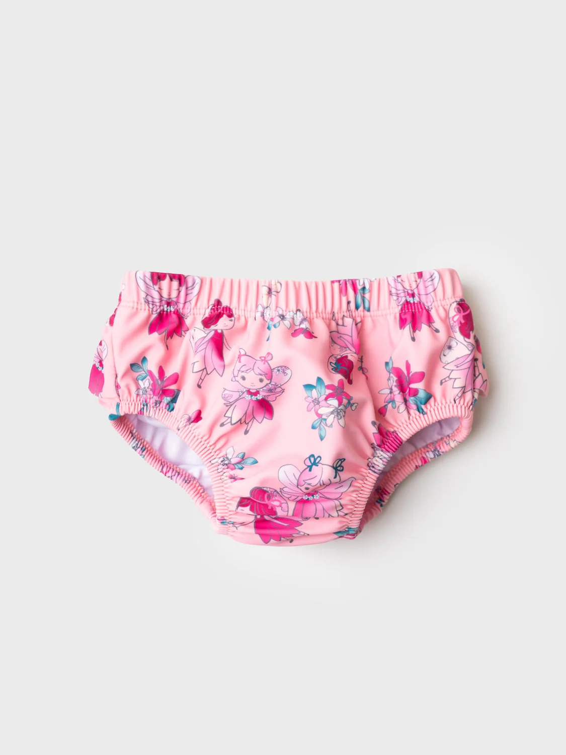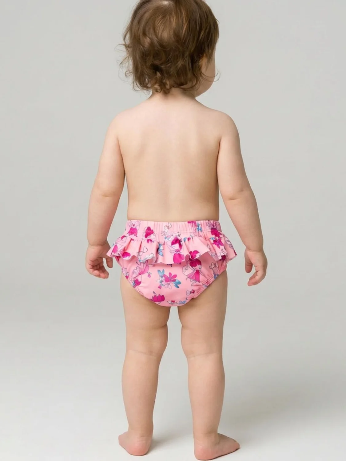 Плавки детские для девочки разработаны специально для ношения с подгузником. Модель выполнена из розовой эластичной ткани с милым принтом сказочных персонажей и цветов. На спинке изделия — декоративная оборка, придающая очаровательный и нежный вид. Пояс и вырезы ножек оформлены мягкими резинками для комфортной посадки. Внутри предусмотрена наклейка в области ластовицы для дополнительной гигиены. Отличный выбор для пляжного образа малышки.