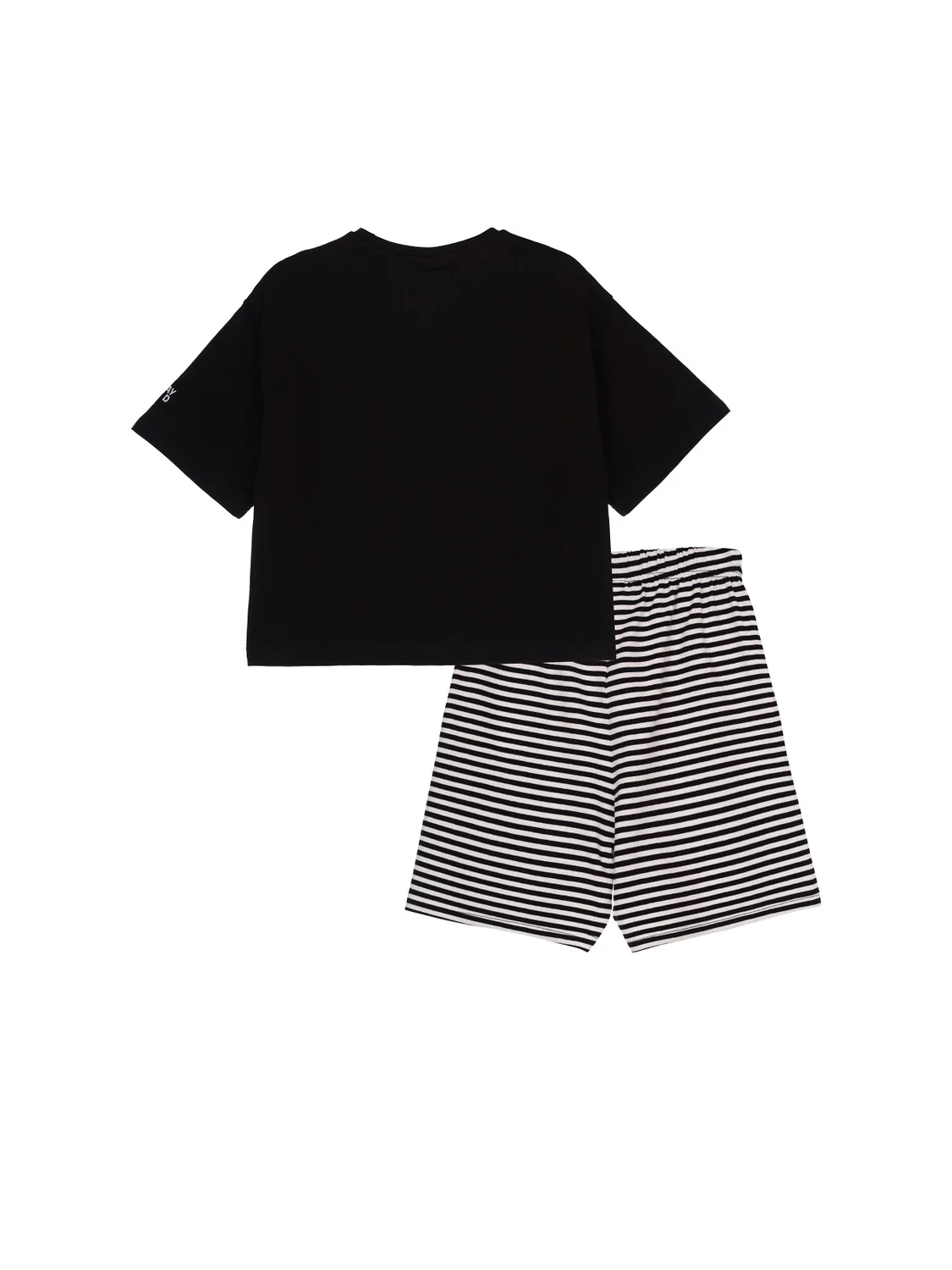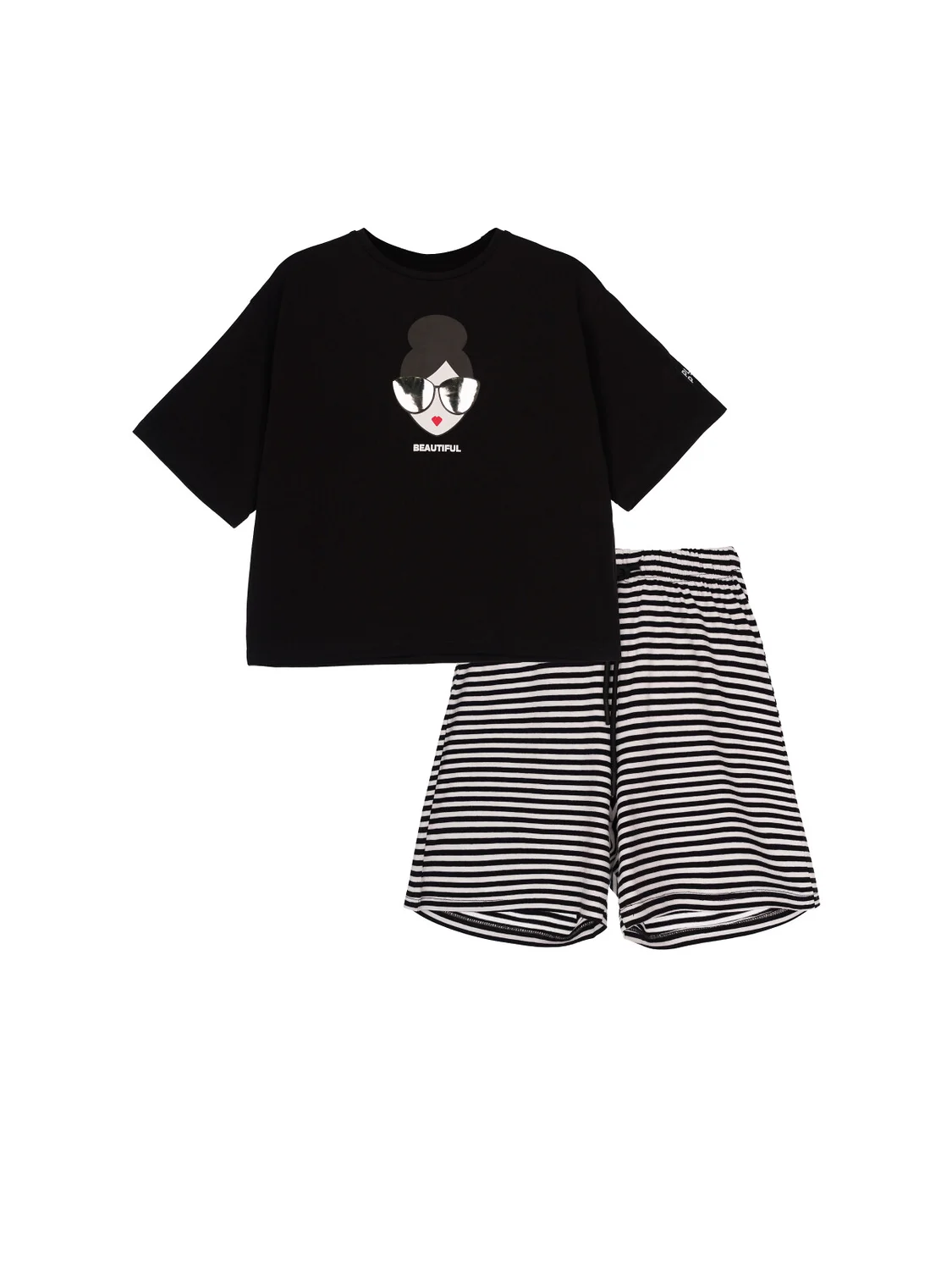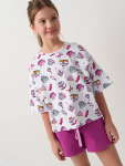 Костюм для девочки подростка.Футболка и шорты классической посадки. Костюм из качественного и приятного на ощупь трикотажа джерси с высоким содержанием хлопка 95%. Благодаря наличию эластана в составе ткани изделие проще в уходе и держит форму. Шорты на резинке со шнурком.