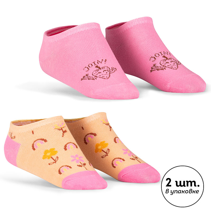 Персиковый/розовый(33/37) Короткие носки для девочки, упаковка из 2-х пар. Носки с высоким содержанием хлопка и добавлением эластана не спадают, не садятся, не теряют форму. Не сползают с ног, с мягкой нетугой резинкой, которая не сдавливает ногу. Носочки подойдут к любой одежде для детей, а веселый принт-ягодка поднимет настроение. Перевод "присоединяйся".