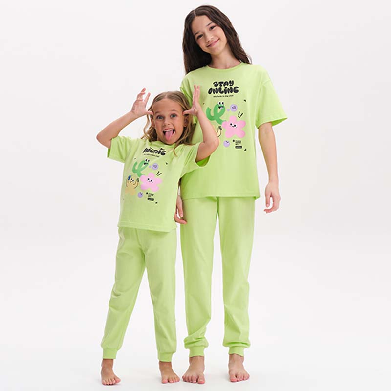 Яблочный(51) Стильная и уютная пижама актуального цвета для девочки. В составе ткани 100% хлопка — идеально для детской одежды! Модель приятна на ощупь, прекрасно пропускает воздух, позволяя коже ребёнка дышать. При этом в пижаме из хлопка ребёнку будет тепло, даже если он сбросит одеяло. Всё это обеспечивает комфортный и качественный сон. Футболка и брюки среднего объёма, плечо немного спущено, рукава широкие и свободные — в пижаме очень удобно спать. Широкая и мягкая резинка в поясе не перекручивается и не давит. Манжеты брюк и отделка горловины из эластичной рибаны — она не растягивается, ребёнку удобно надевать и снимать пижаму. Футболку украшает позитивный принт. Надписи переводятся: "исследуй новые идеи", "создай немного искусства". Хлопковый комплект идеален для сна как дома, так и в детском саду — прекрасный выбор для вашего ребёнка! Пижама с брюками подходит для круглогодичного использования. Домашний комплект — замечательный подарок дочке, внучке, сестре на любой праздник. Выбирайте нужный размер по таблице размеров на фото. Цвет товара на экране вашего устройства может отличаться от цвета изделия вживую.