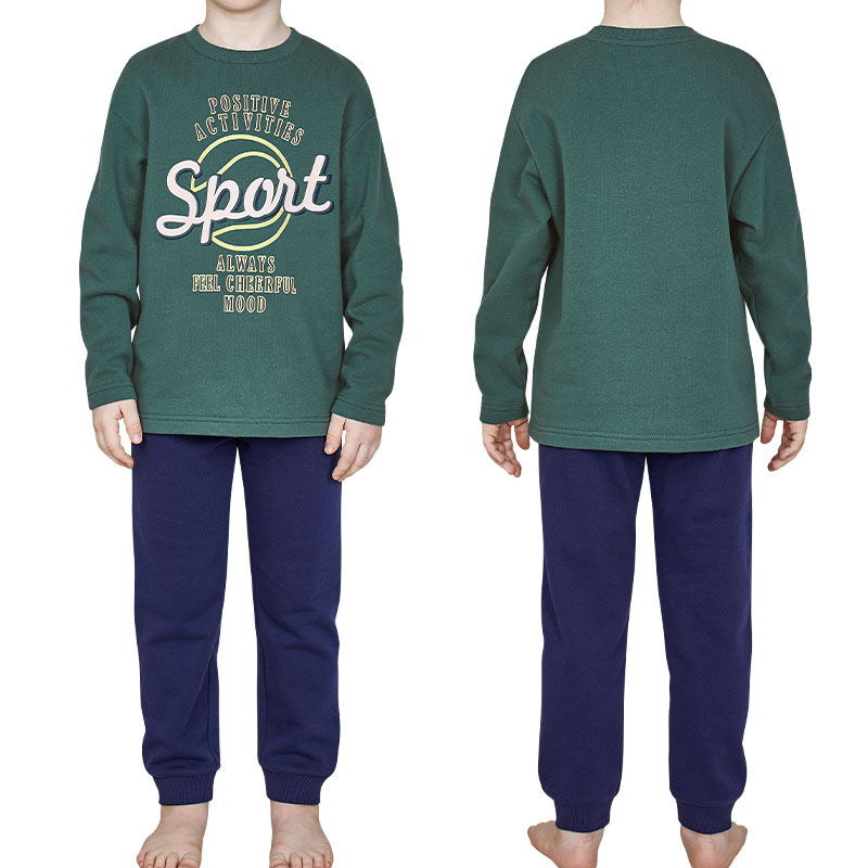 Состав: верх: 100%хлопок, низ: 100%хлопокОписание: Пижама детская для мальчика утепленная. Натуральный состав ткани из 100% хлопка (футер с начёсом) обеспечивает изделию мягкость, гипоаллергенность и воздухопроницаемость. Благодаря этому сон комфортный и качественный. В пижаме из хлопка ребёнку будет тепло, даже если он сбросит одеяло. Джемпер и брюки умеренного объёма, рукава широкие и свободные — комплект для сна очень удобен. В поясе и по низу брюк мягкая и широкая резинка — не перекручивается и не давит. Отделка горловины джемпера из эластичной рибаны — ребёнку удобно надевать и снимать пижаму. А также рибана сохраняет отличную форму надолго. Хлопковая пижама украшена стильным принтом в актуальной университетской эстетике, надписи переводятся: «позитивная деятельность», «спорт!», «всегда чувствуй себя хорошо». Детская пижама для мальчика неприхотлива в уходе. Принт эластичный и мягкий, без проблем переносит частые стирки. Детская пижама с брюками подходит для сна как дома, так и в детском саду — отличный выбор для вашего ребёнка! Помните о правильном уходе за изделием: рекомендуется стирать при температуре не выше 30 °C, без предварительного замачивания, с изнанки. Это поможет сохранить качество и цвет пижамы на длительное время. Не забывайте о выборе правильного размера. Используйте таблицу размеров на фотографии, чтобы выбрать подходящий вариант для вашего мальчика. Обратите внимание, что цвет товара на экране вашего устройства может отличаться от реального.