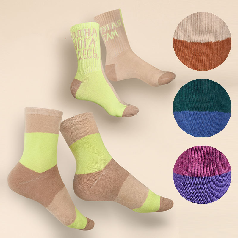 Охра/песочный(32/34),Джинс/зеленый(10/12),Фиолетовый/малиновый(46/25),Светло зеленый/песочный(60/34) Набор детских носков 2 штуки. Носочки выполнены из качественного хлопка, который пропускает воздух к ножке ребенка и позволяет коже дышать, без эффекта парника. Высокие носки нежно облегают ступню, а мягкая и комфортная резинка надежно удерживает изделие на месте, не позволяя носкам скатываться. Это важно для детей и подростков - не поправлять носки и ощущать только комфорт. Идеально сочетаются с любой обувью. Они порадуют не только детей, но и родителей - это очень прочные носки с картинками и высокой стойкостью к частым стиркам. Самые модные и удобные носки детские для ежедневного использования.