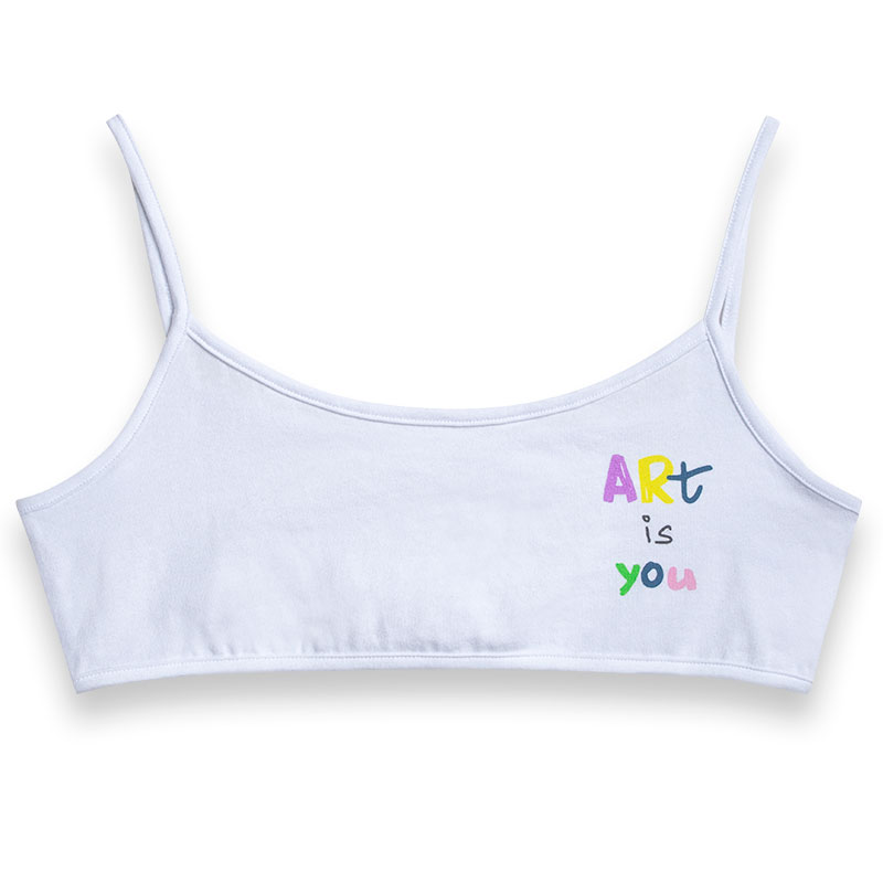 Белый(2) Если вы хотите купить своему ребёнку действительно качественное, красивое и комфортное нижнее бельё, представляем вам наш укороченный топ для девочки. Бра выполнено из ткани с высоким содержанием хлопка. Топ мягкий, воздухопроницаемое — кожа ребёнка отлично дышит. Эластан в составе ткани обеспечивает модели прекрасную форму на протяжении долгого времени. Благодаря качественному материалу и правильному крою детский топ идеально садится по телу и дарит ребёнку комфорт на протяжении всего дня. Тонкие мягкие бретели не сползают, исключают трение и раздражение. По низу и проймам окантовка из пайпинга в тон изделия, благодаря чему они не растягиваются. Модель белого цвета украшает небольшой принт по переду. Надпись переводится: "искусство — это". Принт мягкий и устойчивый, отлично переносит стирки. В линейке представлены следующие размеры: 7 (122): 8 (128): 9 (134): 10 (140): 11 (146). Кроп топ детский отлично подходит для носки под одеждой — идеальный выбор белья для девочки младшего школьного возраста и девочки-подростка. Топ можно носить круглый год: летом, весной и осенью (демисезон), зимой. Стильный топ — прекрасный подарок дочери, внучке или сестре на любой праздник. Выбирайте нужный размер по таблице размеров на фото. Цвет товара на экране вашего устройства может отличаться от цвета изделия вживую. Товар возврату и обмену не подлежит.