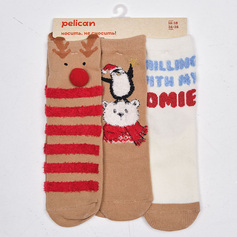 Бежевый/бежевый/молочный(3/3/28) Носки детские с рисунком, набор из 3 штук. Новогодние носки универсальны как для девочек, так и для мальчиков. Носки с принтом выполнены из качественного хлопка с добавлением эластана. Ткань пропускает воздух и обеспечивает комфорт для ножек ребенка. Материал прочный, устойчив к пилингу (образованию катышков). При многократной стирке модель не деформируется, не садится, резинка не теряет своих качеств, а пятка остается на месте. Носки для девочки облегают ступню. Мягкая, но надежная резинка отлично удерживает носки на месте. Это важно для комфорта ребенка. Такие детские носки не нужно будет постоянно поправлять, а значит не нужно будет отвлекаться от игр. Очень удобно сидят на ноге, это позволит надевать носочки с разной обувью. Носки для мальчика хорошо тянутся, например, если нужно заправить в них кальсоны или брючины для сохранения тепла. Яркие, милые носочки дополнят образ и станут стильным аксессуаром для уютных семейных фотосессий. Эти носки можно надевать не только в повседневной жизни или дома, но и сочетать их с праздничными нарядами. Набор носков для детей идеальный подарок ребенку.