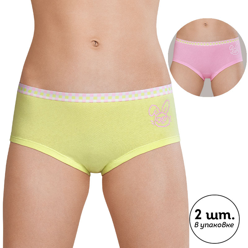 Светло-розовый/салатовый(58/38) Комплект трусов для девочки из 2-х шт. Шорты выполнены из ткани с высоким содержанием хлопка, что обеспечивает им мягкость, гипоаллергенность и прекрасную воздухопроницаемость. Благодаря эластану шорты трусы в течение длительного времени сохраняют первозданную форму. Качественный материал и грамотный крой обеспечивают идеальную посадку белья на теле. Мягкая резинка исключает раздражение и трение. В комплект входят трусы детские для девочки двух трендовых оттенков. Нежные и по-настоящему красивые, эти цвета обязательно придутся по душе любой девочке. Трусики для девочки по переду украшены забавным принтом в виде зайчика в очках. Резинка трусов также декорирована милым принтом в клетку. Принты эластичные и стойкие, отлично переносят частые стирки. Хлопковые трусы подходят девочкам младшего школьного возраста и девочкам-подросткам. Помните о правильном уходе за изделием: рекомендуется стирать при температуре не выше 30 °C, без предварительного замачивания, с изнанки. Это поможет сохранить качество и цвет белья на длительное время. Не забывайте о выборе правильного размера. Используйте таблицу размеров на фотографии, чтобы выбрать подходящий вариант для вашей девочки. Обратите внимание, что цвет товара на экране вашего устройства может отличаться от реального.