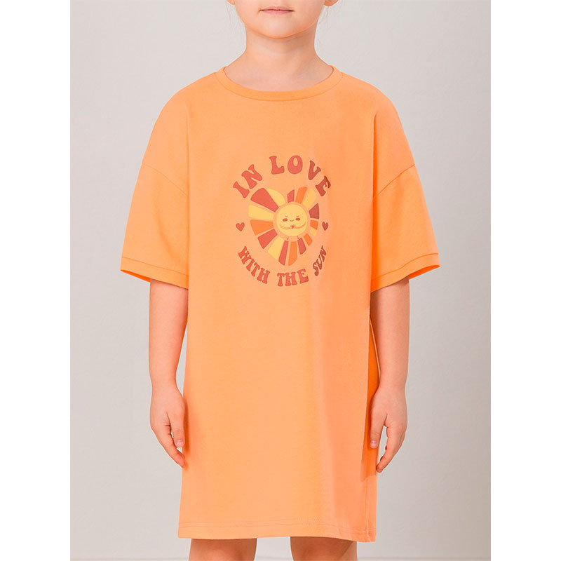 Оранжевый(31) Детская ночная сорочка для девочек из 100% хлопка. Можно носить как домашнее платье. Платье силуэта оверсайз, объемное, со спущенным широким рукавом. Свободный крой, удлиненные рукава – комфорт и легкость движений. Принт спереди настраивает на позитив и лето.