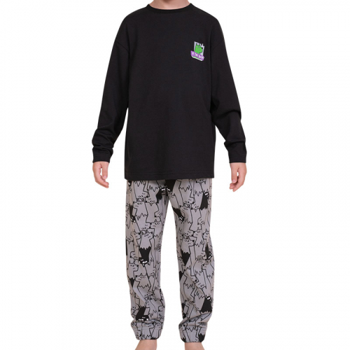 Состав: верх: 100%хлопок, низ: 100%хлопокОписание: Стильная и уютная пижама для мальчика. В составе ткани 100% хлопка — идеально для детской одежды! Модель приятна на ощупь, прекрасно пропускает воздух, позволяя коже ребёнка дышать. При этом в пижаме из хлопка ребёнку будет тепло, даже если он сбросит одеяло. Всё это обеспечивает комфортный и качественный сон. Джемпер и брюки среднего объёма, плечо немного спущено, рукава широкие и свободные — пижама на мальчика очень удобна для сна. Широкие и мягкие резинки в поясе и по низу брюк не перекручиваются и не давят. Отделка горловины из эластичной рибаны — она не растягивается, ребёнку удобно надевать и снимать пижаму. Брюки декорированы сплошным принтом с забавными собаками, будто нарисованными от руки. Джемпер чёрного цвета украшает забавный принт в виде зелёной собаки и надписи "я так вижу". В линейке представлены следующие размеры: 2 (92): 3 (98): 4 (104): 5 (110): 6 (116): 7 (122): 8 (128): 9 (134): 10 (140): 11 (146). Хлопковый комплект идеален для сна как дома, так и в детском саду — прекрасный выбор для вашего ребёнка! Пижама с брюками подходит для круглогодичного использования. Домашний комплект — замечательный подарок сыну, внуку, брату на любой праздник. Выбирайте нужный размер по таблице размеров на фото. Цвет товара на экране вашего устройства может отличаться от цвета изделия вживую.