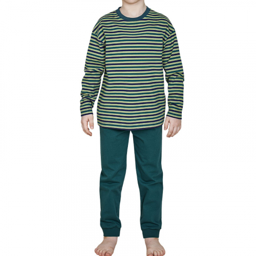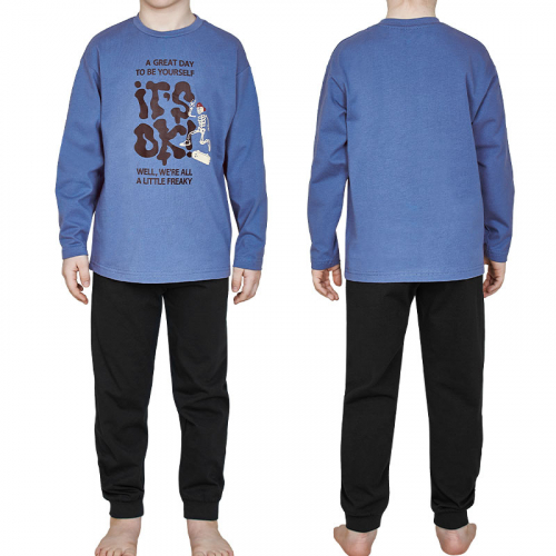 Состав: верх: 100%хлопок, низ: 100%хлопокОписание: Пижама детская для мальчика. Натуральный состав ткани (100% хлопка) обеспечивает изделию мягкость, гипоаллергенность и воздухопроницаемость. Благодаря этому сон комфортный и качественный. В пижаме из хлопка ребёнку будет тепло, даже если он сбросит одеяло. Джемпер и брюки умеренного объёма, рукава широкие и свободные — комплект для сна очень удобен. В поясе и по низу брюк мягкая и широкая резинка — не перекручивается и не давит. Отделка горловины джемпера из эластичной рибаны — ребёнку удобно надевать и снимать пижаму. А также рибана сохраняет отличную форму надолго. Хлопковая пижама украшена забавным принтом, надписи переводятся: «найди меня», «новый мир», «будущее за тобой». Фишка модели — принт светится в темноте! Такая особенность непременно понравится любому ребёнку. Детская пижама для мальчика неприхотлива в уходе. Принт эластичный и мягкий, легко переносит частые стирки. Детская пижама с брюками подходит для сна как дома, так и в детском саду — отличный выбор для вашего ребёнка! Помните о правильном уходе за изделием: рекомендуется стирать при температуре не выше 30 °C, без предварительного замачивания, с изнанки. Это поможет сохранить качество и цвет пижамы на длительное время. Не забывайте о выборе правильного размера. Используйте таблицу размеров на фотографии, чтобы выбрать подходящий вариант для вашего мальчика. Обратите внимание, что цвет товара на экране вашего устройства может отличаться от реального.