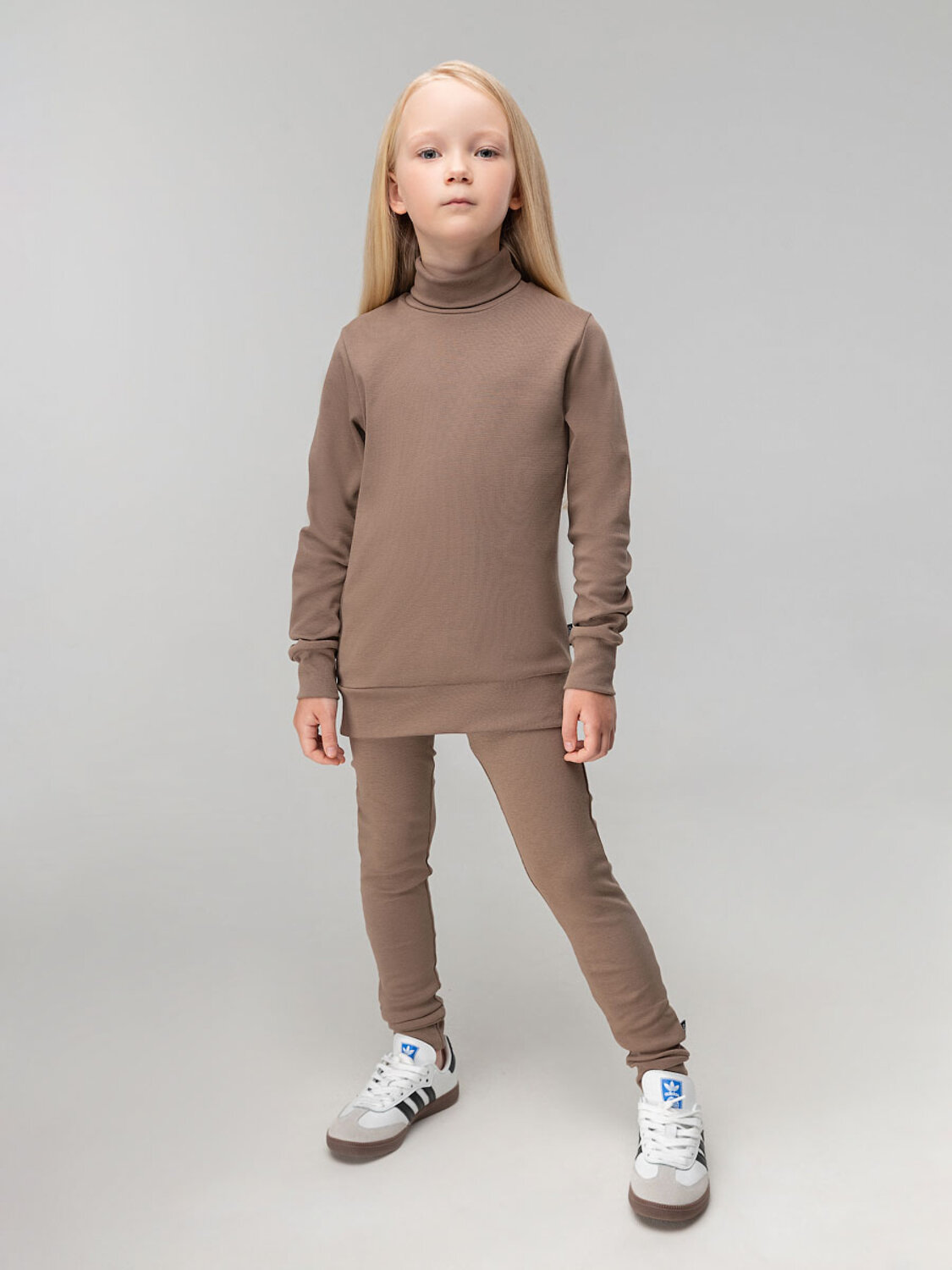 Детский костюм. Водолазка с воротником-стойка, рукава на манжетах, полуприлегающий покрой. Леггинсы. Детали: прилегающий покрой, пояс - эластичная резинка, зауженный низ, без застежек, без карманов. Состав:рибана 92% хлопок 8% лайкра