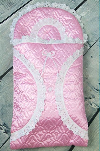 Красивый конверт на выписку для новорожденных с верхом из шелковистого креп-сатина со стёжкой ультрастеп, застегивается на молнии по бокам. Подкладка из ситца (плотность 65 гр/м²- ткань тонкая разреженная).
