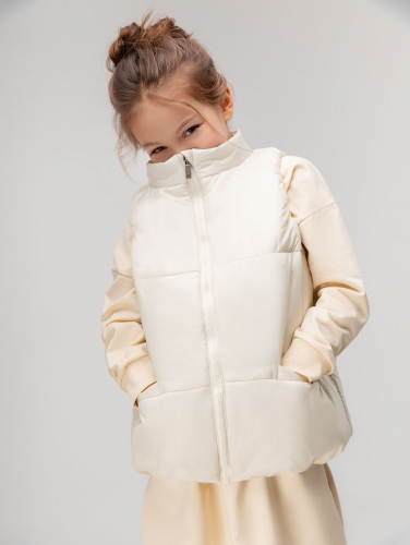 Демисезонный, утепленный жилет без капюшона. Воротник стойка. На полочке расположены карманы. Материал жилета имеет специальное водонепроницаемое и водоотталкивающее покрытие и пропитку, защищает от дождя, влаги и ветра.