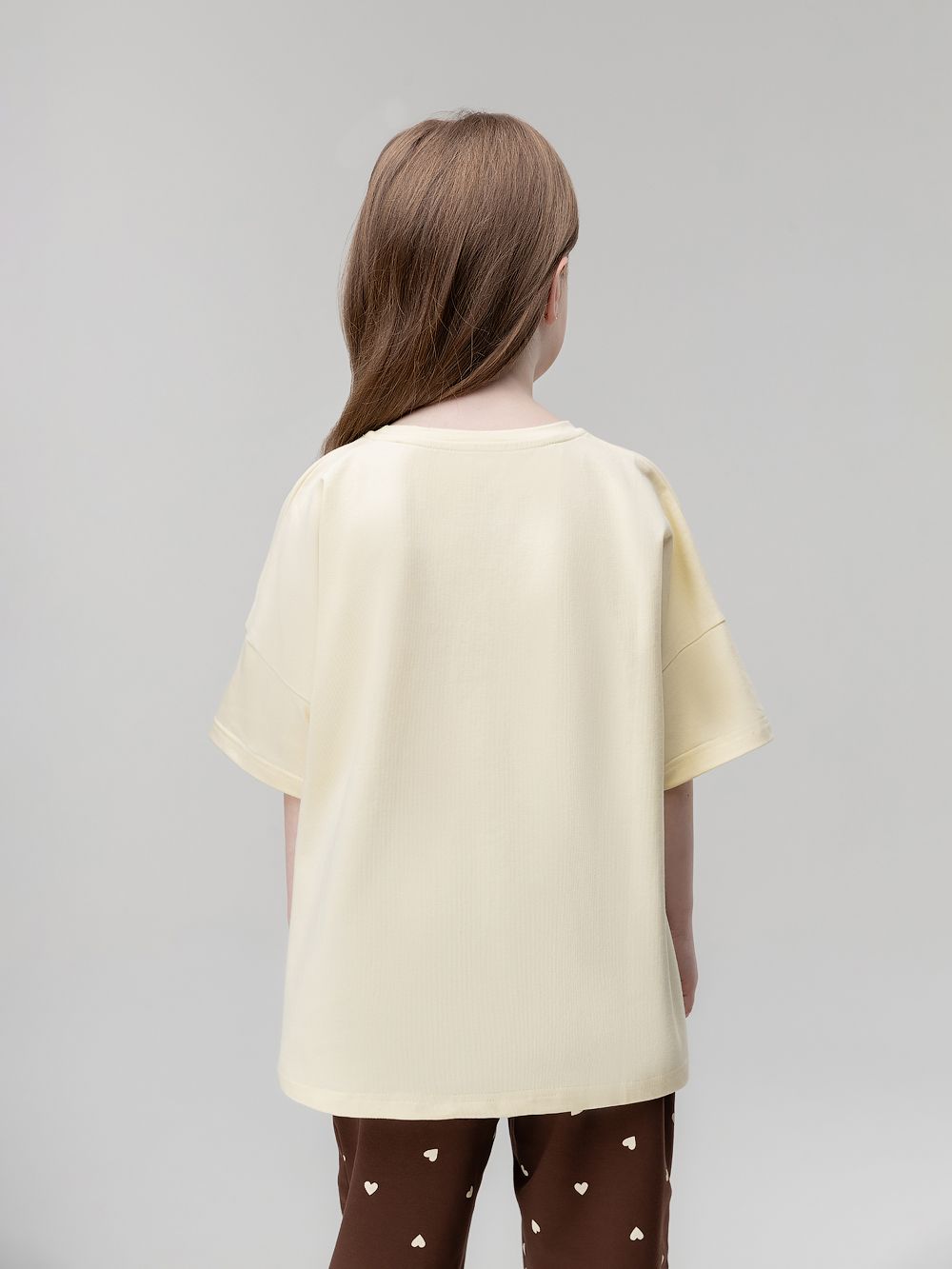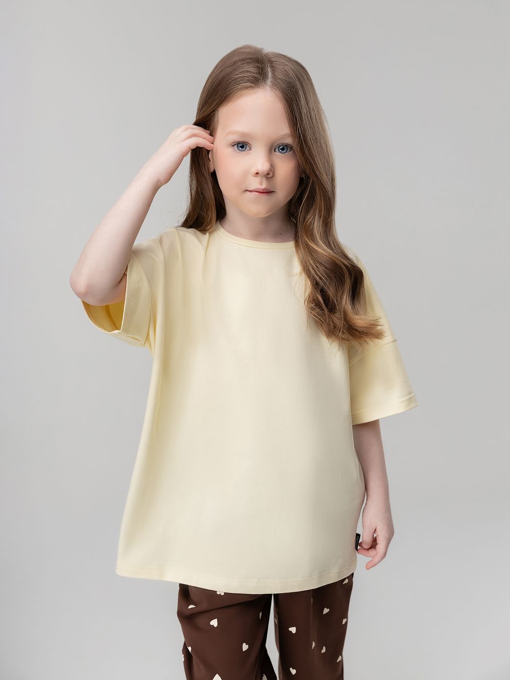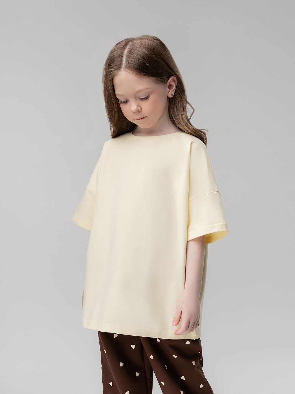 Футболка оверсайз со спущенным рукавом, округлый вырез горловины.