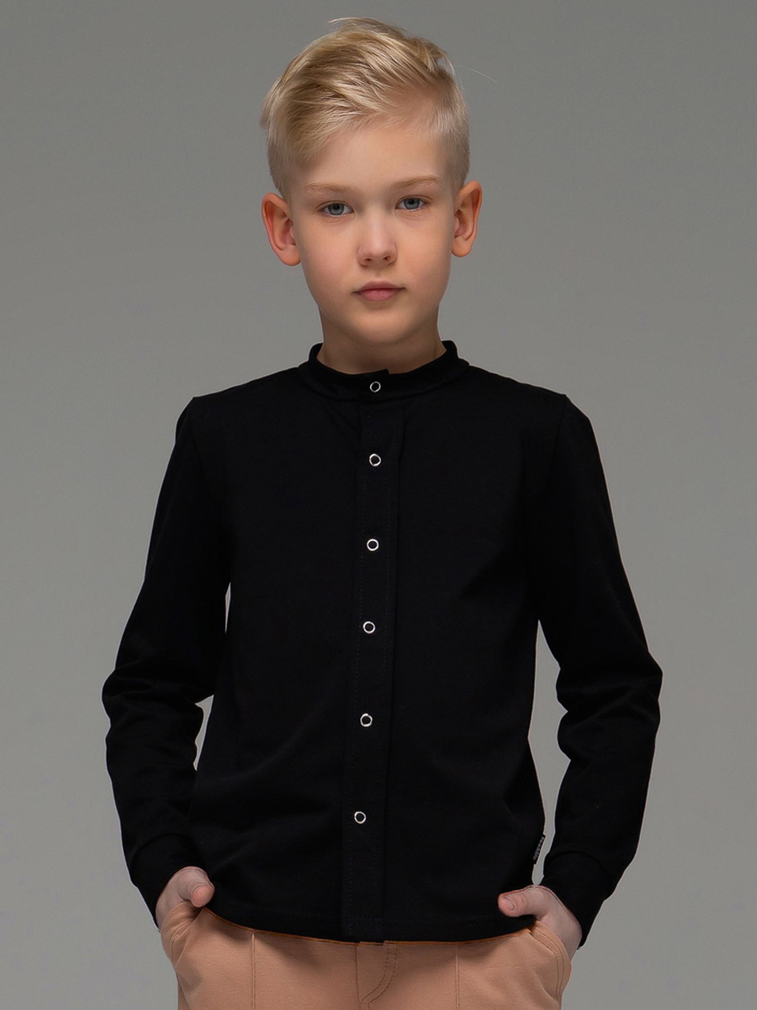 Рубашка из кулирки черного цвета полуприлегающего силуэта с центральной застежкой на кнопки, воротником- стойкой и длинными рукавами идеально подходит для школьной формы или для особых случаев. Длинные рукава с манжетами обеспечивают тепло и комфорт в холодное время года. Воротник-стойка придает изделию элегантный вид. Застежка на кнопки обеспечивает легкость и удобство в использовании. Рубашка отлично сочетается с брюками или джинсами, создавая великолепный стильный образ.