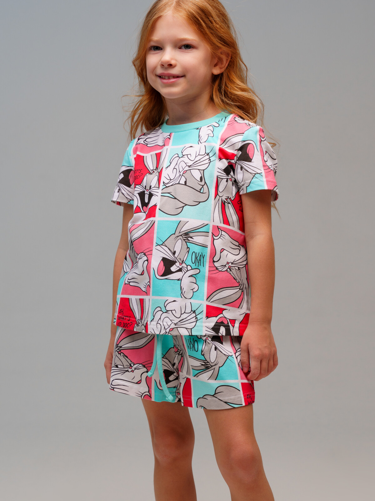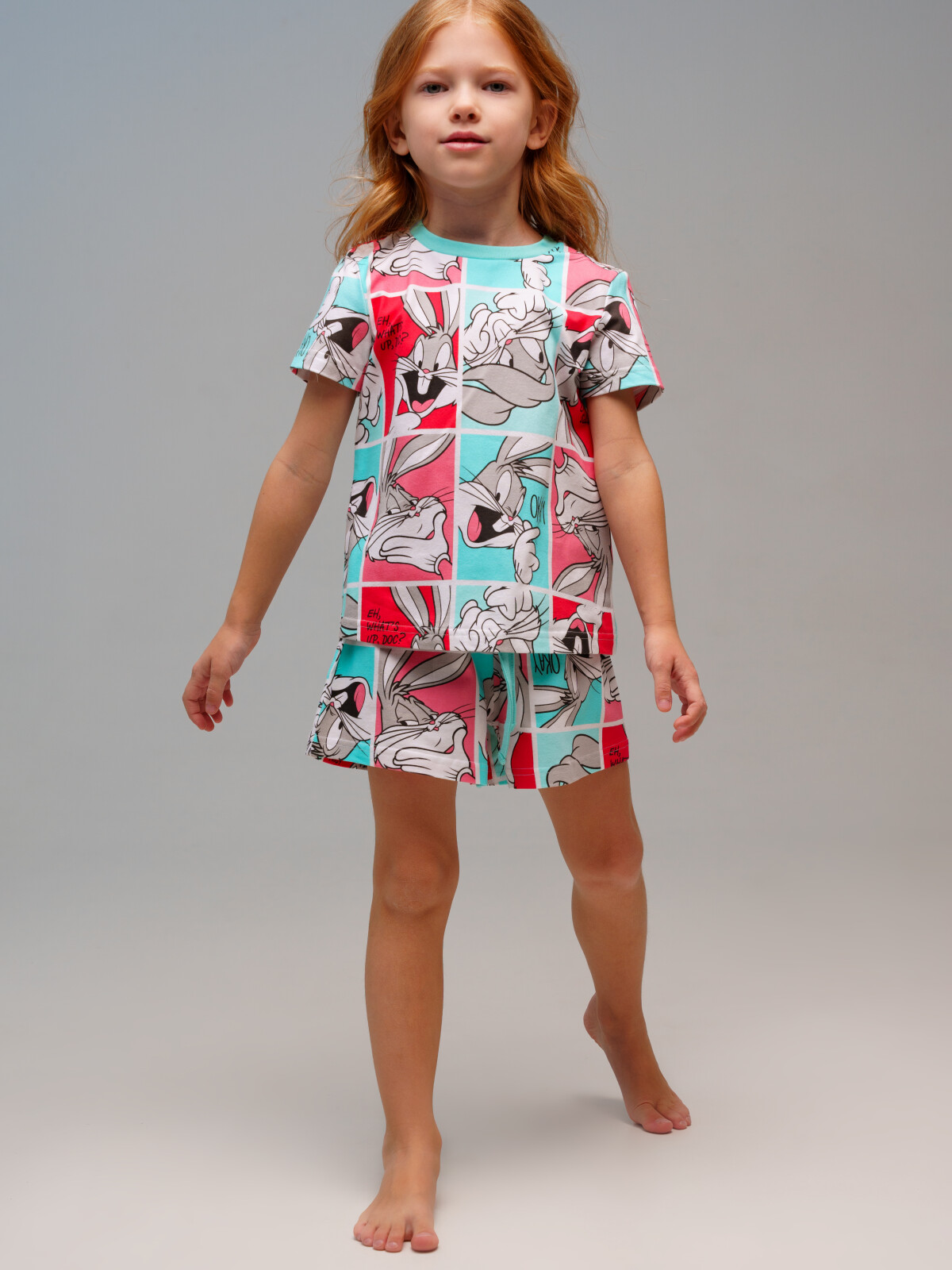 Пижама детская для девочки. Футболка и шорты из эластичного и приятного на ощупь трикотажа. Шорты на резинке со шнурком. Высокое содержание хлопка 95%. Благодаря наличию эластана в составе ткани изделие держит форму и меньше мнется.